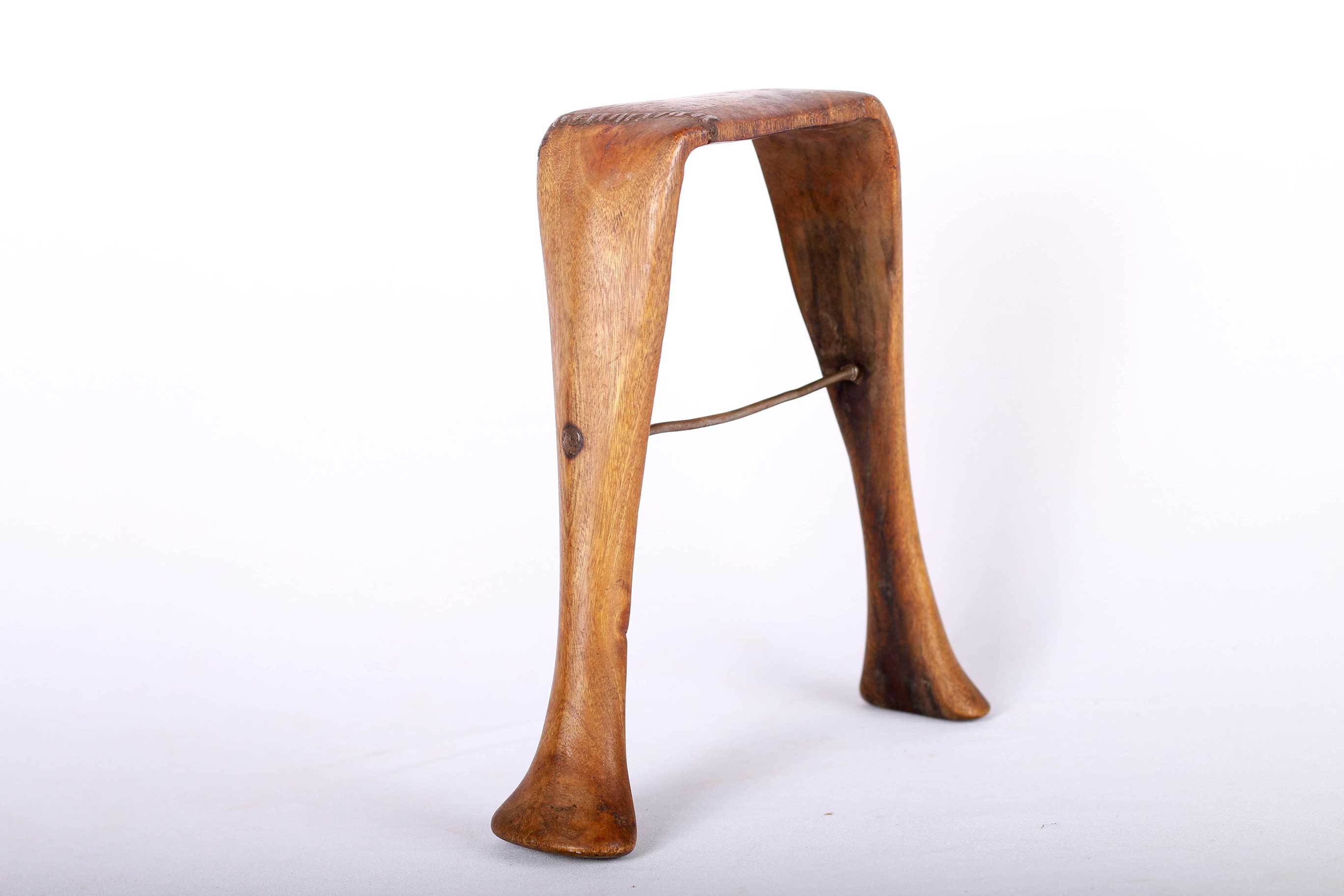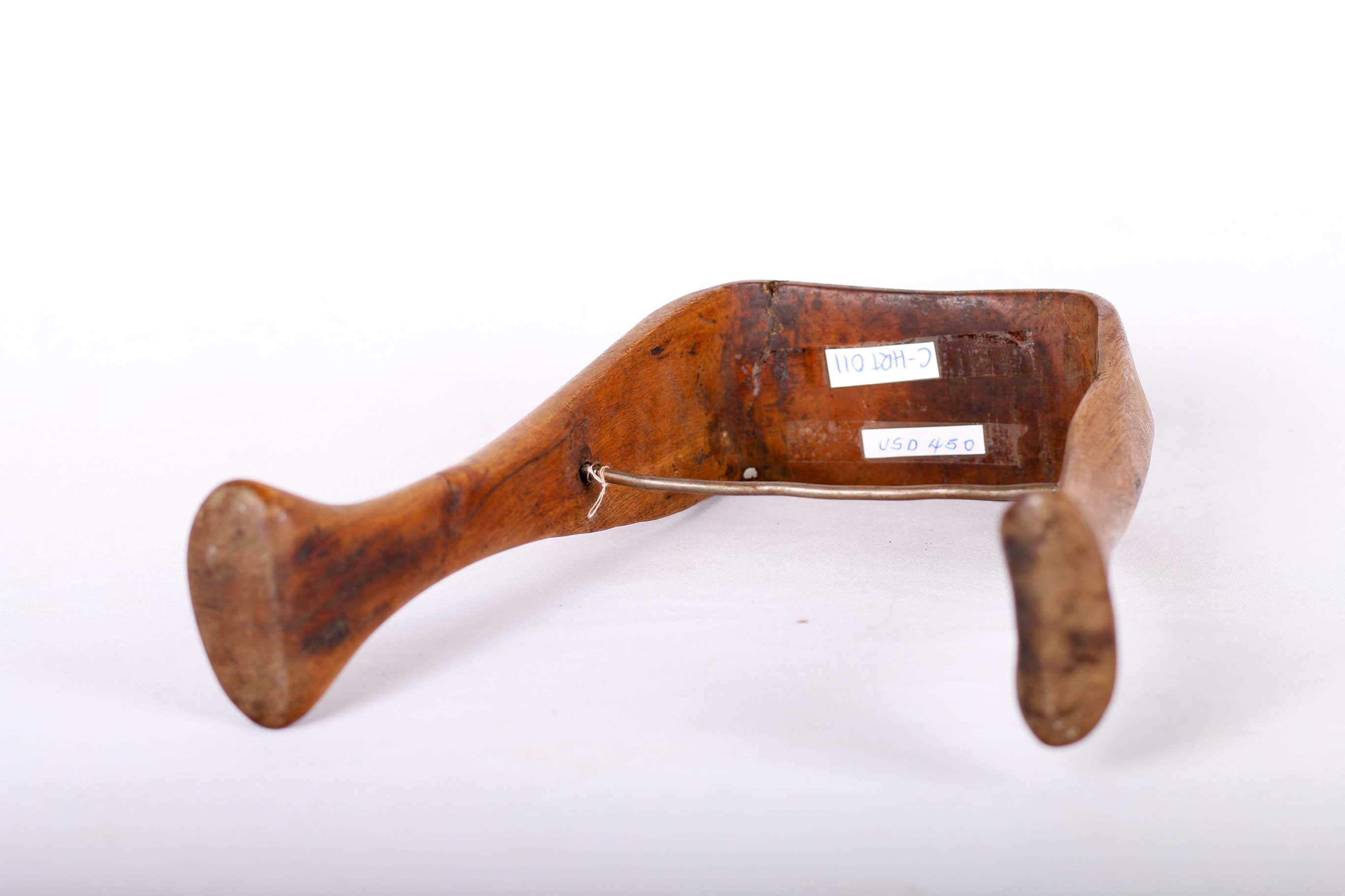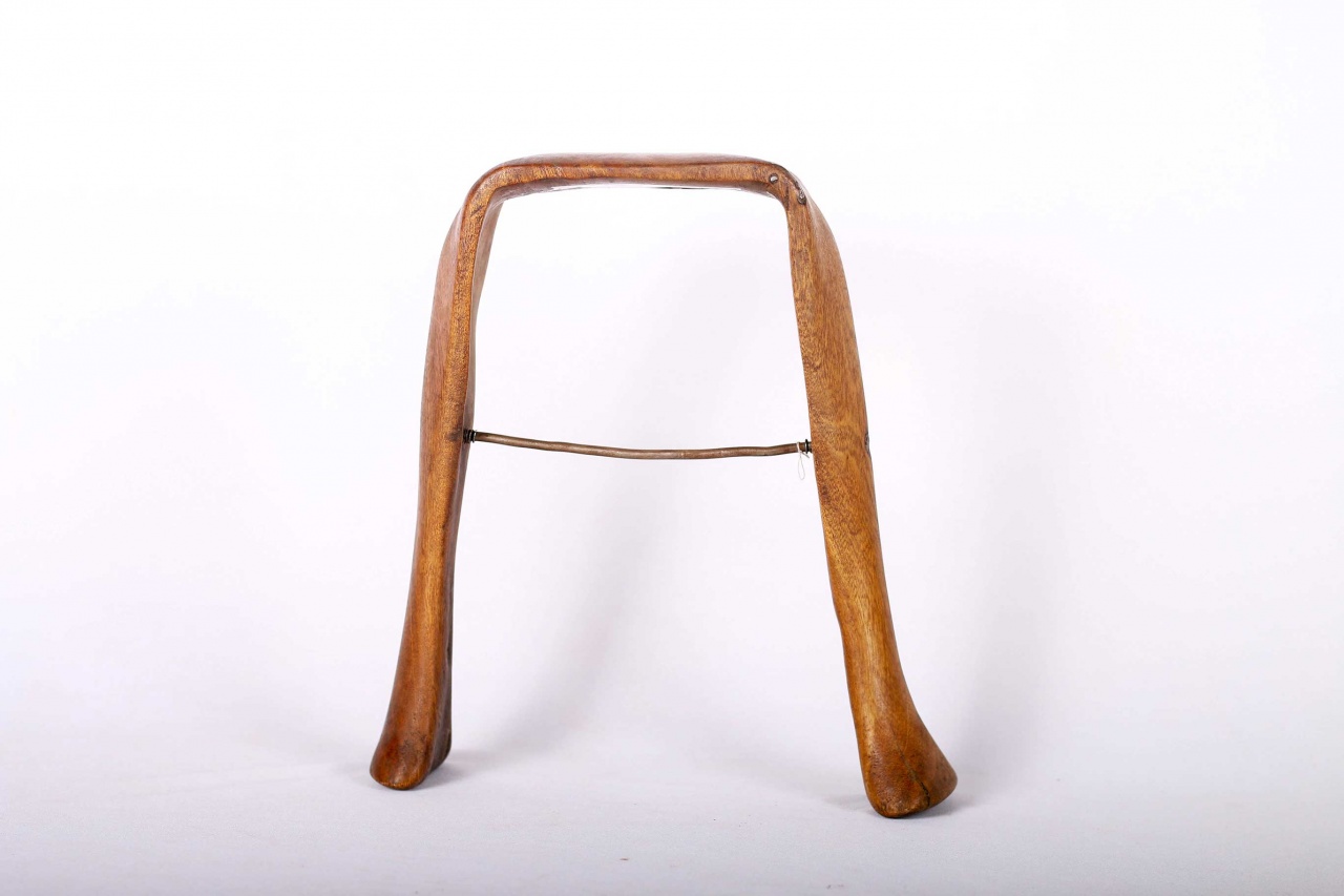 This is an A-shaped headrest from the Karamajong, an ethnic group of agro-pastoral herders living mainly in north-eastern Uganda. Headrests appear like simple pieces of craftmanship but they are of aesthetic value. They possess significance value and they have artistic status, they mean more than just mere objects. These pillow-like objects are some of the most distinctive East African articrafts. Headrests symbolized high social status or magical power such as the gift of foretelling. Headrests are also traditionally believed to protect elaborated headdresses, headrests are no longer a feature of modern life in this region.