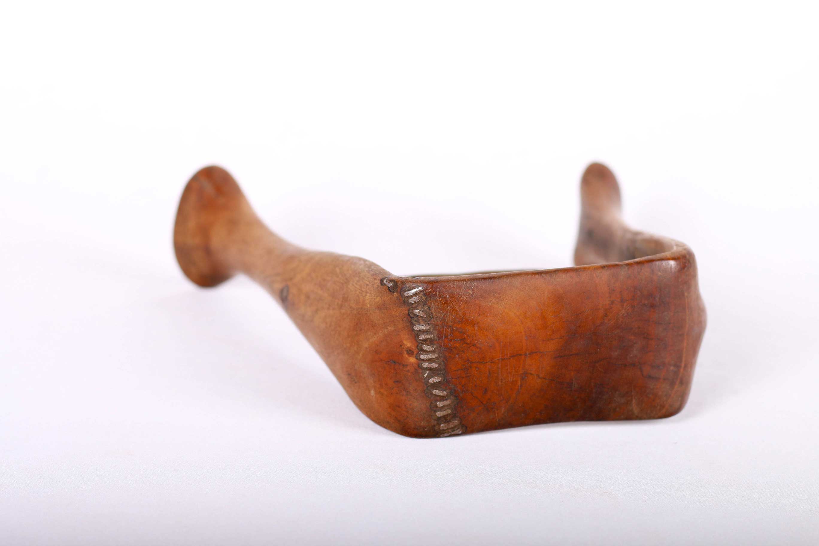 This fine headrest is a result of hard work and skill with its superb vertical A-shape. It is also known as a tied headrest because it is gradually tightened with a piece of iron to prevent the legs from splitting until the desired shape is obtained. It was carved in a single piece of wood, decorated with iron spots on the sides. and could only be owned by an elder aged over 50 years. Such pieces were also paid as dowry by a groom to his bride’s family as a demonstration of respect. This piece could also be inherited by only a man, possibly a brother or elder son of the deceased. Its design is similar to those of Pokot as a result of intermingling. It has a brown wonderful patina, clear signs of usage and old age.