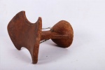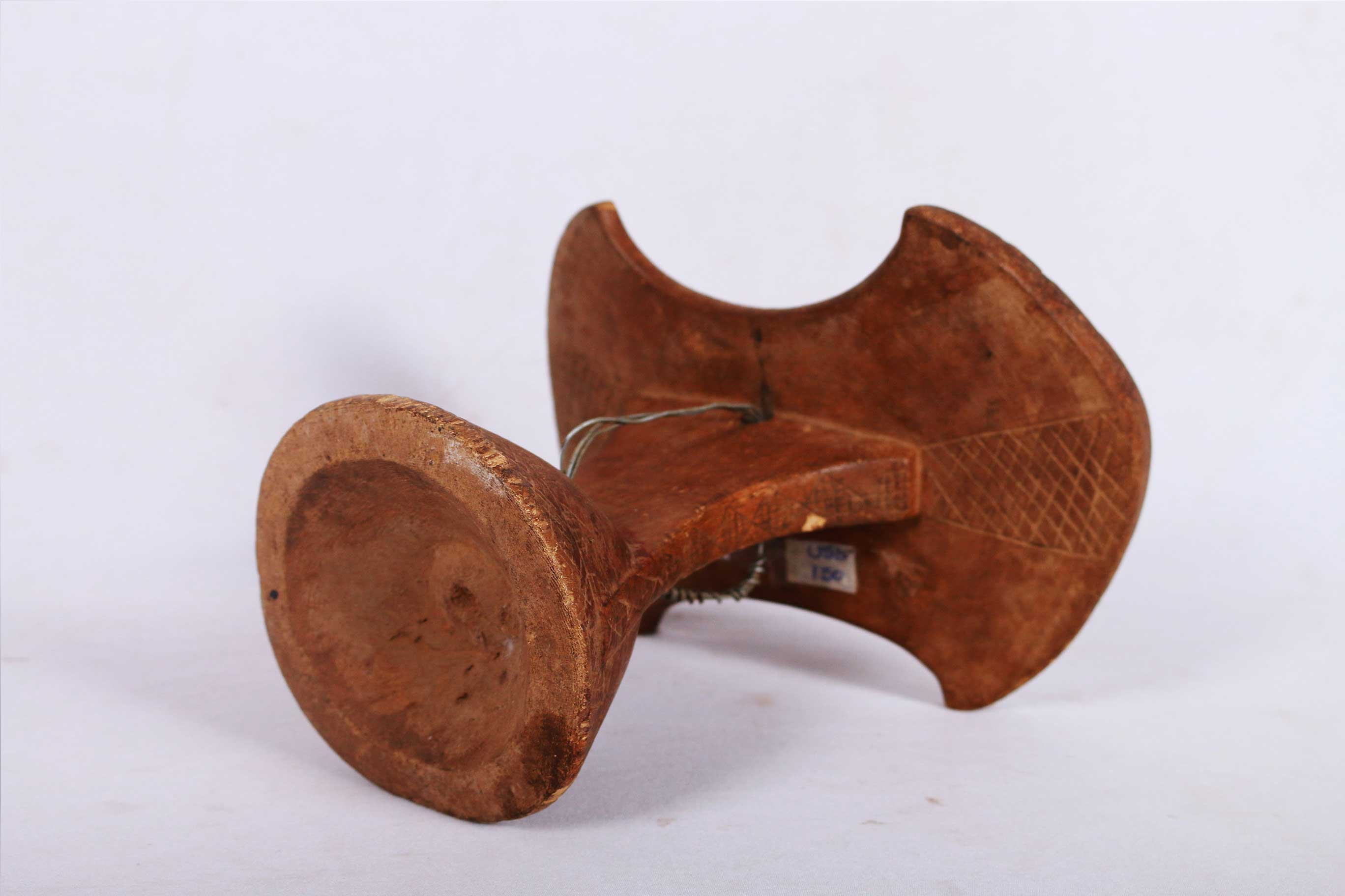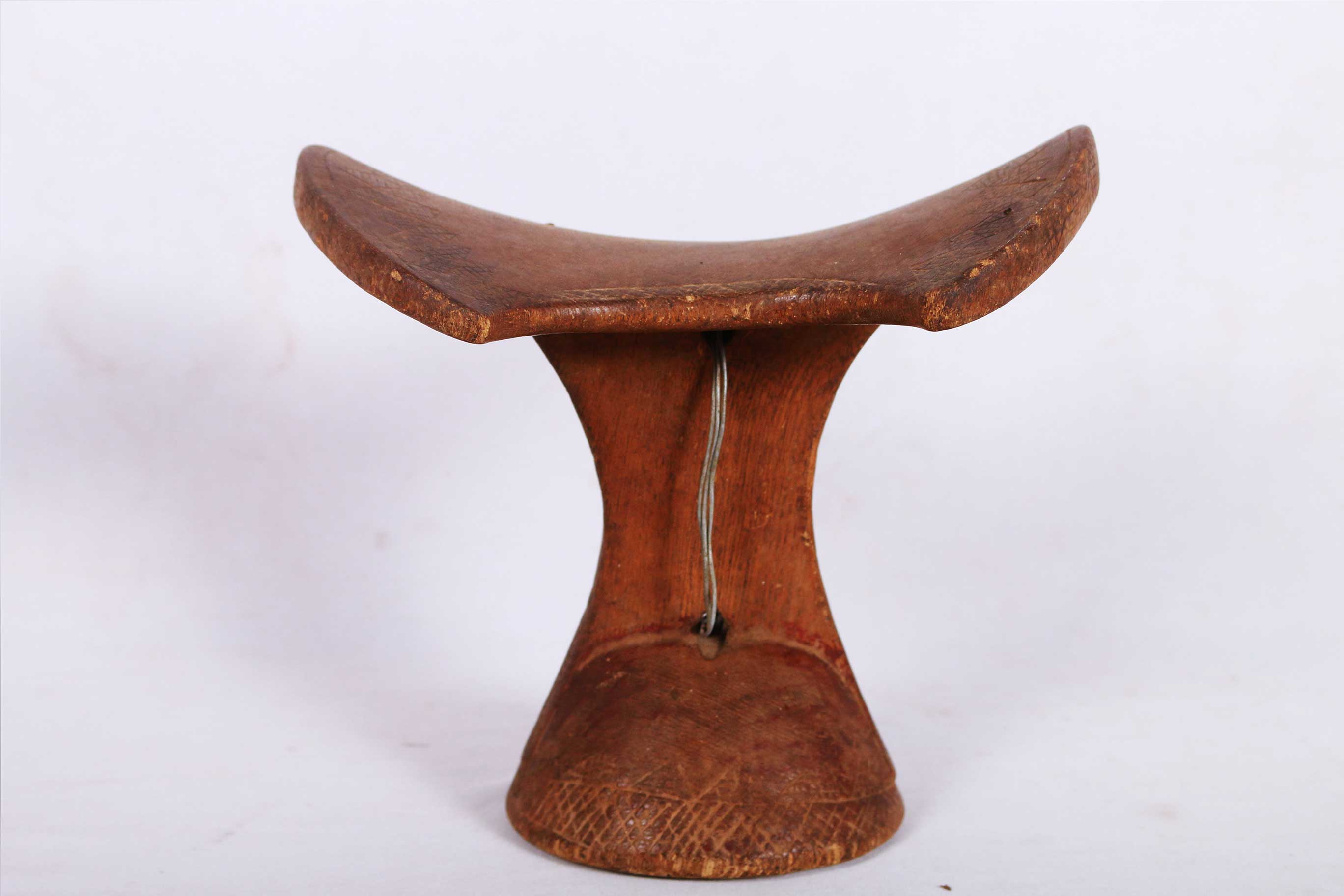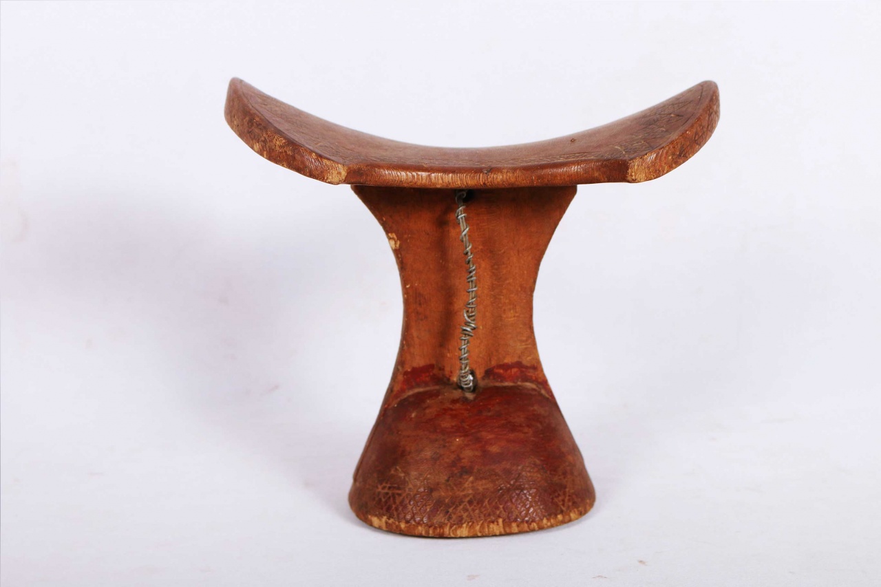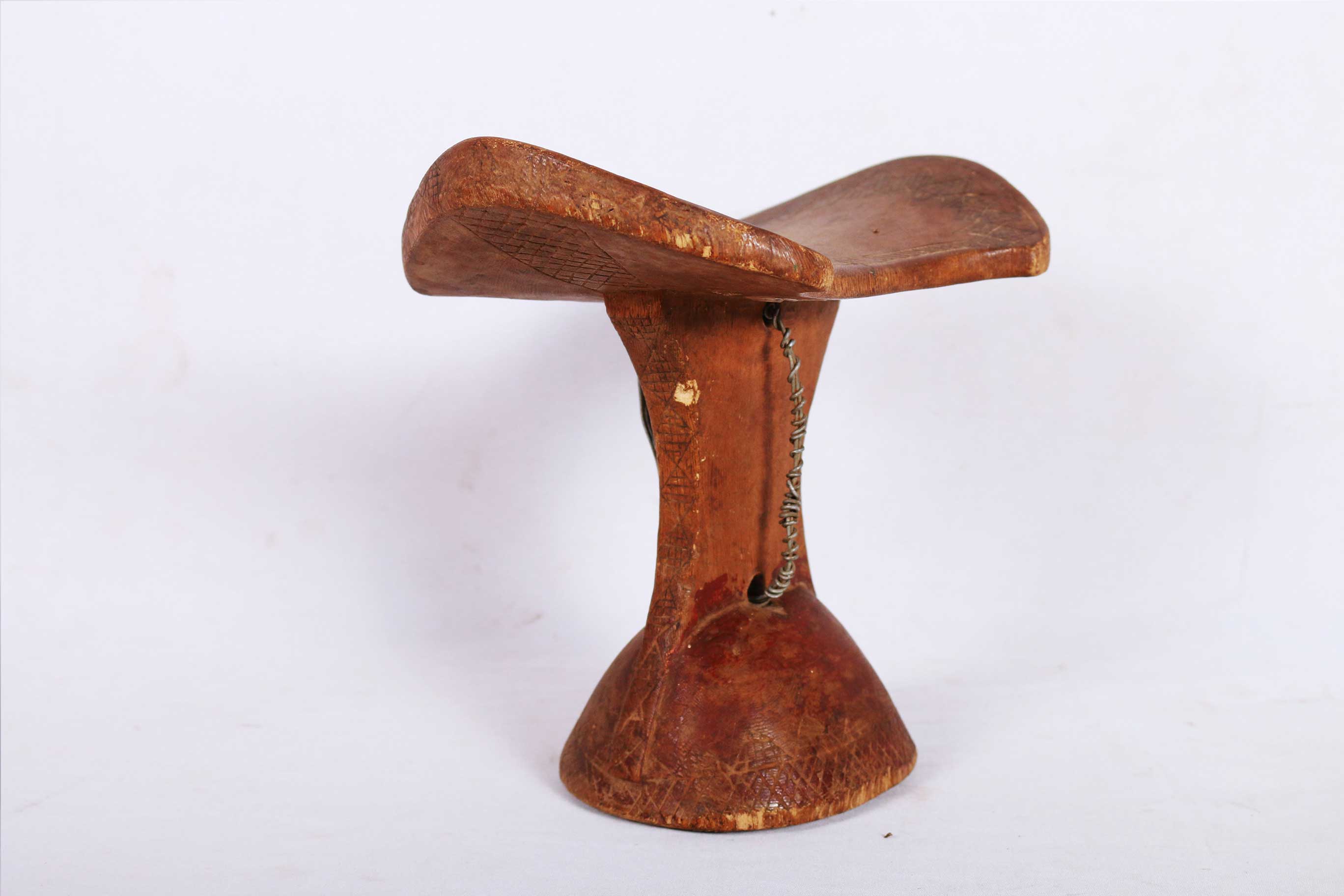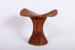 This is a T-shaped headrest from the Karamajong, an ethnic group of agro-pastoral herders living mainly in north-eastern Uganda. Headrests appear like simple pieces of craftmanship but they are of aesthetic value. They possess significance value and they have artistic status, they mean more than just mere objects. These pillow-like objects are some of the most distinctive East African articrafts. Headrests symbolized high social status or magical power such as the gift of foretelling. Headrests are also traditionally believed to protect elaborated headdresses, headrests are no longer a feature of modern life in this region.