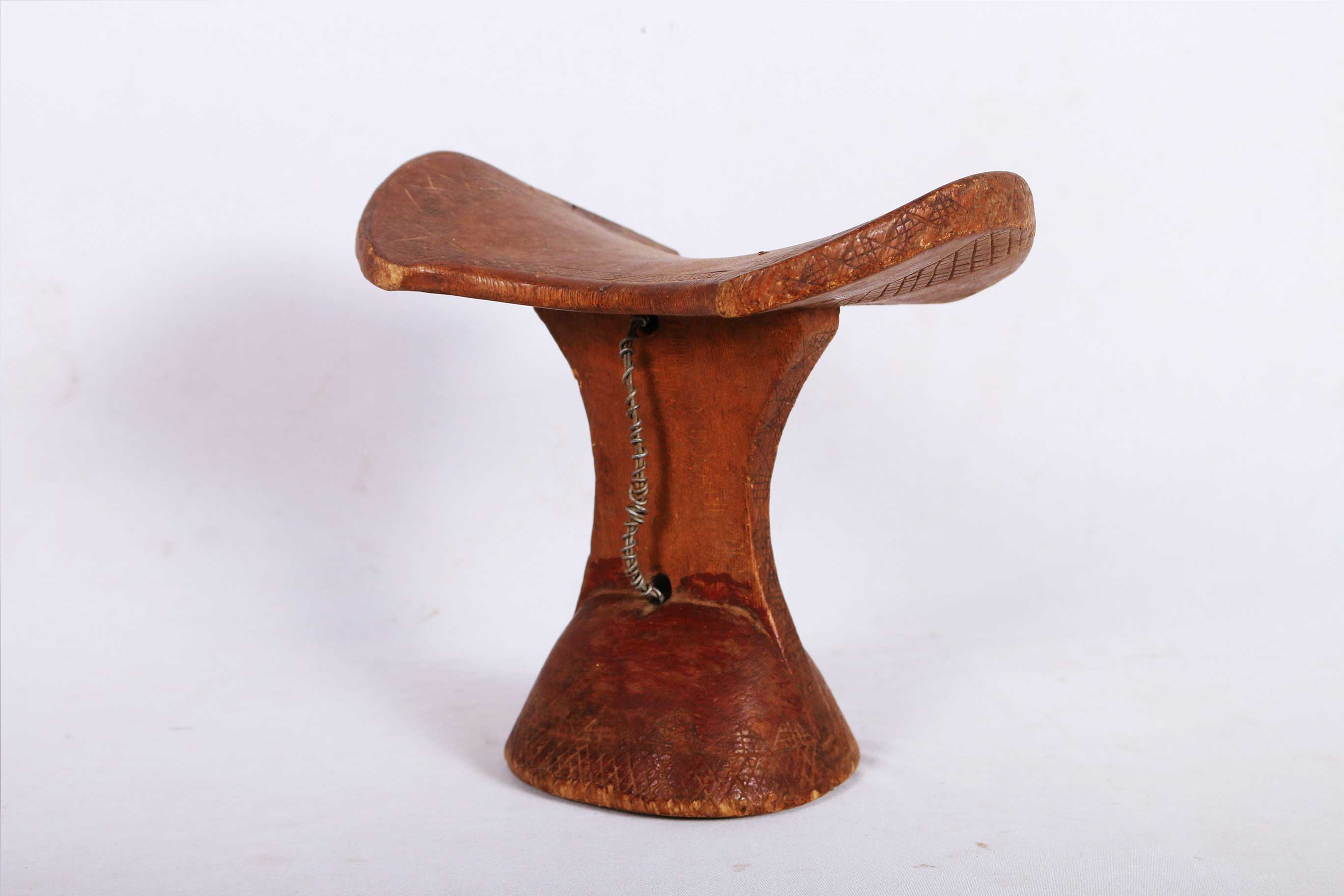 This particular headrest was the property of a highly ranked individual. It can only be used by a man from the elite class. Its design is similar to those of Pokot and Turkana as a result of intermingling. This headrest has a conical base, a single column, and a slightly curved upper surface. It’s decorated with an elegant leather handle and a brown wonderful patina. It is old with visible signs of old age and frequent usage.