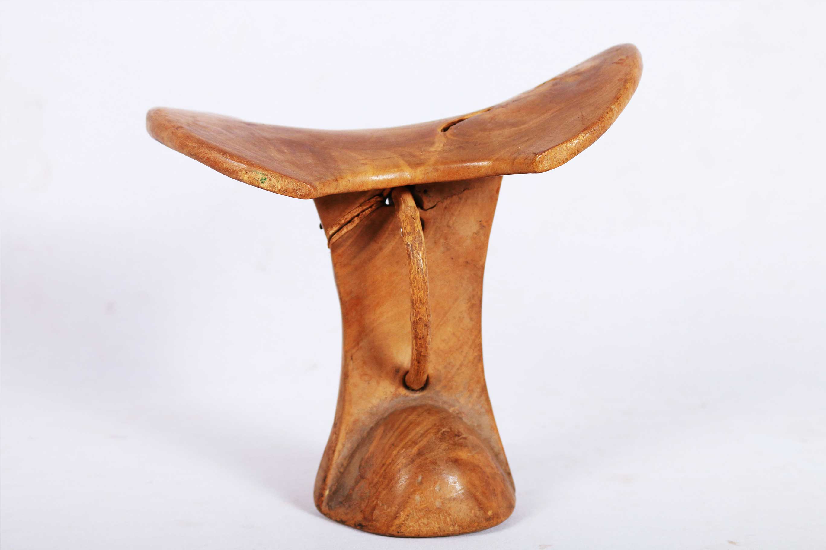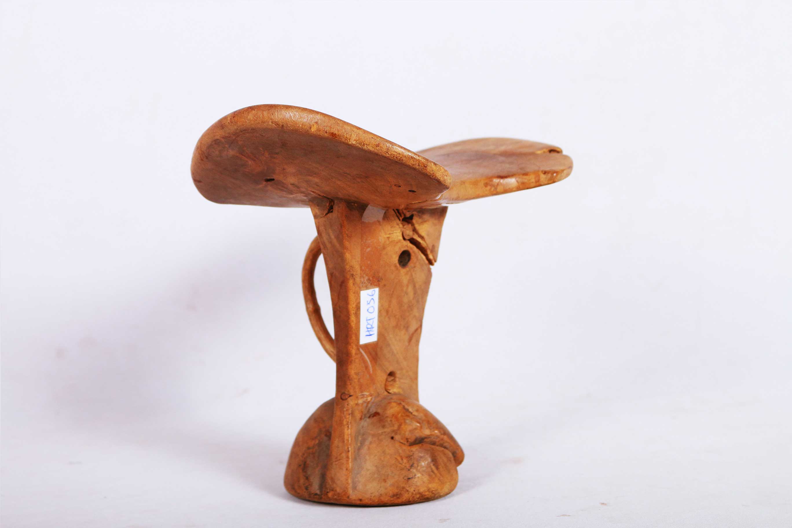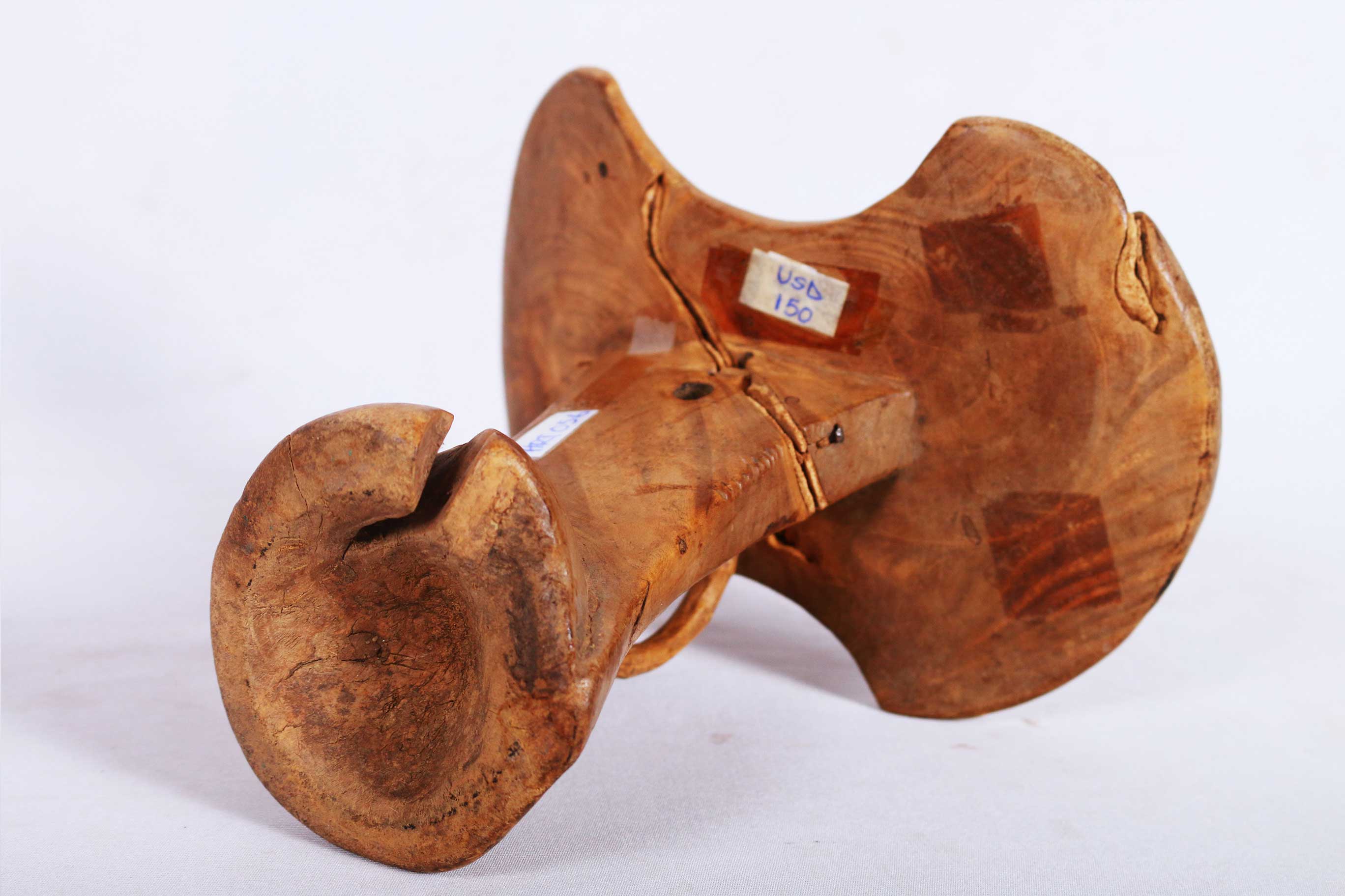 This is a T-shaped headrest from the Karamajong, an ethnic group of agro-pastoral herders living mainly in north-eastern Uganda. Headrests appear like simple pieces of craftmanship but they are of aesthetic value. They possess significance value and they have artistic status, they mean more than just mere objects. These pillow-like objects are some of the most distinctive East African articrafts. Headrests symbolized high social status or magical power such as the gift of foretelling. Headrests are also traditionally believed to protect elaborated headdresses, headrests are no longer a feature of modern life in this region.