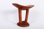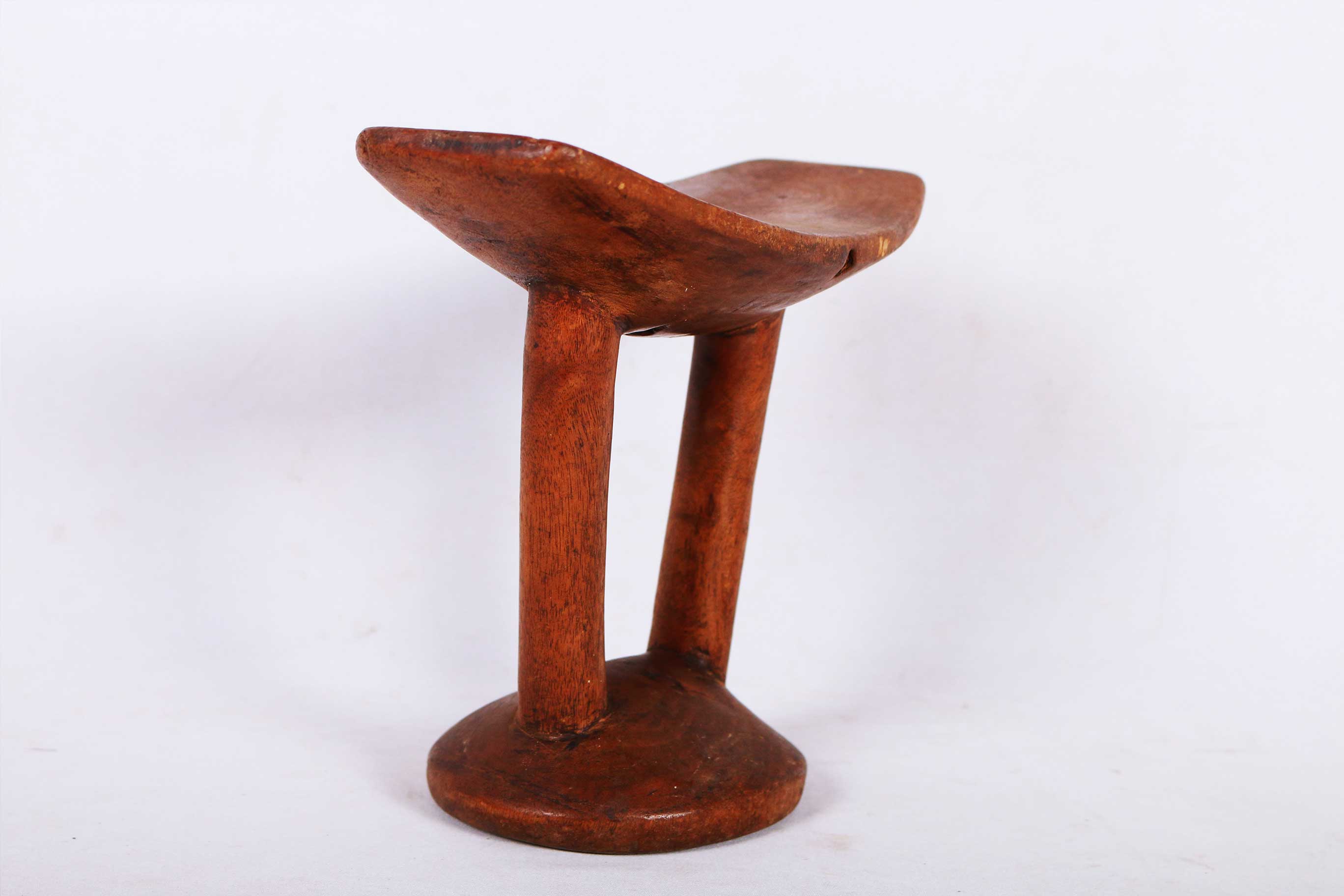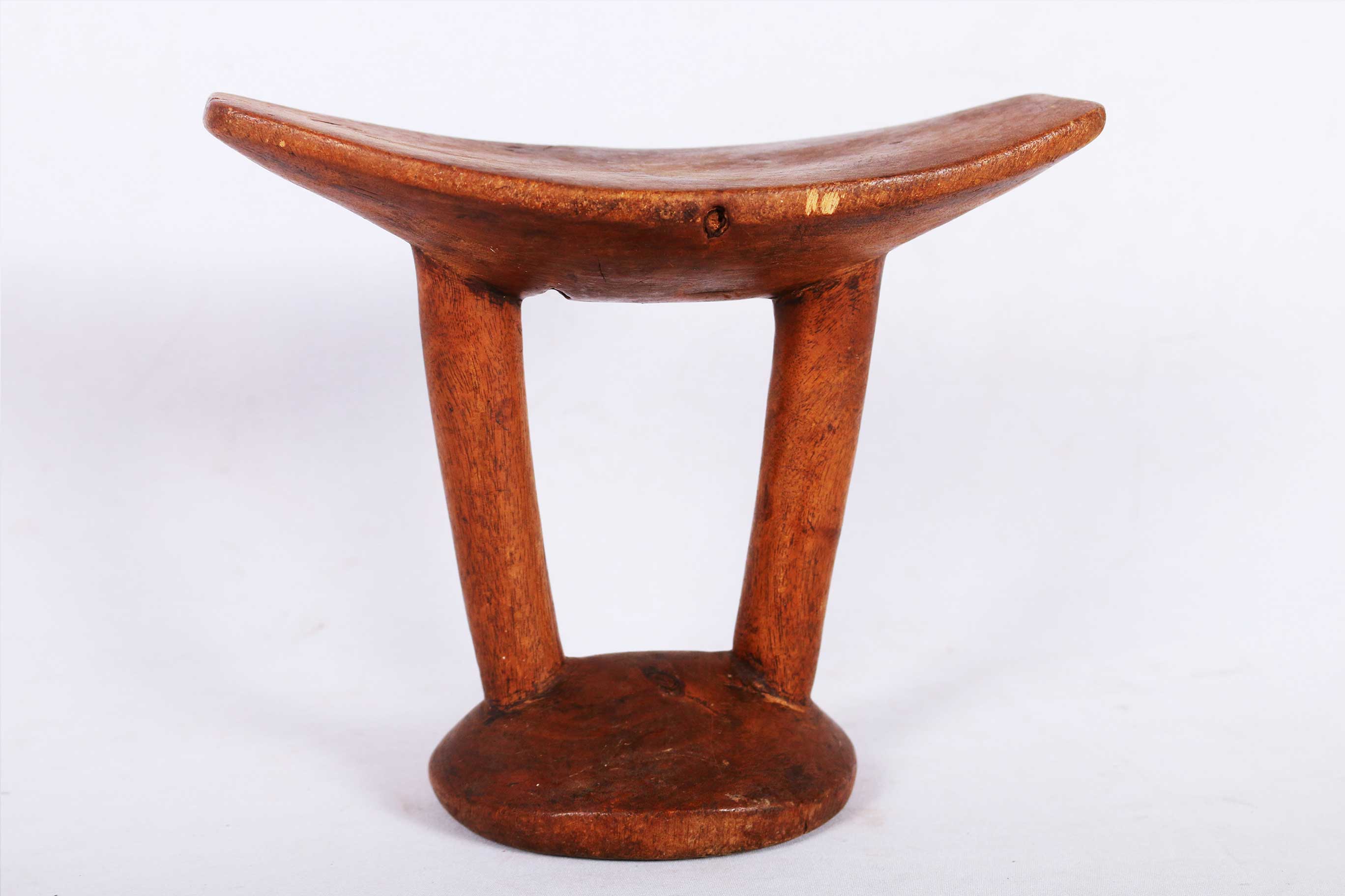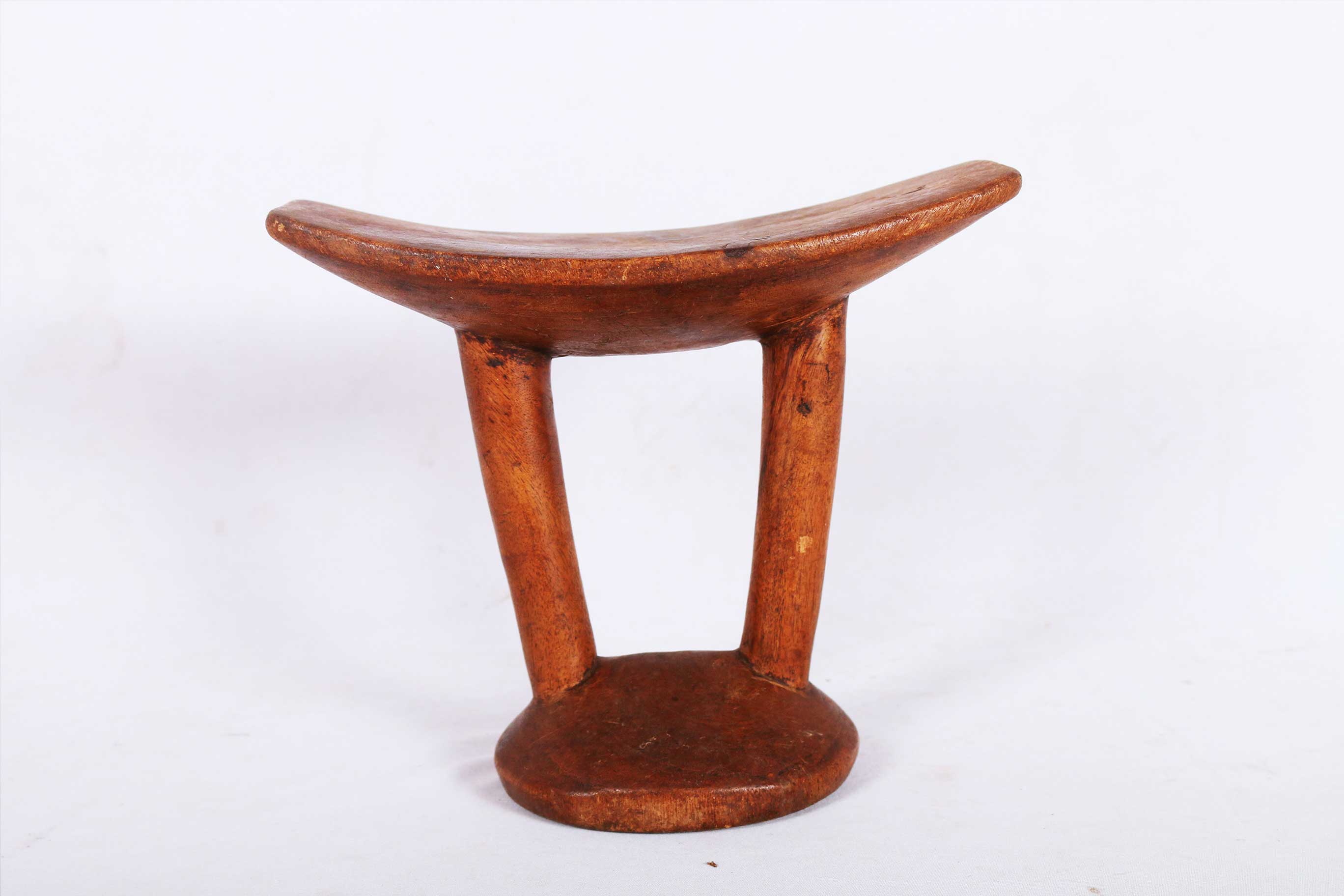 This particular headrest was a symbol of blessing. Offered by a male elder to a young pregnant woman to encourage successful birth or initiation. It was also used at home and at ceremonies too. This piece was carved from a single chunk of wood. It has a curved platform resting on two columns linked to a round base. It has a brown patina, signs of frequent usage and old age but in good condition.