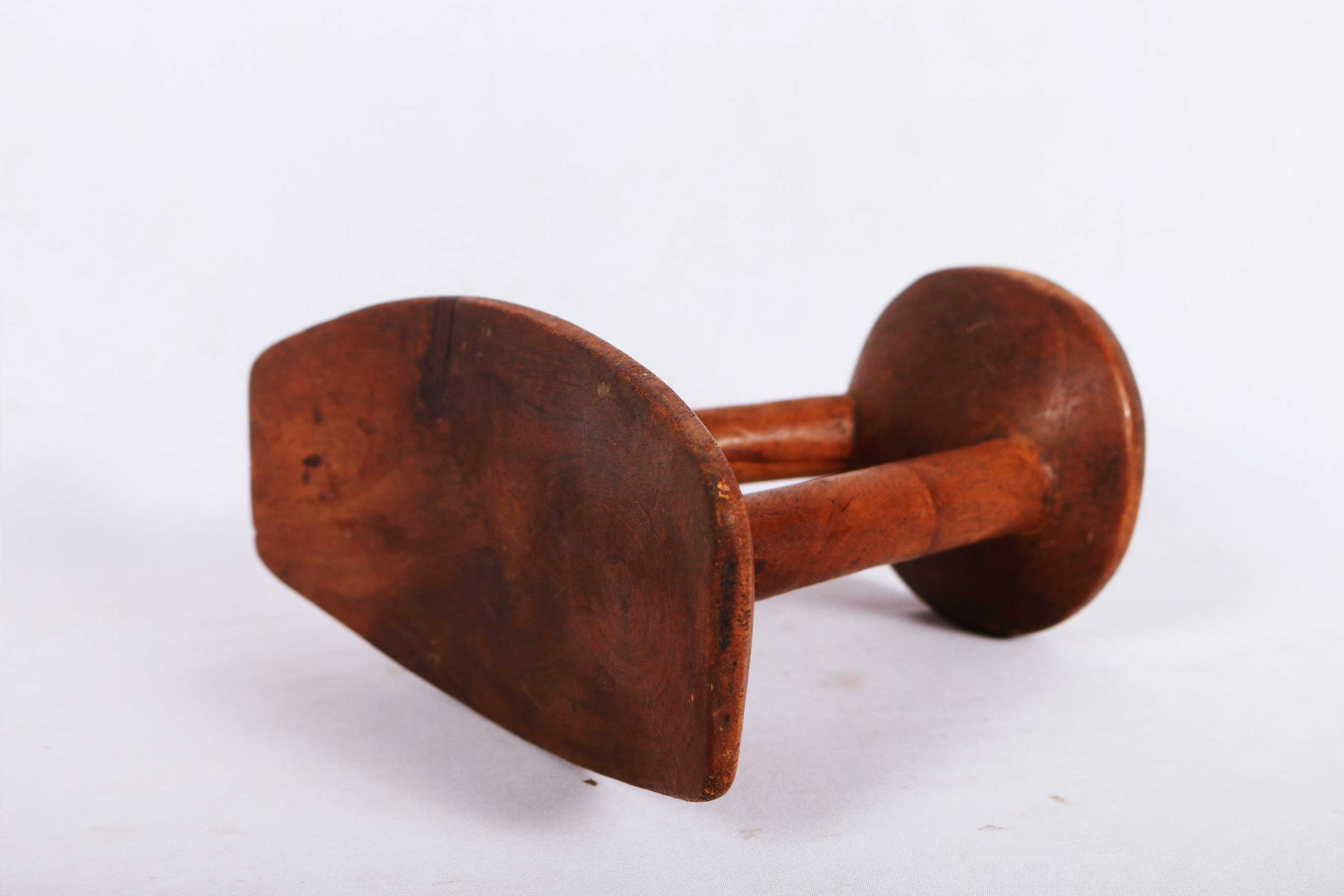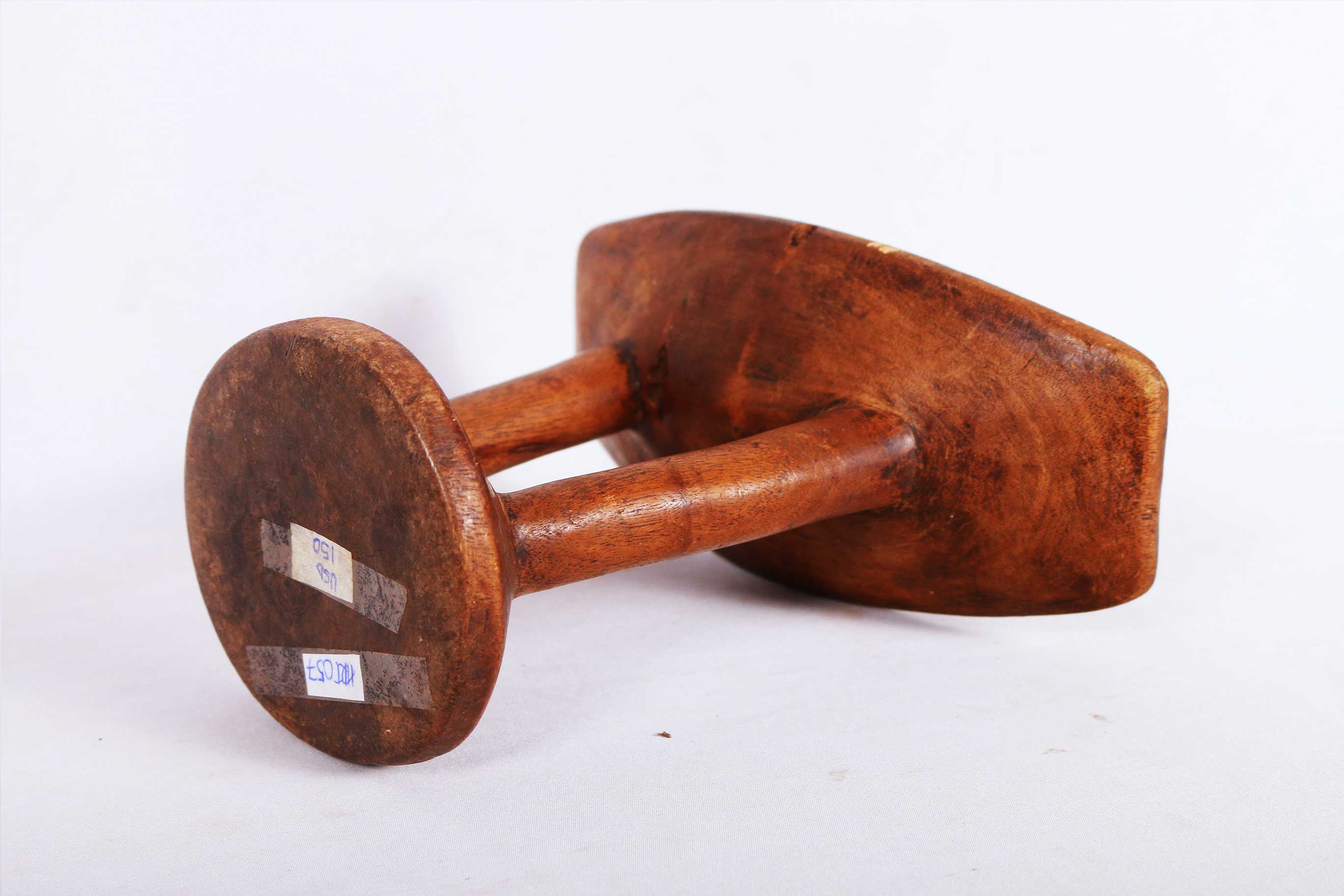 This is a T-shaped headrest from the Karamajong, an ethnic group of agro-pastoral herders living mainly in north-eastern Uganda. Headrests appear like simple pieces of craftmanship but they are of aesthetic value. They possess significance value and they have artistic status, they mean more than just mere objects. These pillow-like objects are some of the most distinctive East African artifacts. Headrests symbolized high social status or magical power such as the gift of foretelling. Headrests are also traditionally believed to protect elaborated headdresses, headrests are no longer a feature of modern life in this region.