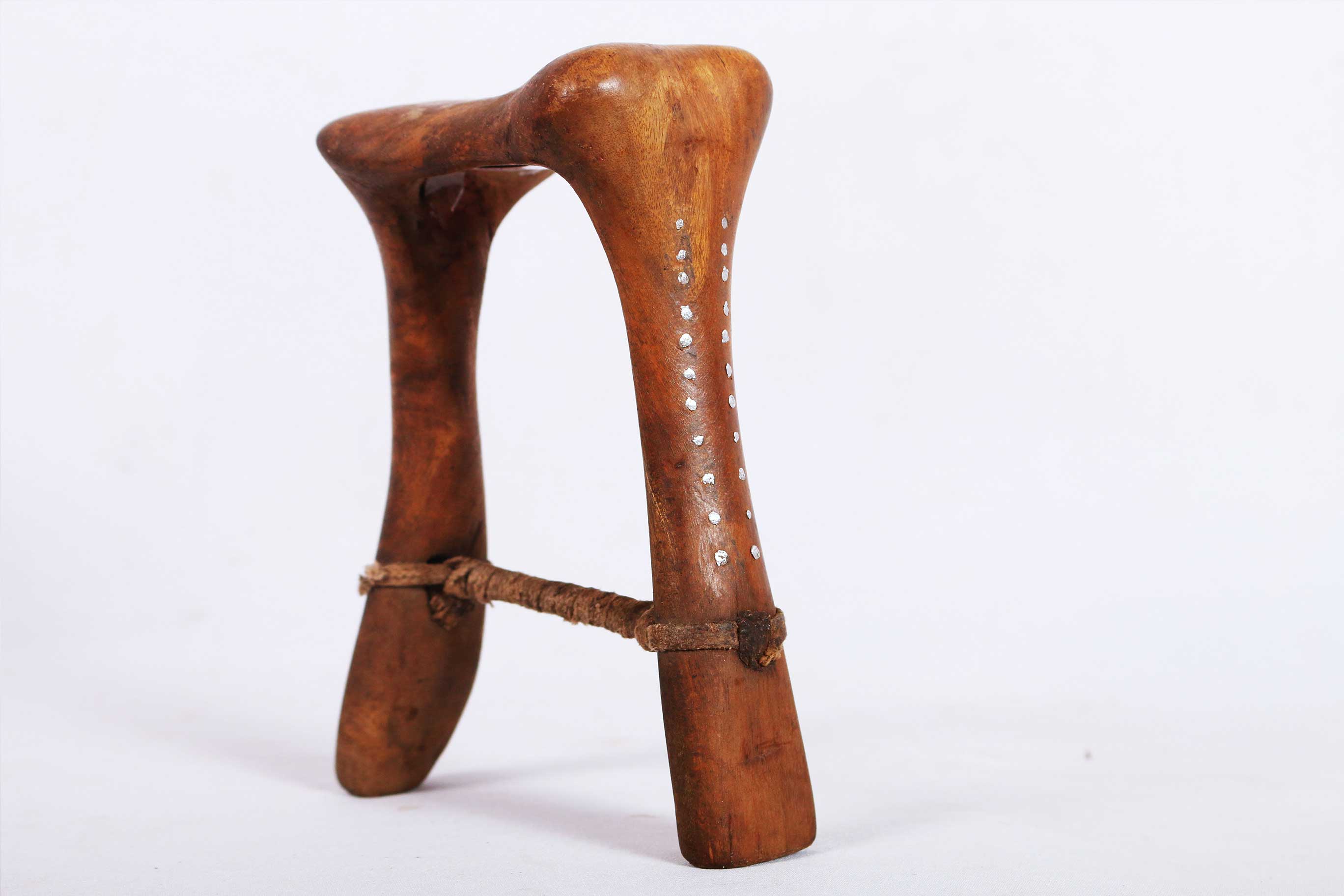 This is an A-shaped headrest from the Karamajong, an ethnic group of agro-pastoral herders living mainly in north-eastern Uganda. Headrests appear like simple pieces of craftmanship but they are of aesthetic value. They possess significance value and they have artistic status, they mean more than just mere objects. These pillow-like objects are some of the most distinctive East African artifacts. Headrests symbolized high social status or magical power such as the gift of foretelling. Headrests are also traditionally believed to protect elaborated headdresses, headrests are no longer a feature of modern life in this region.