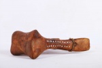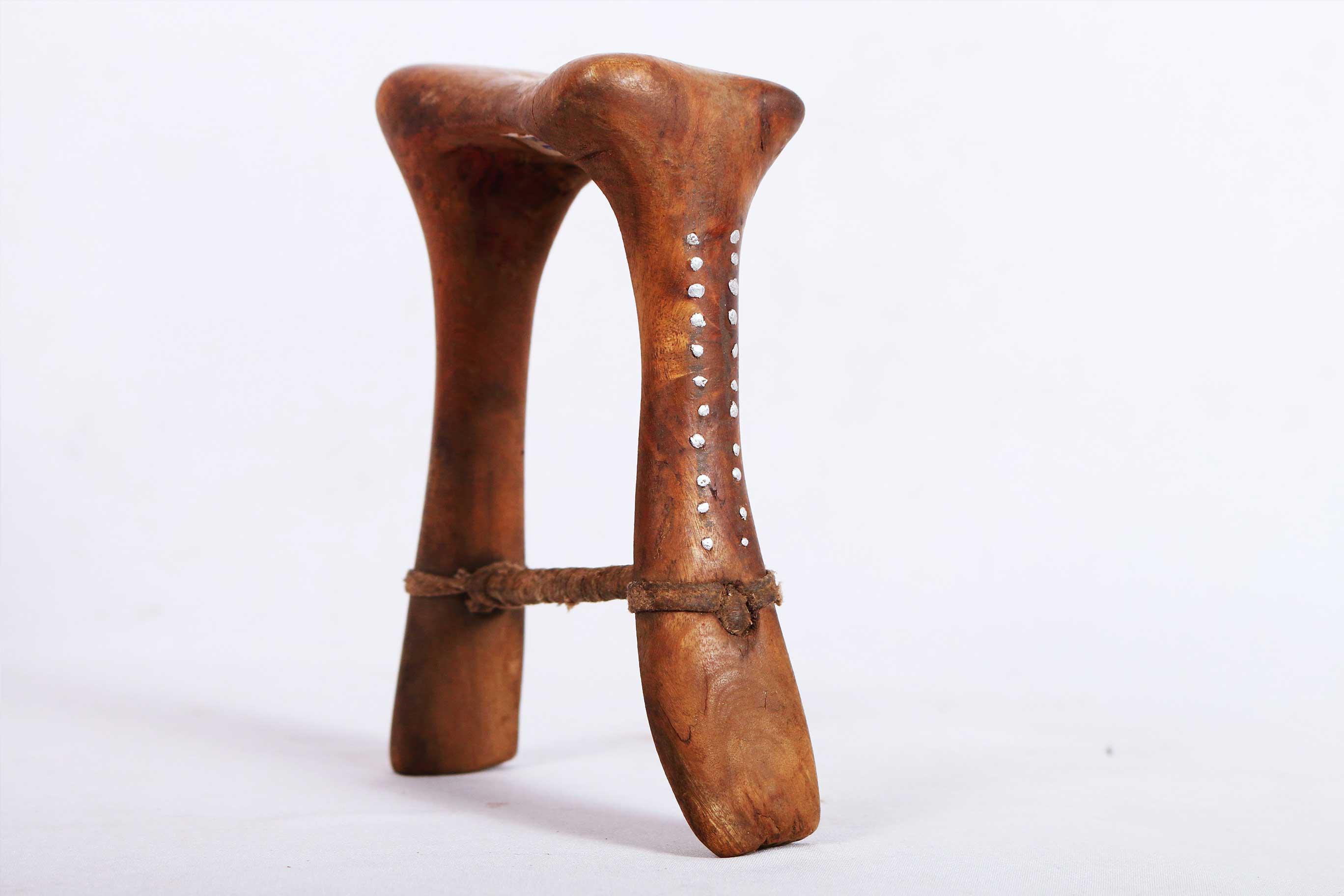 This fine headrest is a result of hard work and skill with its superb vertical A-shape. It is also known as a tied headrest because it is gradually tightened with a piece of leather to prevent the legs from splitting until the desired shape is obtained. It was carved in a single piece of wood, decorated with iron spots on the sides. and could only be owned by an elder aged over 50 years. Such pieces were also paid as dowry by a groom to his bride’s family as a demonstration of respect. This piece could also be inherited by only a man, possibly a brother or elder son of the deceased. Its design is similar to those of Pokot as a result of intermingling. It has a brown wonderful patina, clear signs of usage and old age.