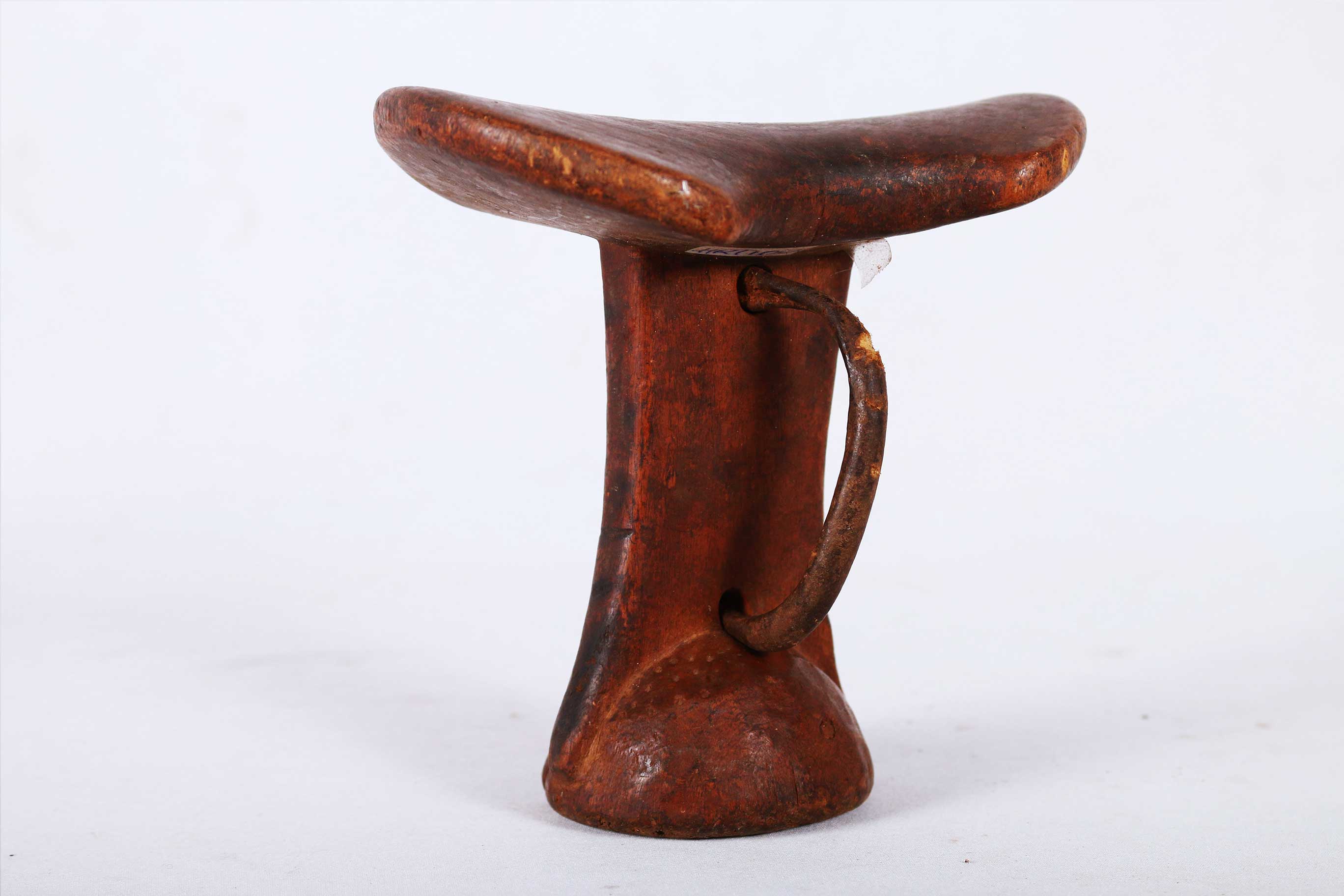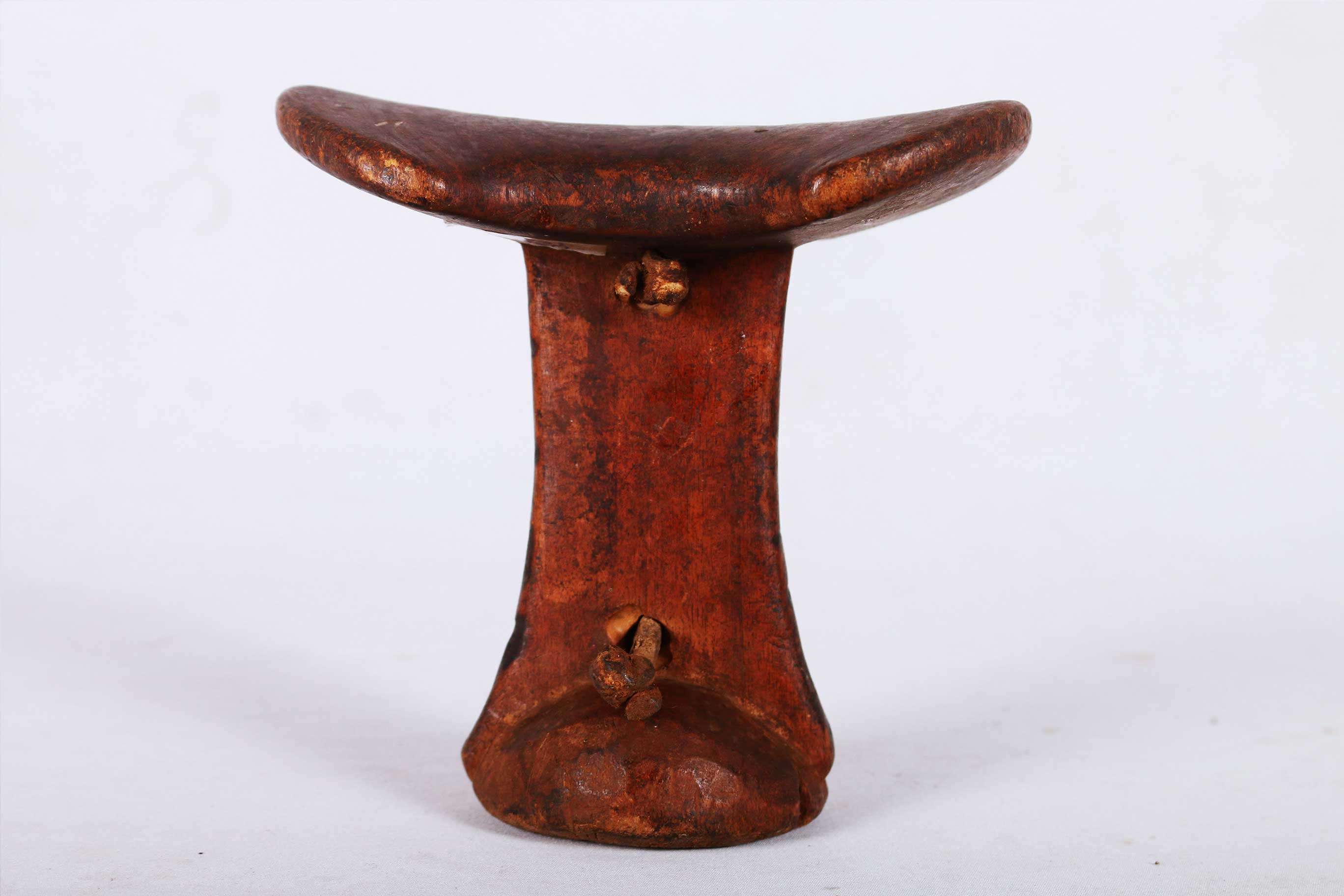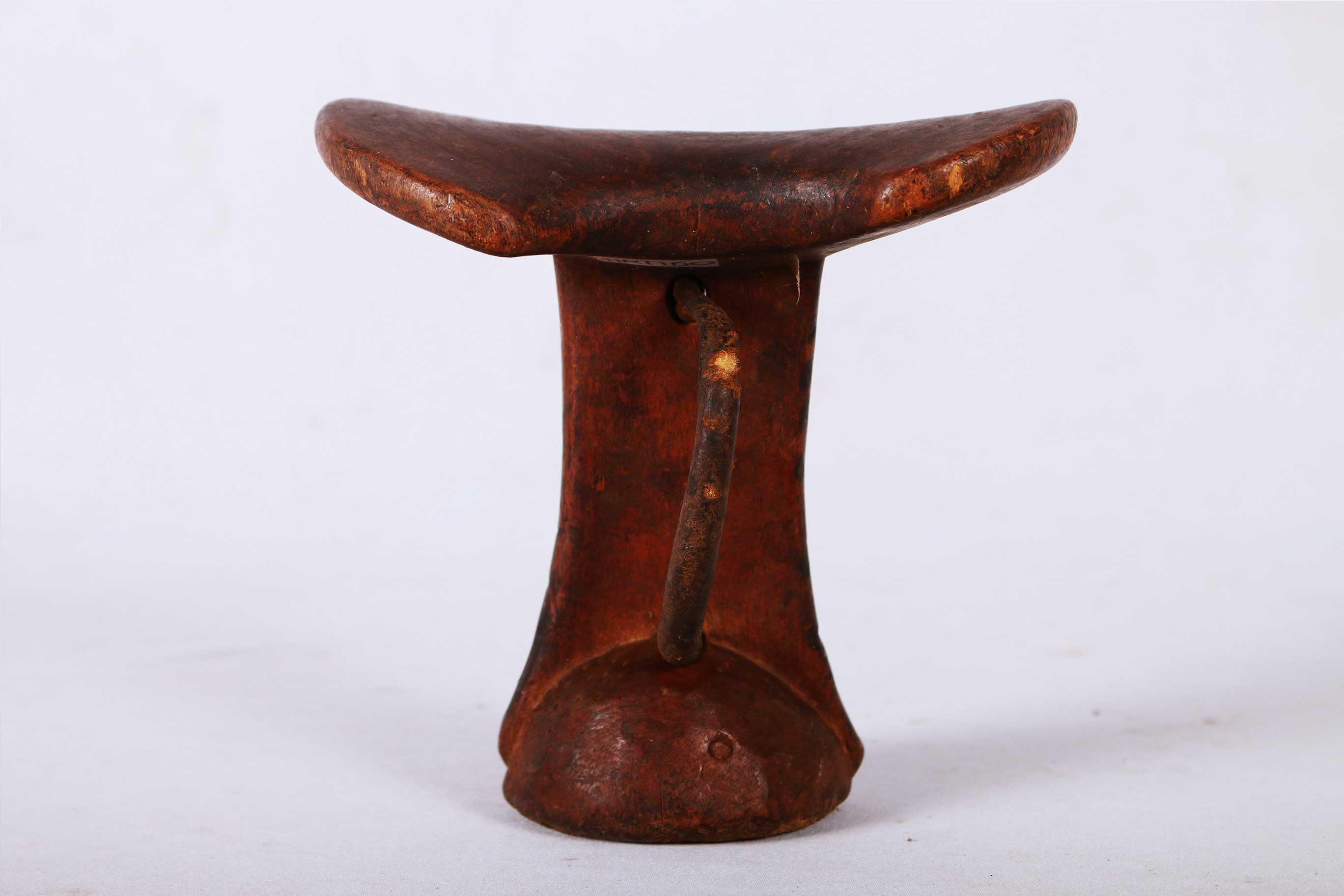 This is a T-shaped headrest from the Karamajong, an ethnic group of agro-pastoral herders living mainly in north-eastern Uganda. Headrests appear like simple pieces of craftmanship but they are of aesthetic value. They possess significance value and they have artistic status, they mean more than just mere objects. These pillow-like objects are some of the most distinctive East African artifacts. Headrests symbolized high social status or magical power such as the gift of foretelling. Headrests are also traditionally believed to protect elaborated headdresses, headrests are no longer a feature of modern life in this region.