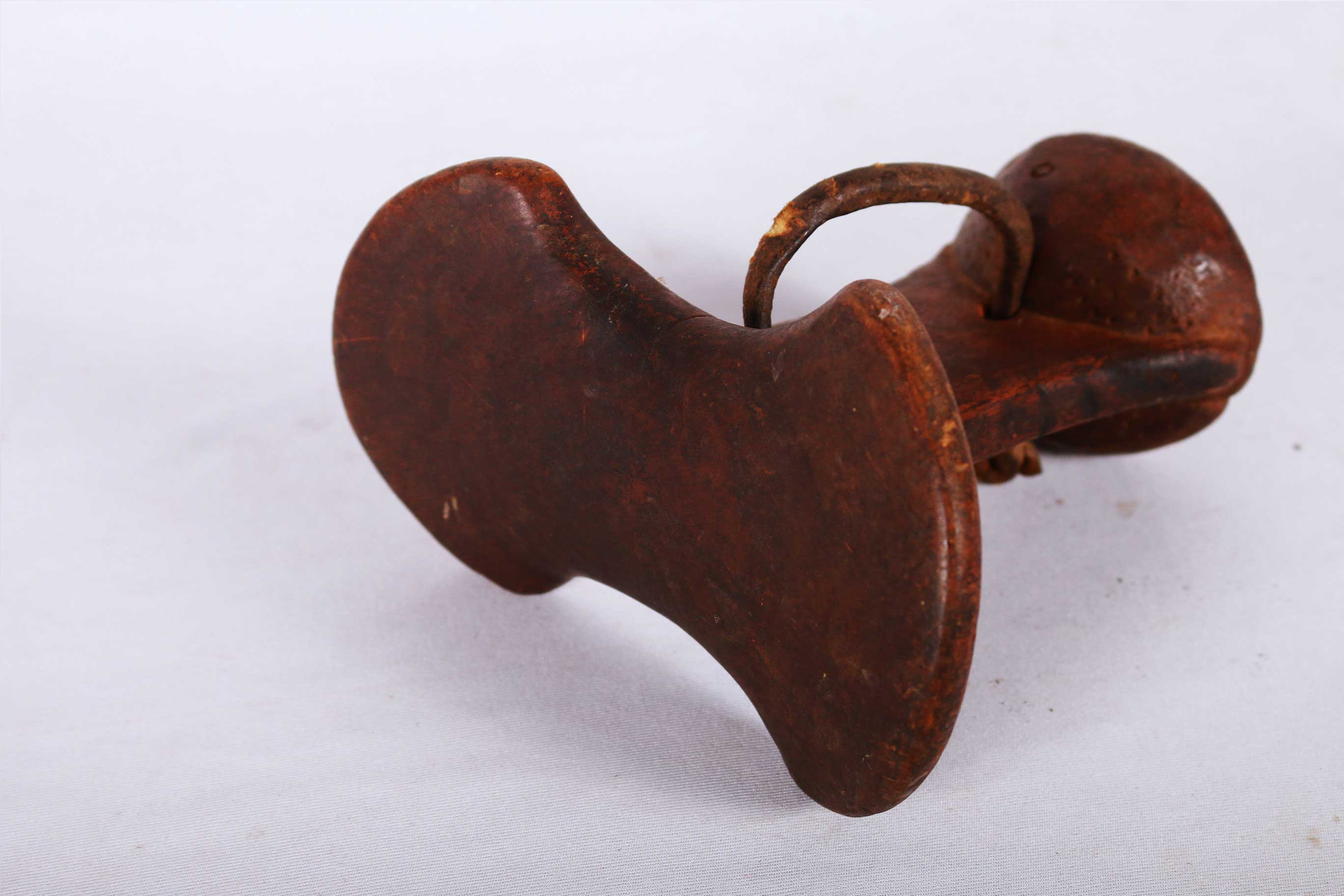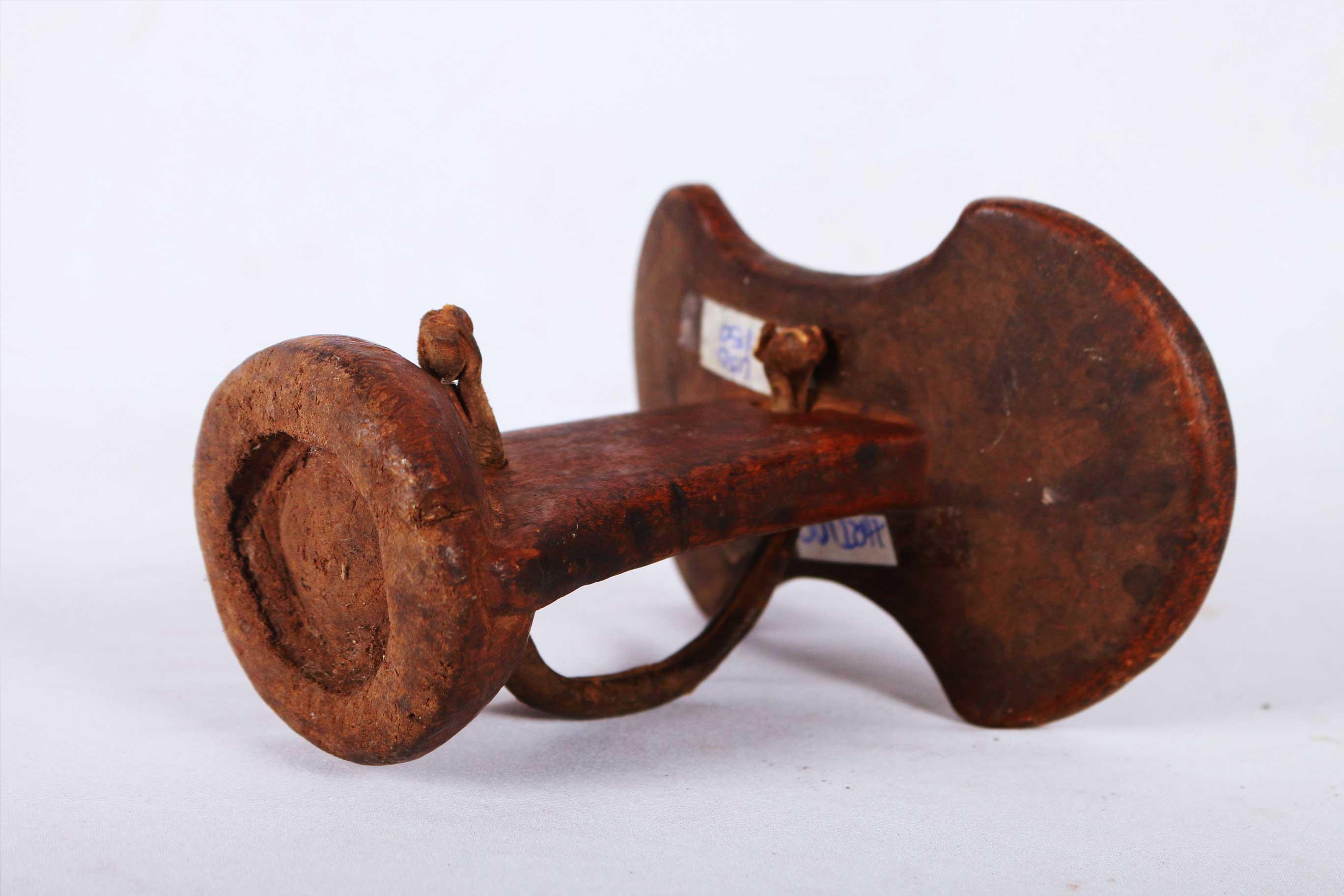 This particular headrest was the property of a highly ranked individual. It can only be used by a man from the elite class. Its design is similar to those of Pokot and Turkana as a result of intermingling. This headrest has a conical base, a single column, and a flat upper surface. It’s decorated with an elegant leather handle and a burnished wonderful patina. It is old with visible signs of old age and usage.