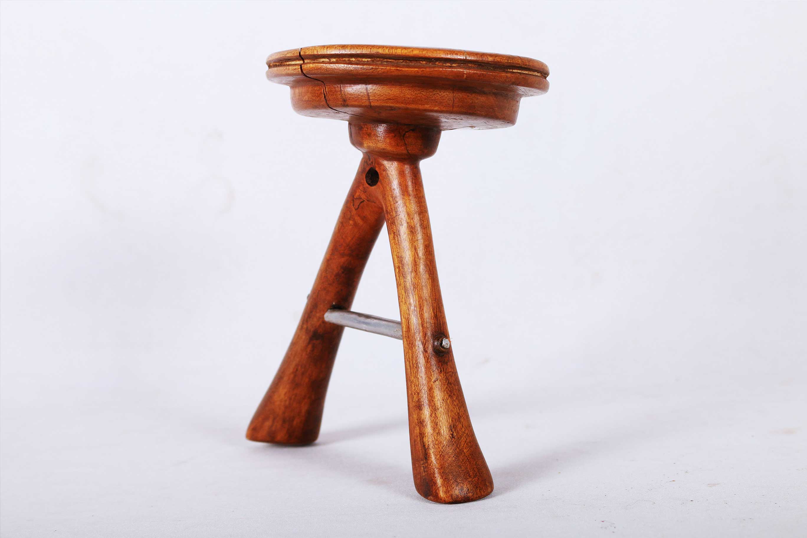 This particular headrest was the property of a warrior man who fought in raids and it was awarded as a reward or trophy by elders. Its design is similar to those of Pokot but with a lesser piece of wood at the base as a result of intermingling. This stylized headrest/stool has two legs and a flat circular upper surface. Its legs are supported by a piece of aluminium and it has a brown patina. It is old with visible signs of old age and usage.