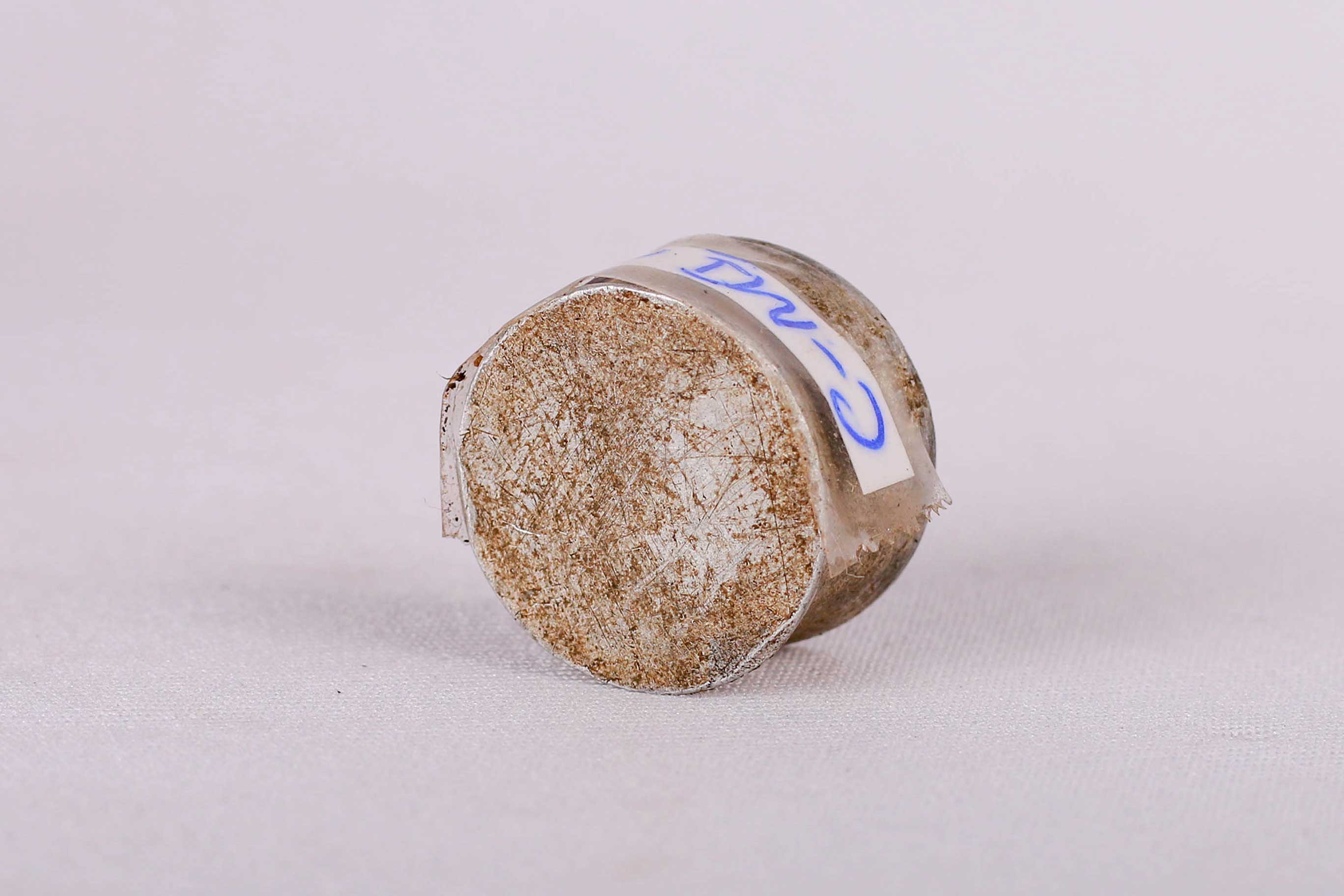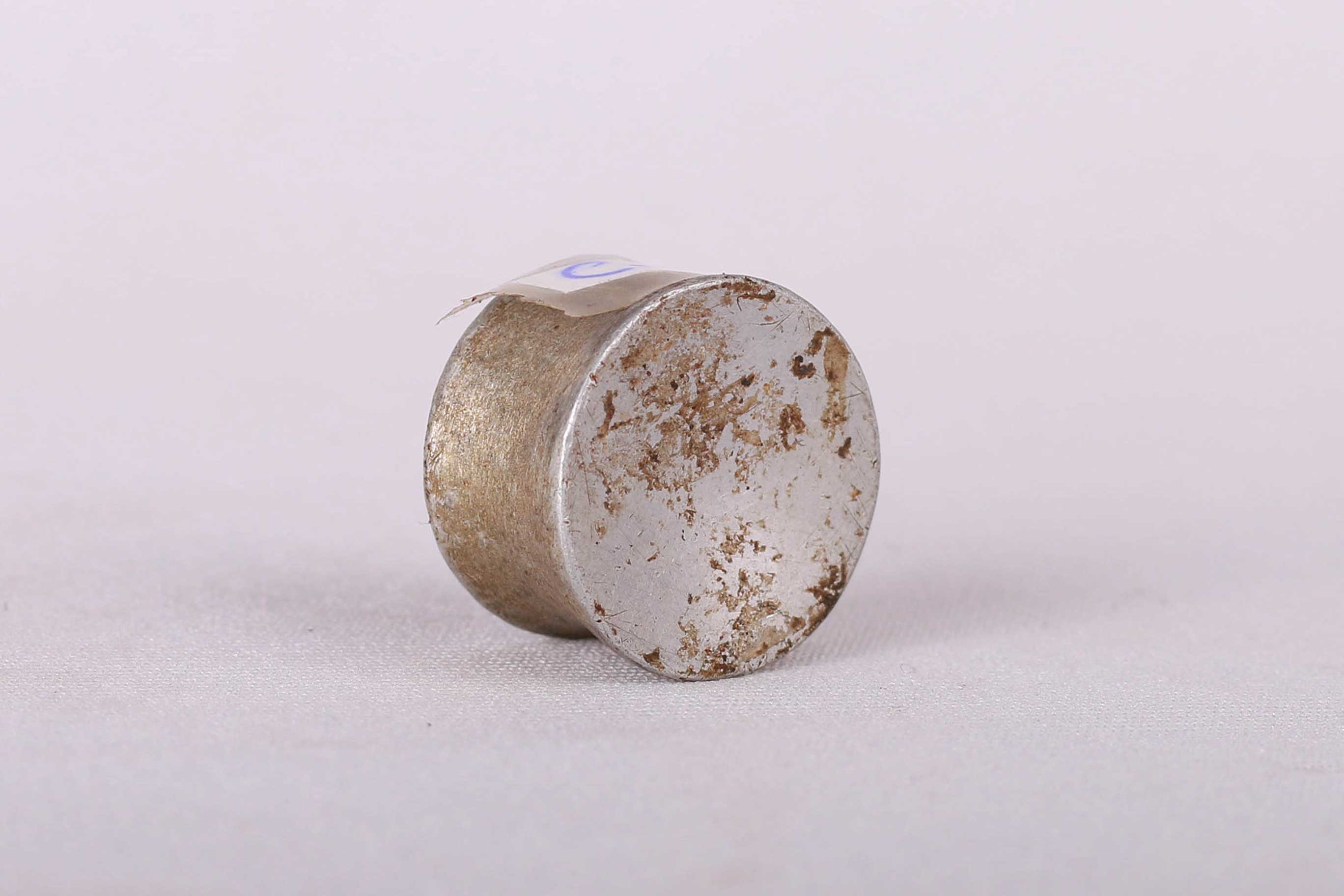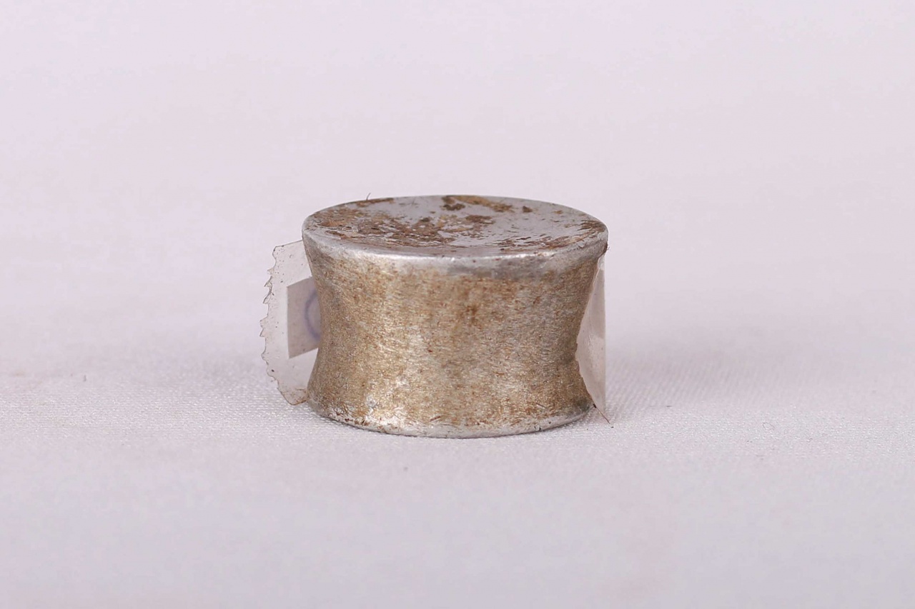 The Karamajong used to wear a plug in the upper lip only. Many older sources reported that the plate’s size was a sign of social or economical importance in some tribes. But, because of natural mechanical attributes of human skin, the size of the plug may often depend on the stage of stretching of the lip and the wishes of the wearer. This is an old metallic lip plug that shows signs of wear, natural abrasion, and usage.