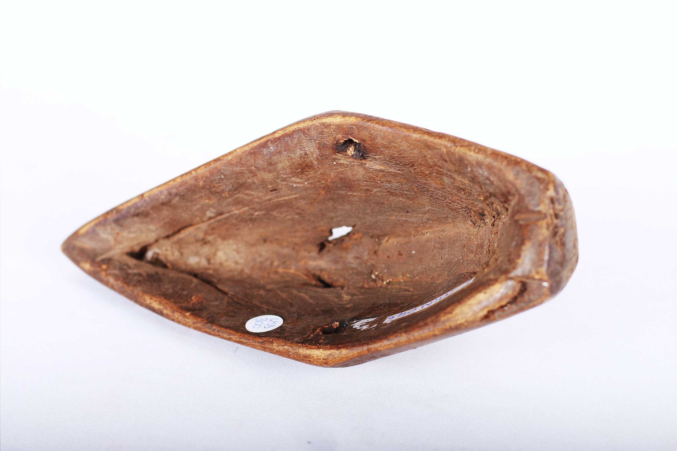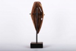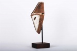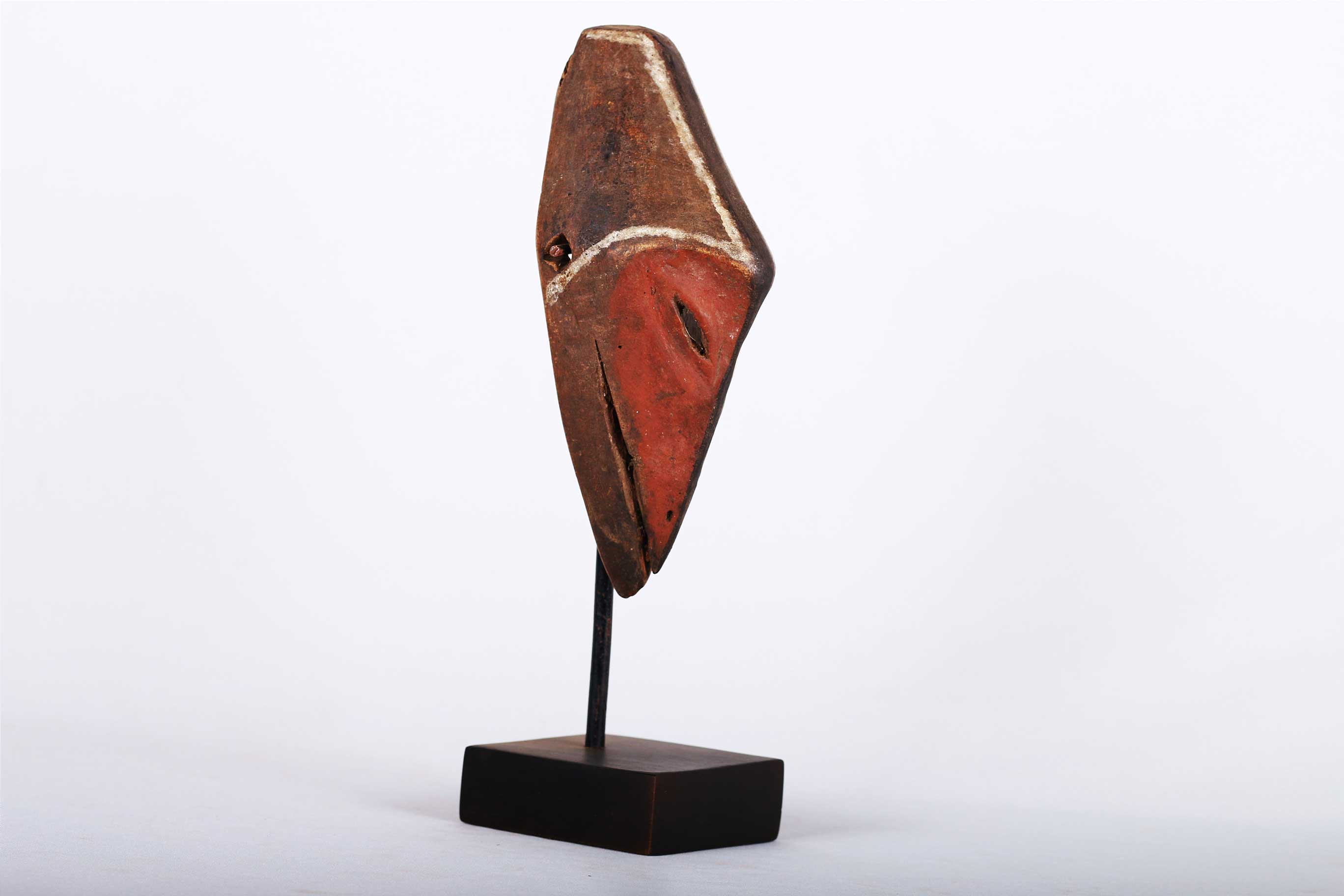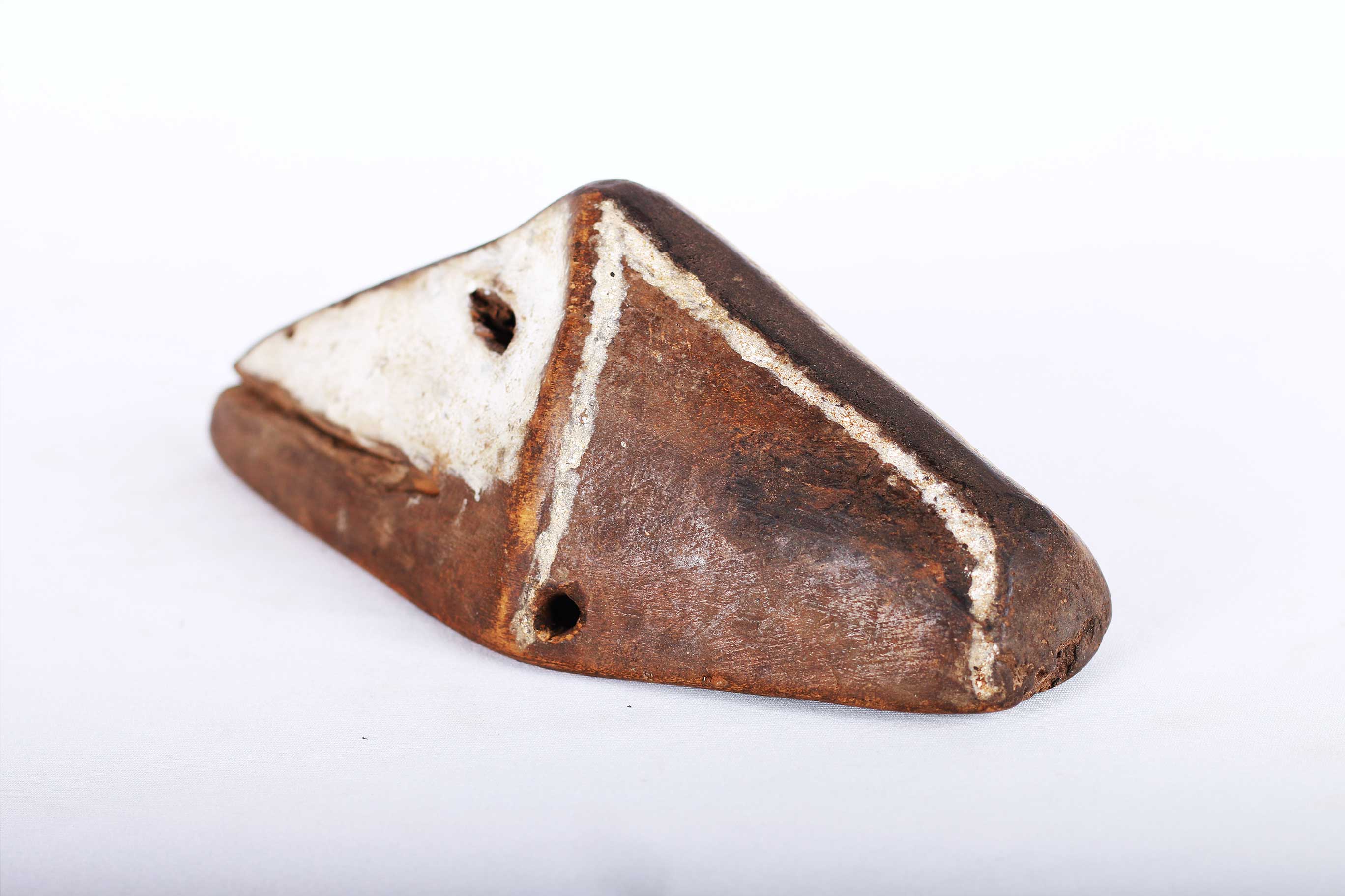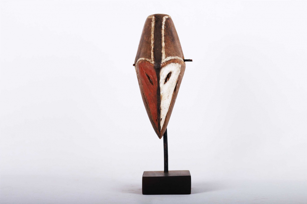 This mask originates from the Kela tribe located mainly in the Kasai-Oriental province of the Democratic Republic of Congo. This is a zoomorphic mask of a bird beak. We could not ascertain what such masks were used for in the Yella society but this is an old bush collected mask with a brown patina, white kaolin on one side, red pigment on the other side, a pointed beak-like chin and it displays perfect signs of age and usage.