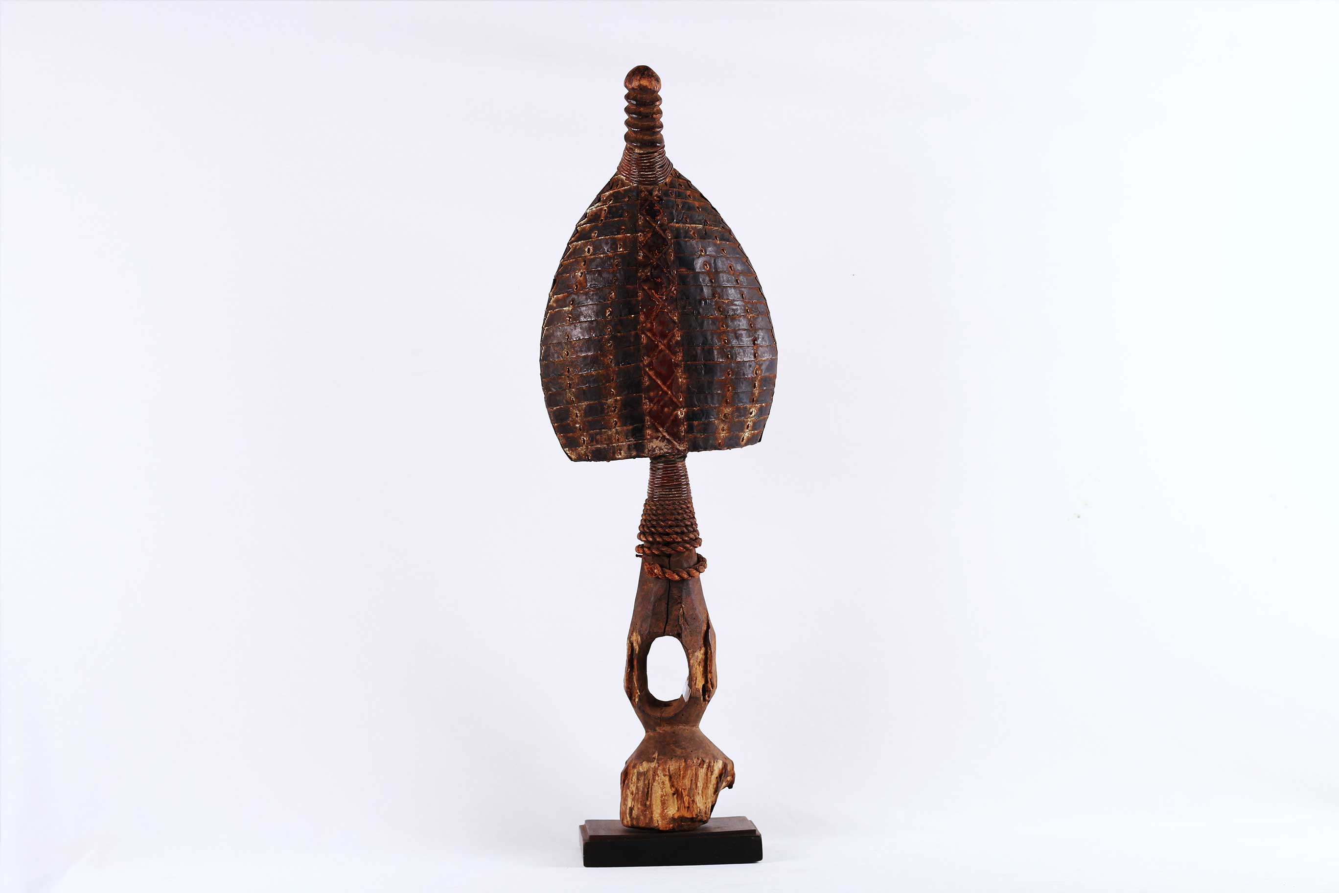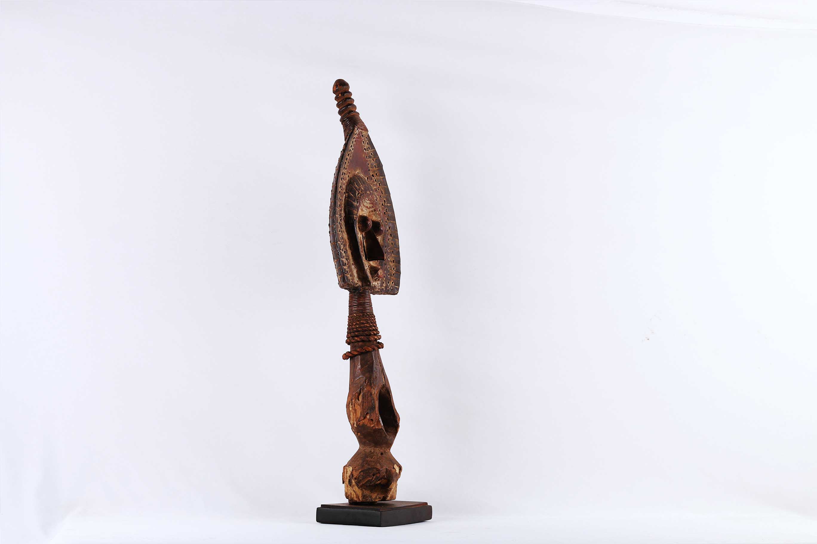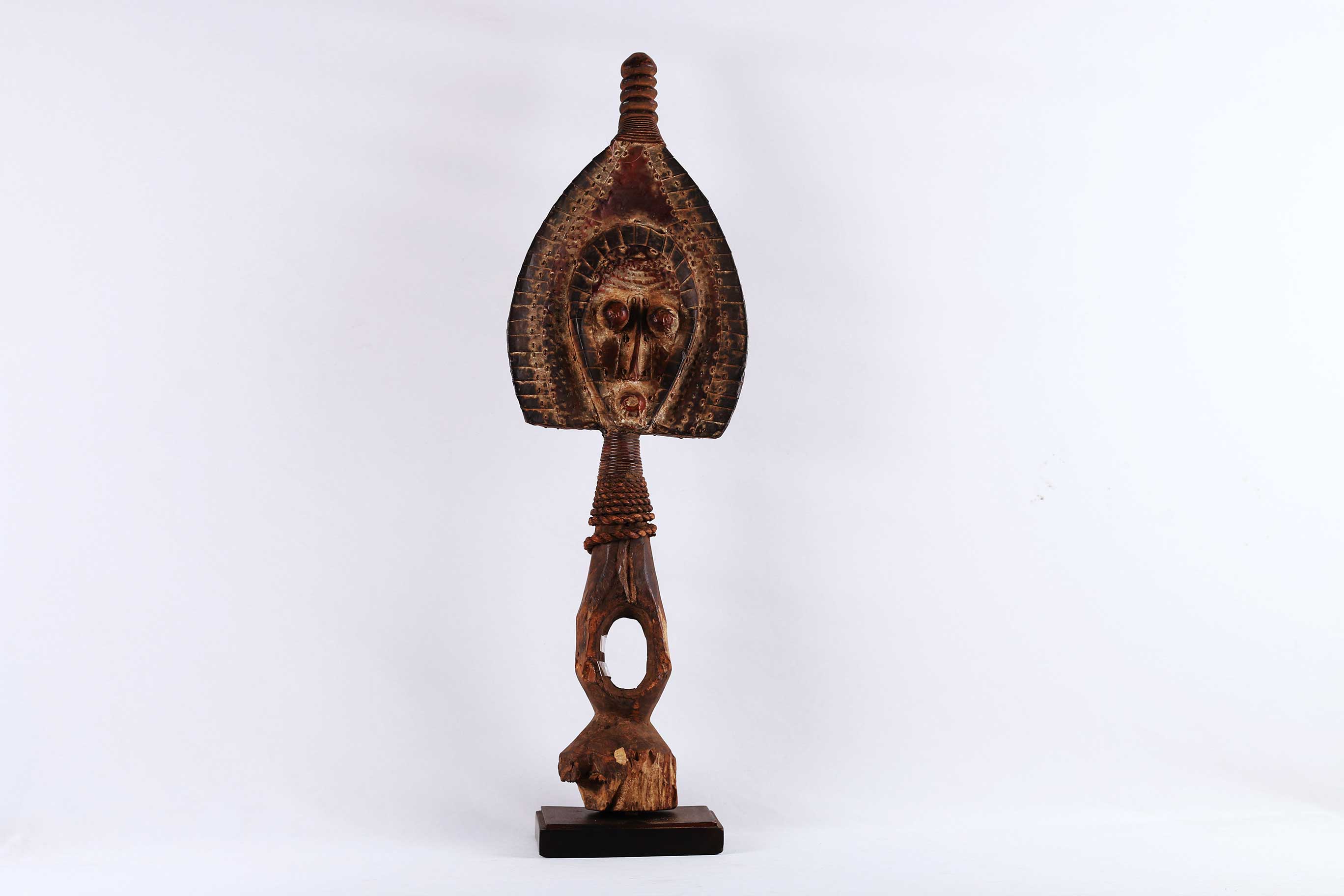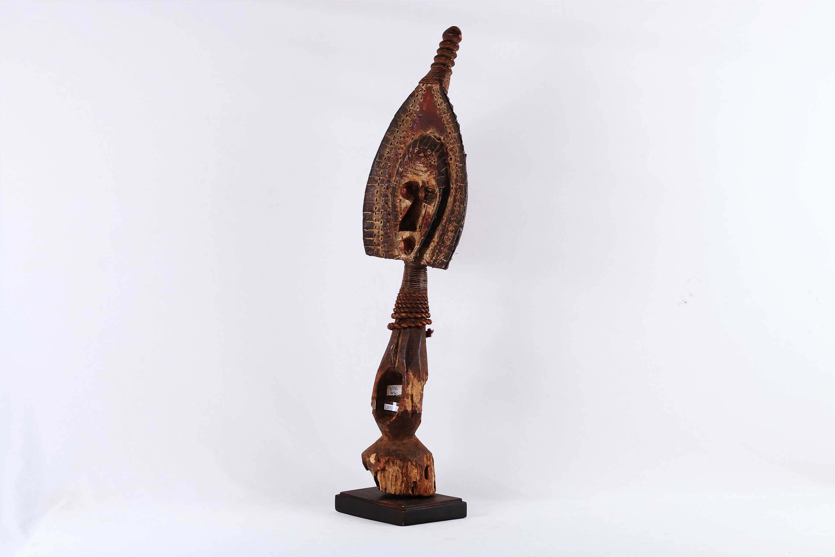 Kota Masks usually have unique styled heads and simply shaped bodies, oval faces and a convex surface to represent masculine or a concave surface to represent feminine. This is a kota guardian mask used for protecting the relics of an ancestor that is contained in a box, basket or bundle called the ‘Bwete’. The Kota high reserve the remains of their ancestors because they believe that they can call on their power to help hem when they are in trouble. This is a very interesting mask carved out of wood, it has a brown patina, twisted fiber and worn out with age but in good condition.