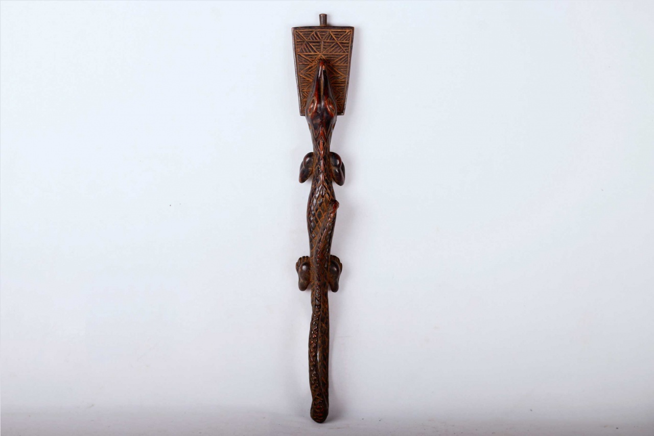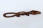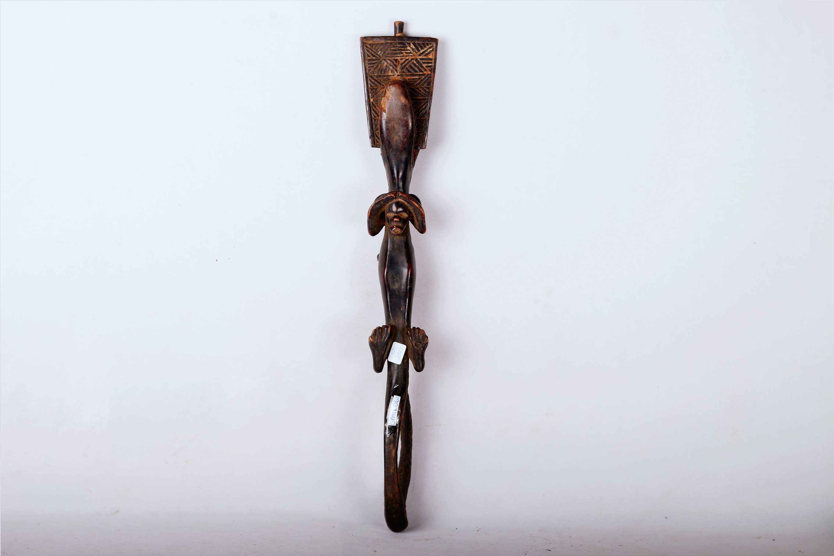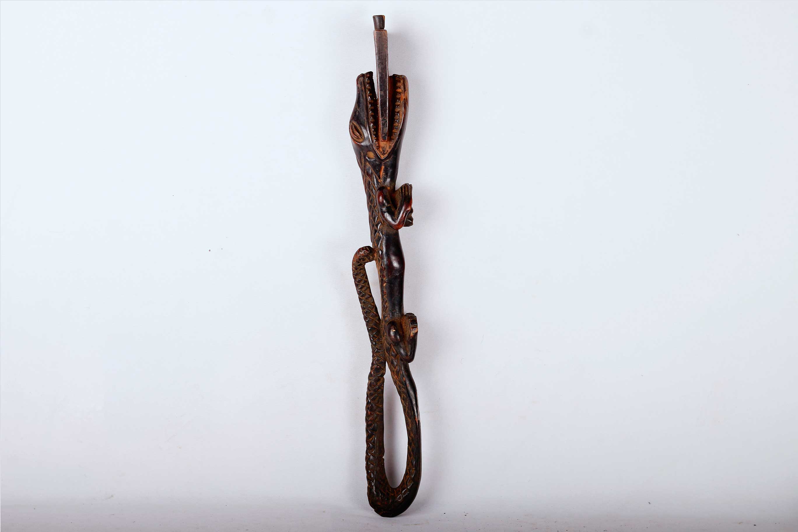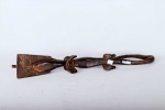 Kuba artists of the south-central Democratic Republic of the Congo create friction oracles known as Itombwa. Regarded as infallible divinatory instruments, Itombwa were used by the Ding, Kuba, Lele, Luluwa, and Wongo peoples to mediate between diviners and omniscient nature spirits in order to determine the cause of illnesses and appropriate courses of treatment, as well as to expose dishonesty. Itombwa often takes the form of animal figures, their backs forming the rubbing surface. The animals, such as crocodiles, bush pigs or dogs, are associated with hunting prey or rooting out a plant, thus symbolizing a diviner’s quest for knowledge and insight, as the diviner seeks to uncover the agent or cause of misfortune, controversy and suffering The crocodile never lies is the native saying.” The friction, that is the smooth movement of the wooden rubber, is created by the addition of specially prepared root juices and oil as it is used by the diviner. Traces of red camwood powder may still be seen, typical of the finishing touch on almost all Kuba carvings. The surface of this Itombwa is carved with simple geometric ornamentation around the upper torso, legs, and neck.