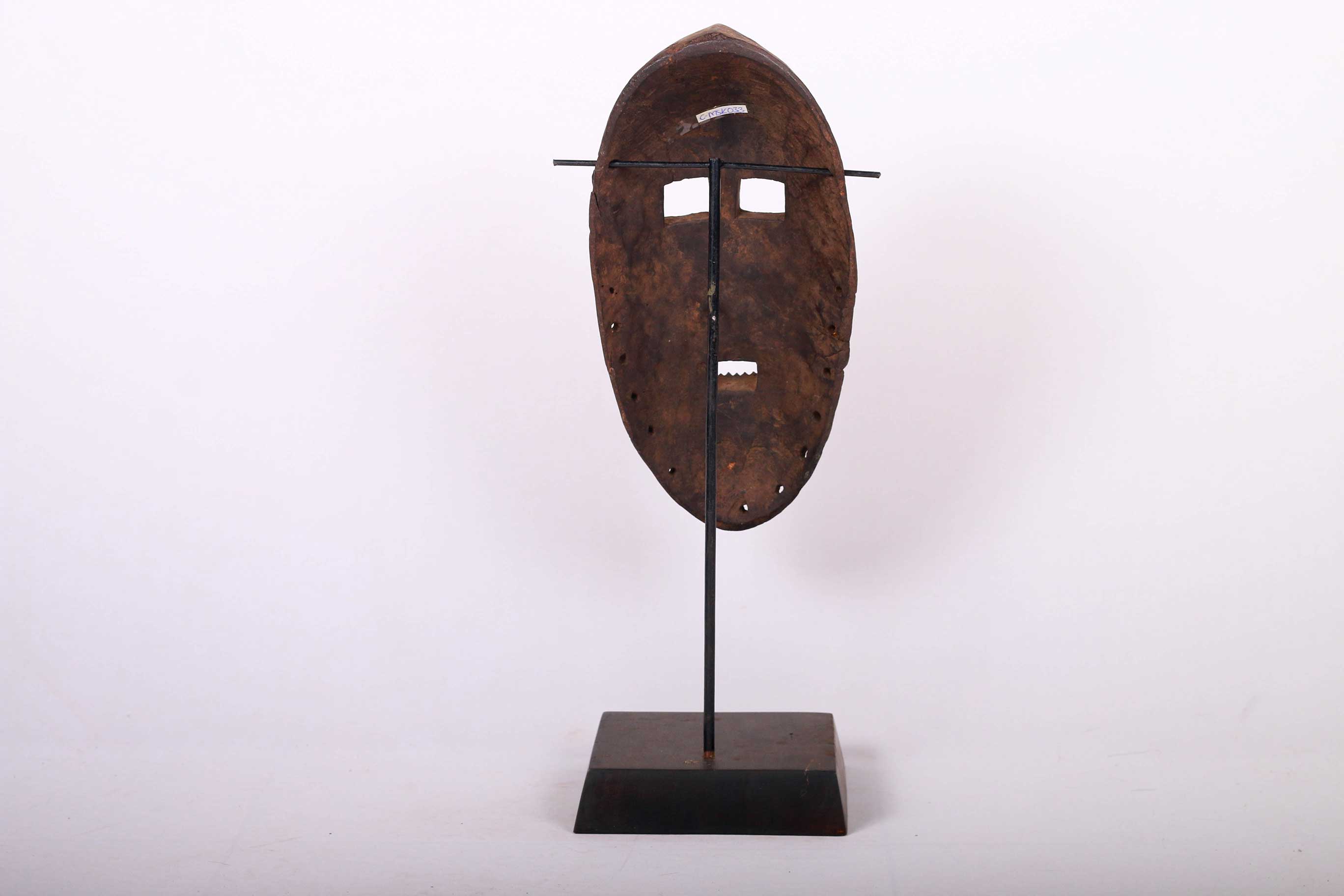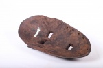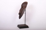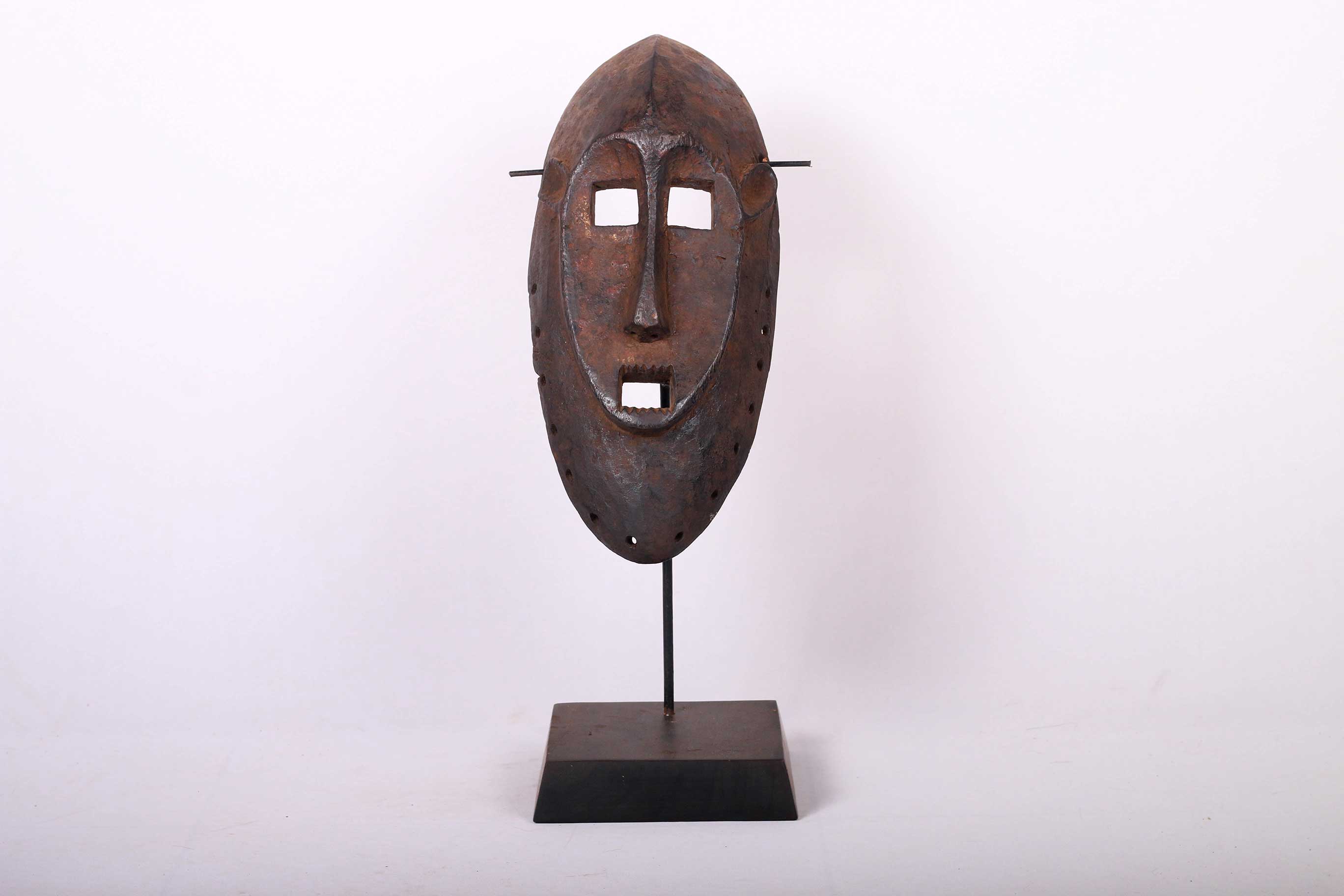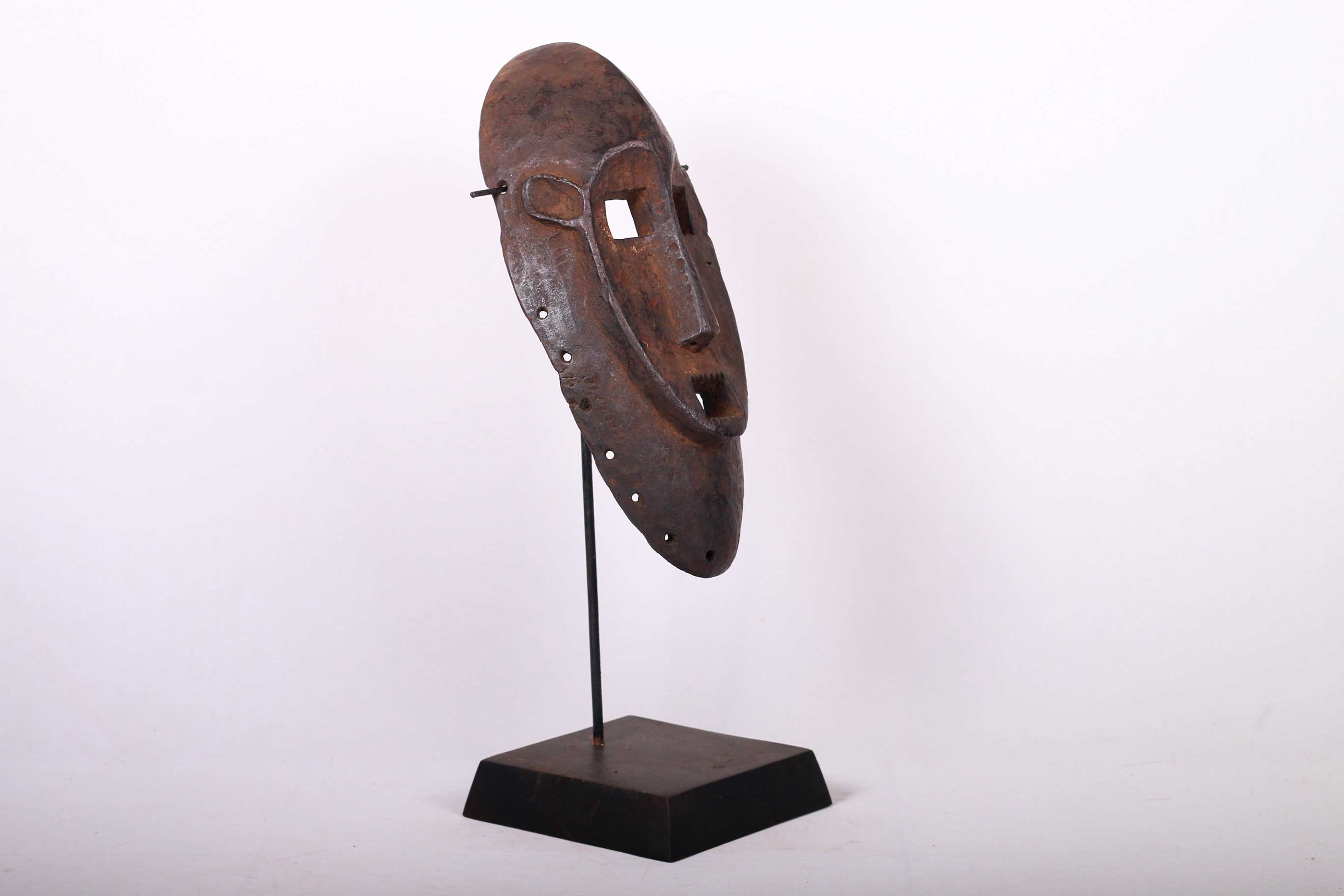 The Kumu live in the eastern Democratic Republic of Congo. The Kumu place a high value on loyalty to the extended family and honoring the in-laws. The Kumu are famous for their geometrically abstract style. Masks like this were used during boy’s initiation ceremonies, they were controlled by the Nsembu divination society and believed to be owned by the most prestigious persons in the community. The following Kumu mask has huge rectangular eye and mouth openings and a long nose running from the forehead, it has an oval shape and a concaved face, it has teeth markings lying on both sides of the lips. It has a shallow face with a brown patina. It shows signs of usage and of considerable age.