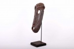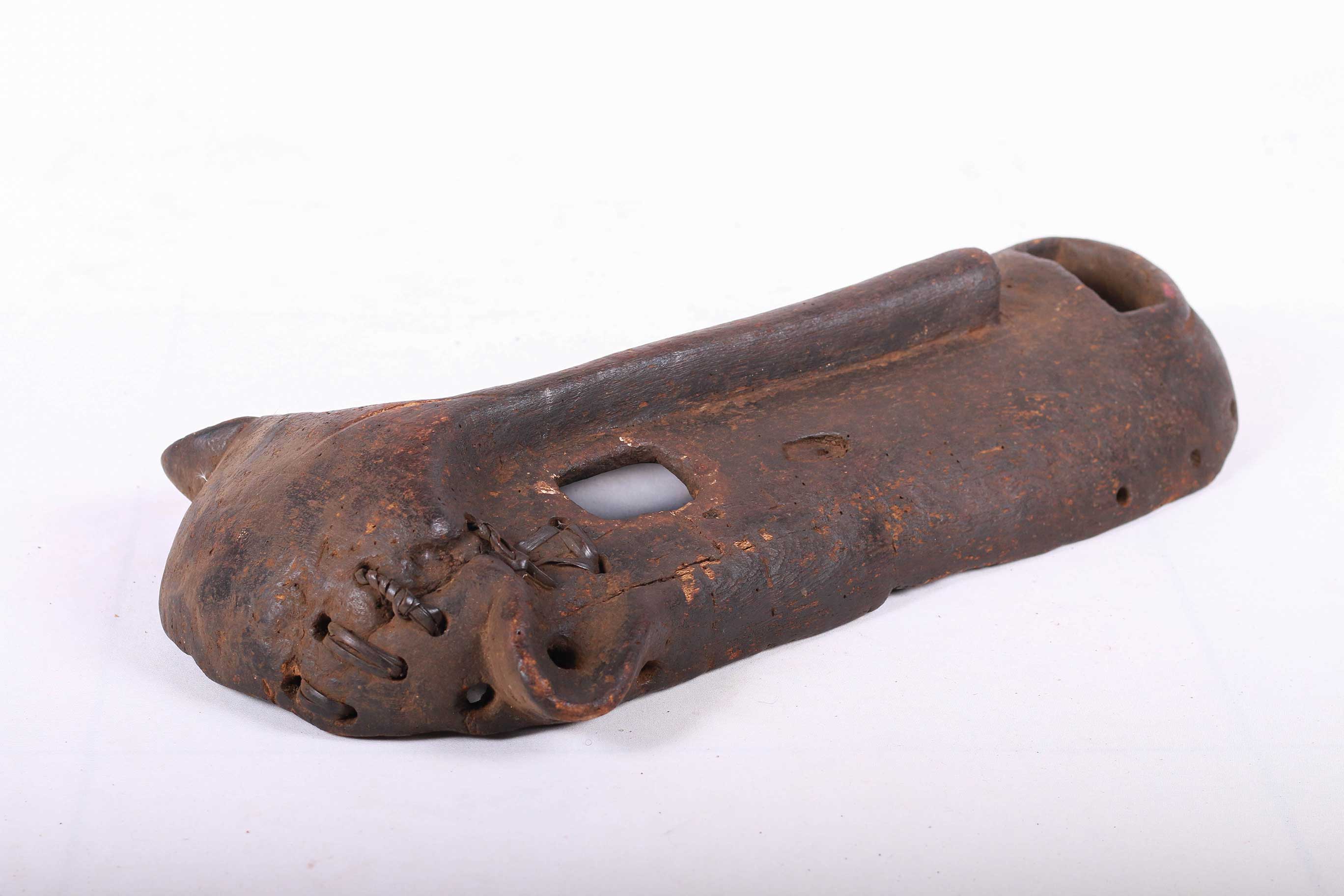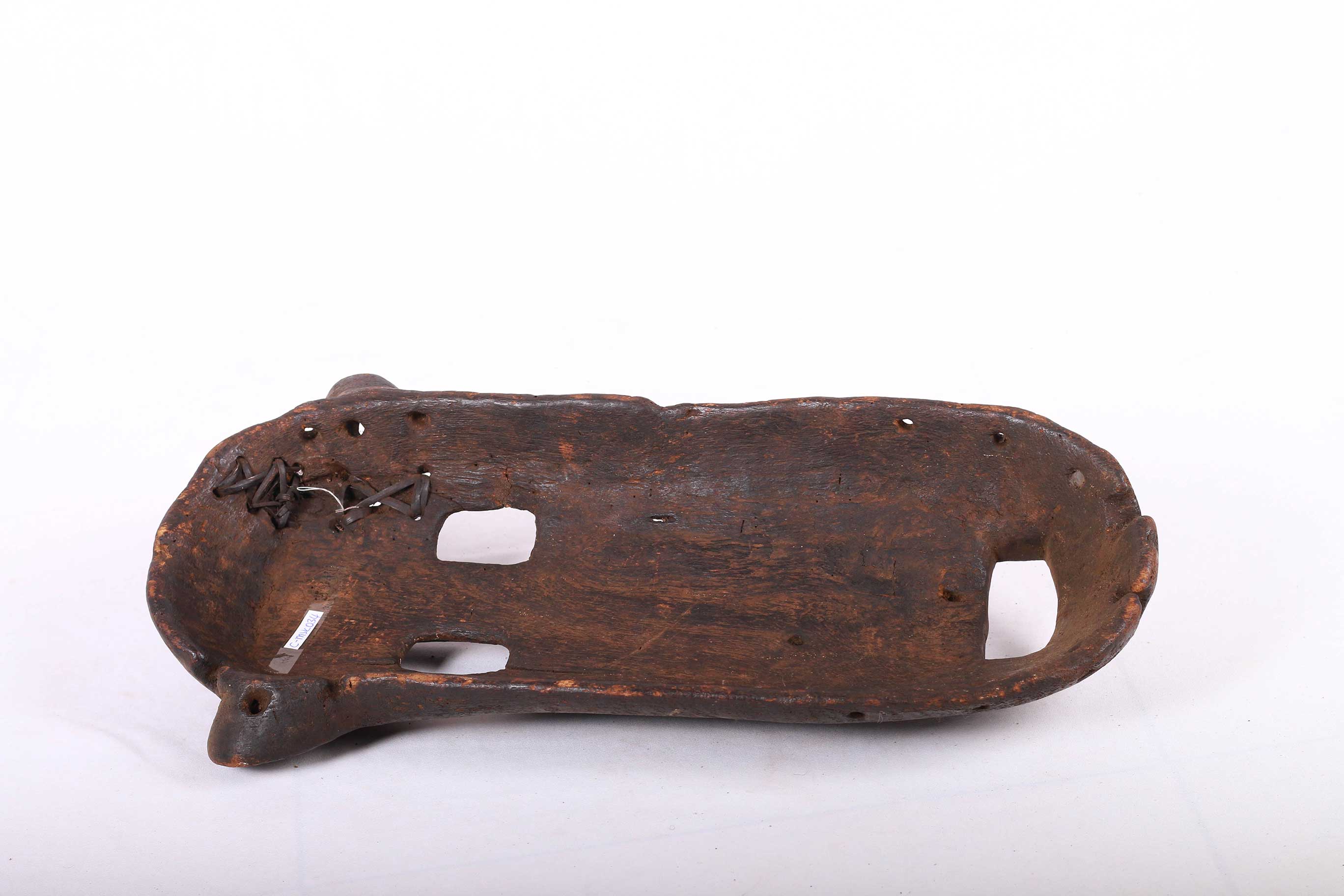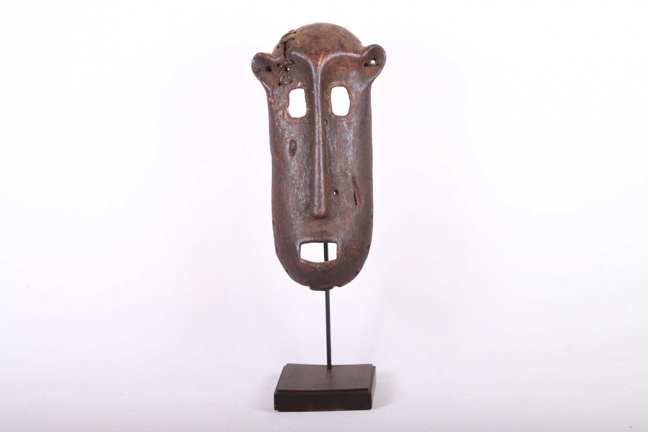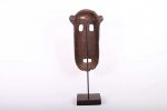 The Kumu live in the eastern Democratic Republic of Congo. The Kumu place a high value on loyalty to the extended family and honoring the in-laws. The Kumu are famous for their geometrically abstract style. Masks like this were used during boy’s initiation ceremonies, they were controlled by the Nsembu divination society and believed to be owned by the most prestigious persons in the community. The following Kumu mask has huge rectangular eye and mouth openings and a long nose running from the forehead. It has a shallow face with a dark brown patina. It shows signs of usage and of considerable age.