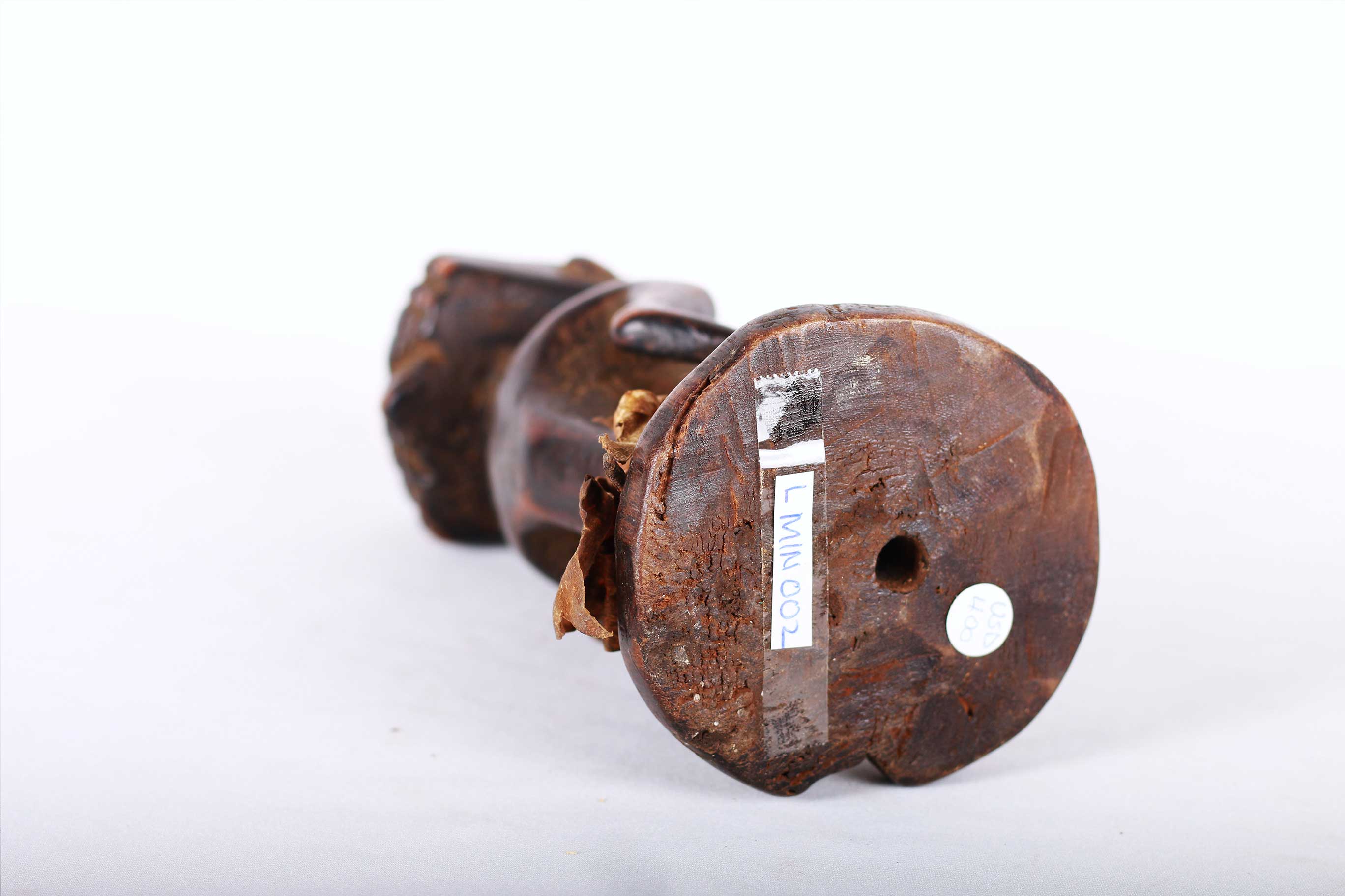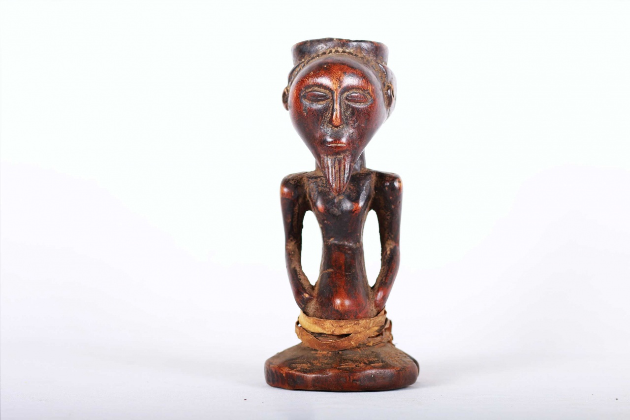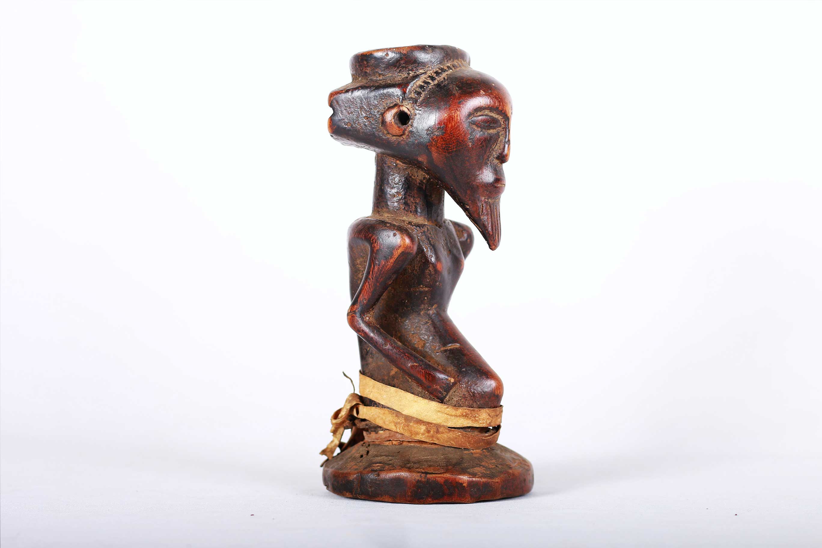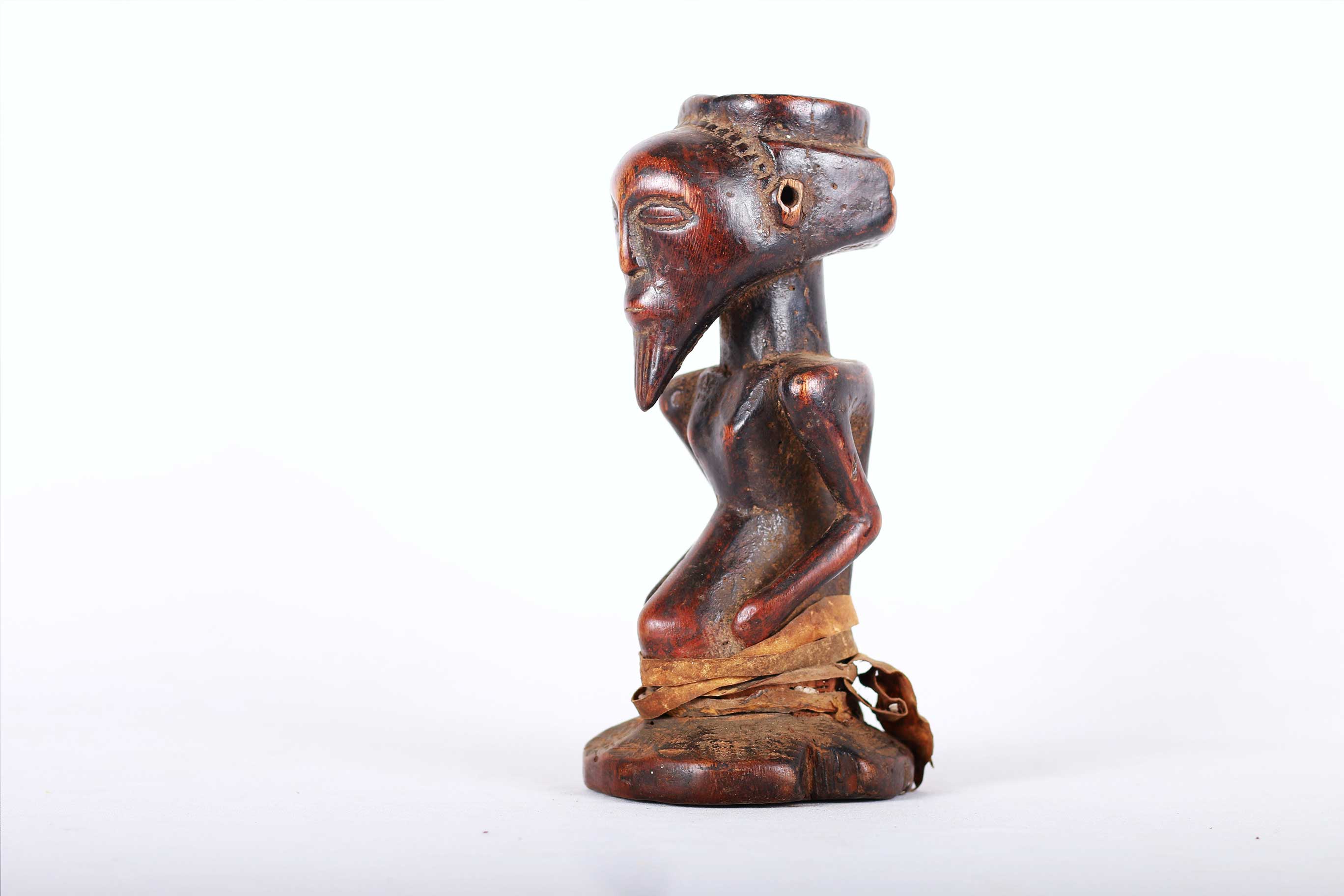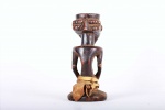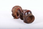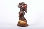 Kusu live on the left bank of Lualaba River. During their migration from the north, they passed through Luba, Hemba and Songye lands where they assimilated social and artistic traditions of these ethnic groups. They are divided into clans assisted by village chiefs, known as Mwamkana, and my family, chiefs called Bankumi.here is an initiation society, which is primarily aimed at educating people about the evils of witchcraft, and there are also diviners that are consulted for matters of importance. Nothing precise is known about Kusu art. It is relatively rare and is highly influenced by the neighbouring Luba, Songye, and Hemba. This is an old miniature statue with a brown shiny patina and shows perfect age and usage.