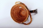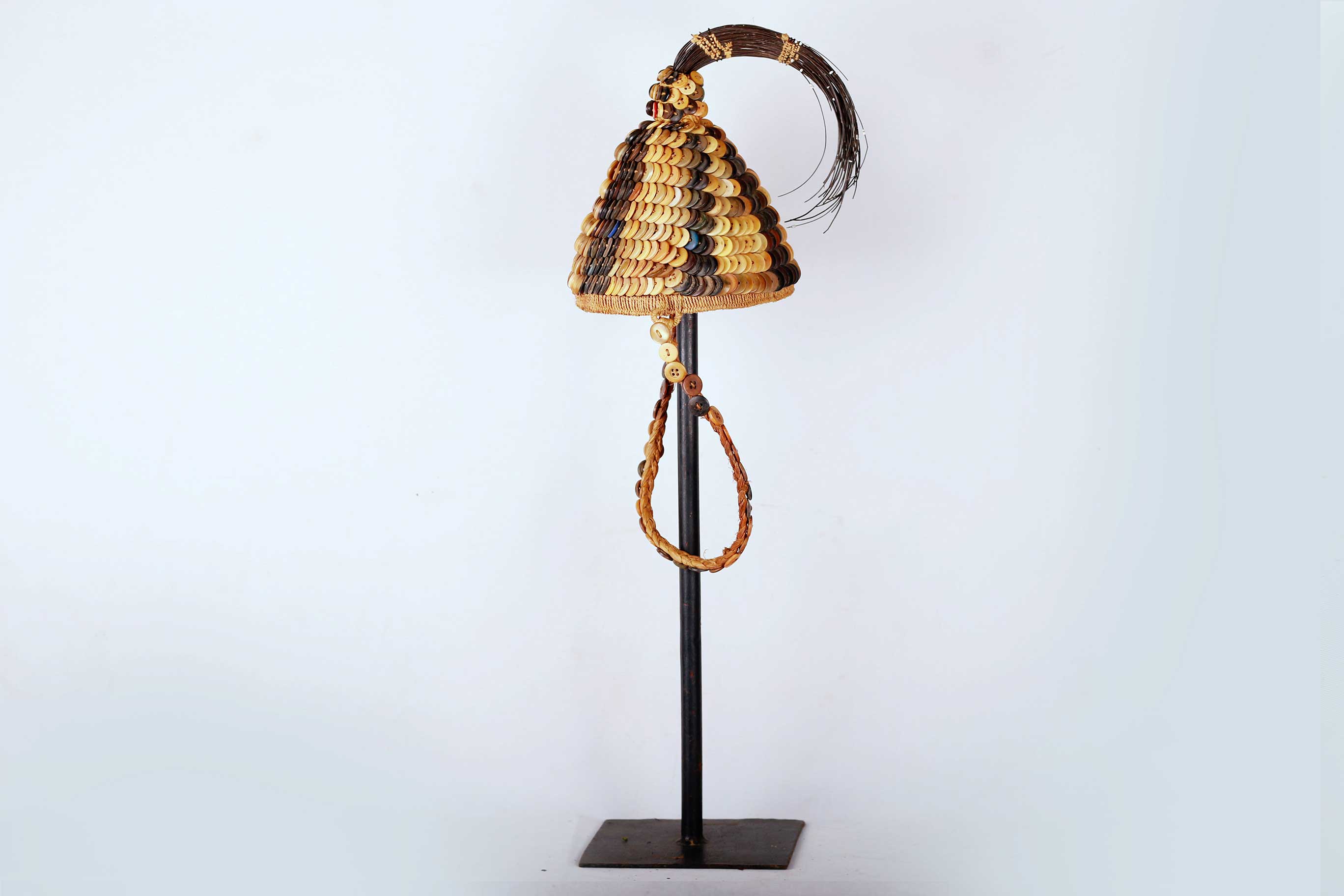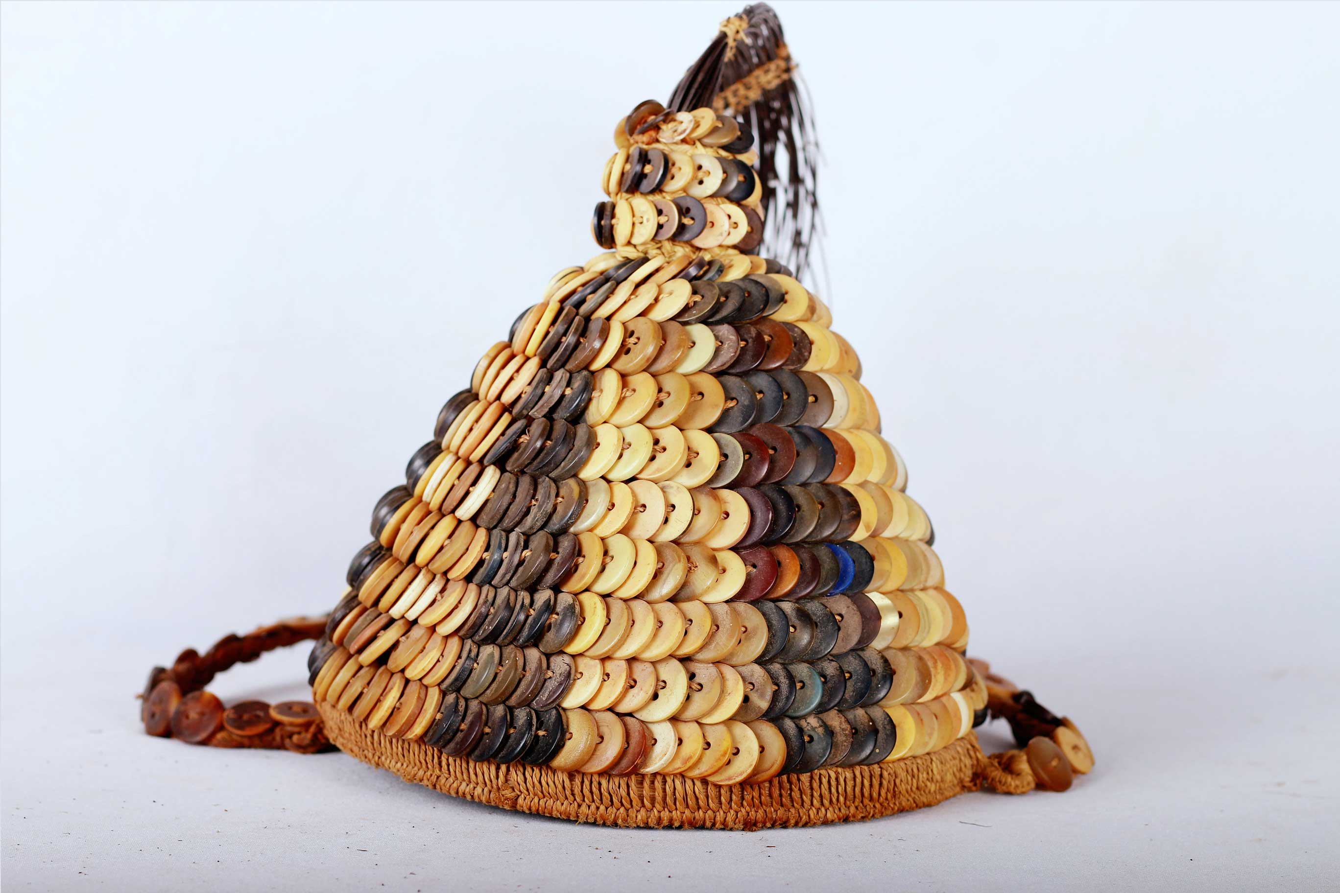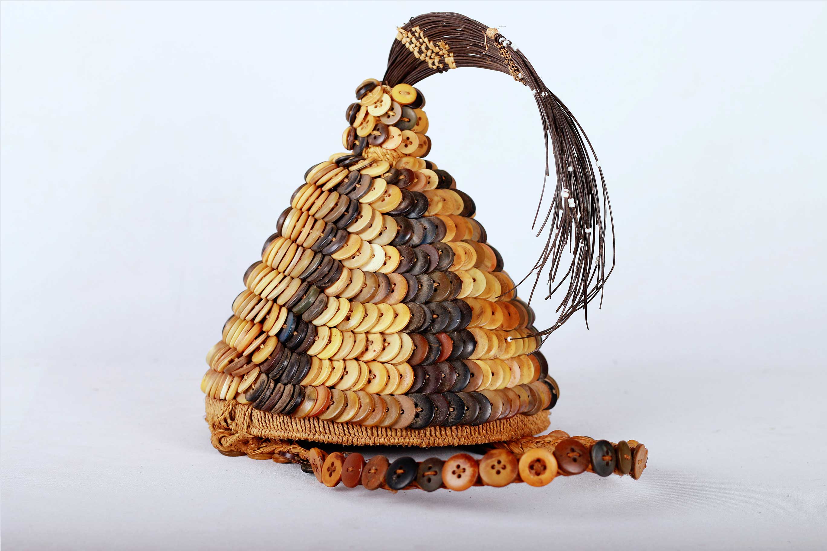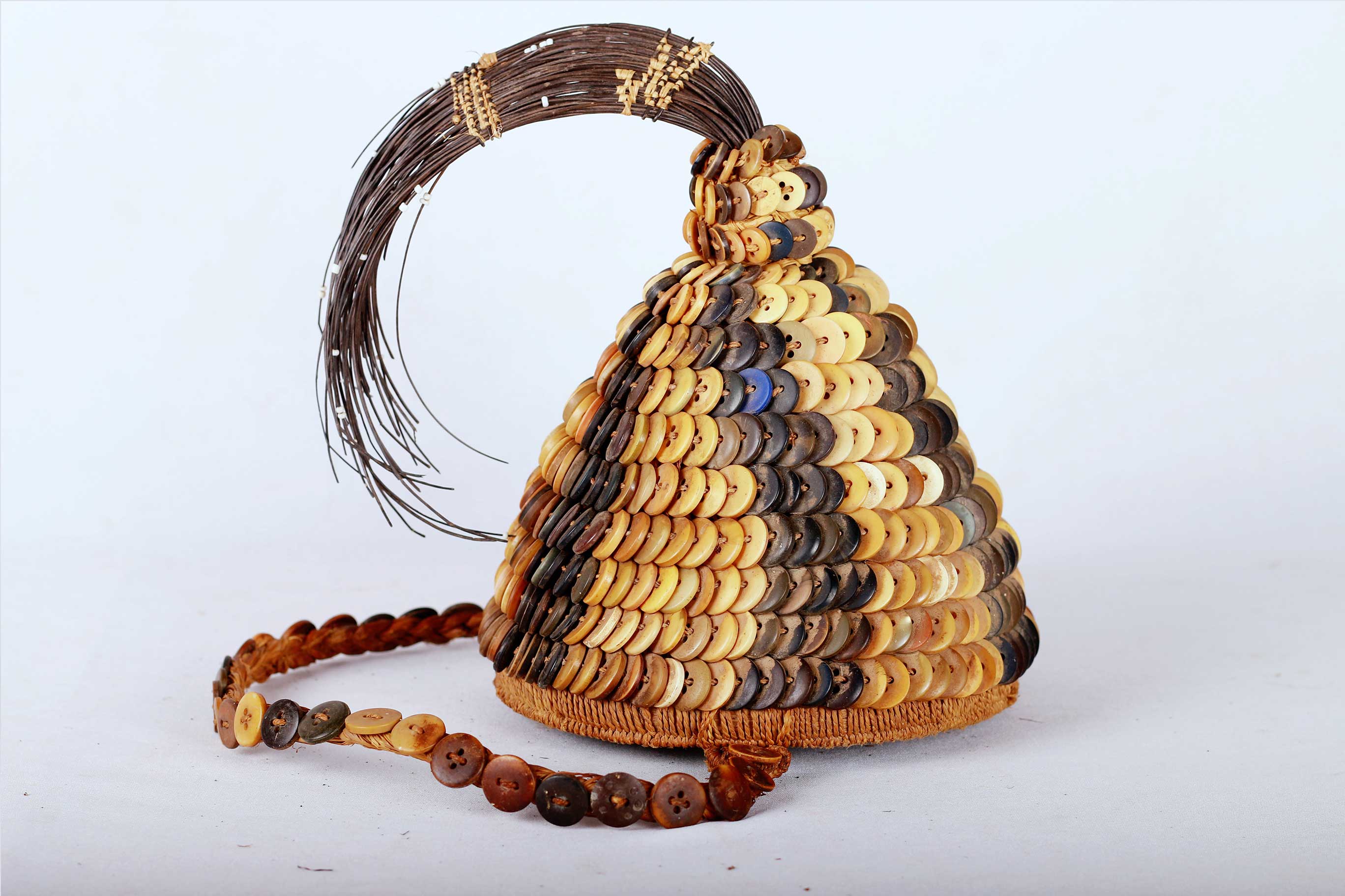 The hat was made in a basketry form with two layers of plant fiber both on the exterior and inner surface. The exterior is covered with glass or plastic buttons of different colors arranged in a beautiful pattern. The strap is decorated with brown and black buttons. The buttons are sewn on to the hat with coarse brown Z twist thread made from plant material. Sewn on to the crown of the hat is a bundle of elephant tail hair a metaphor for Kindi. This is an old piece with visible signs of age and good usage.