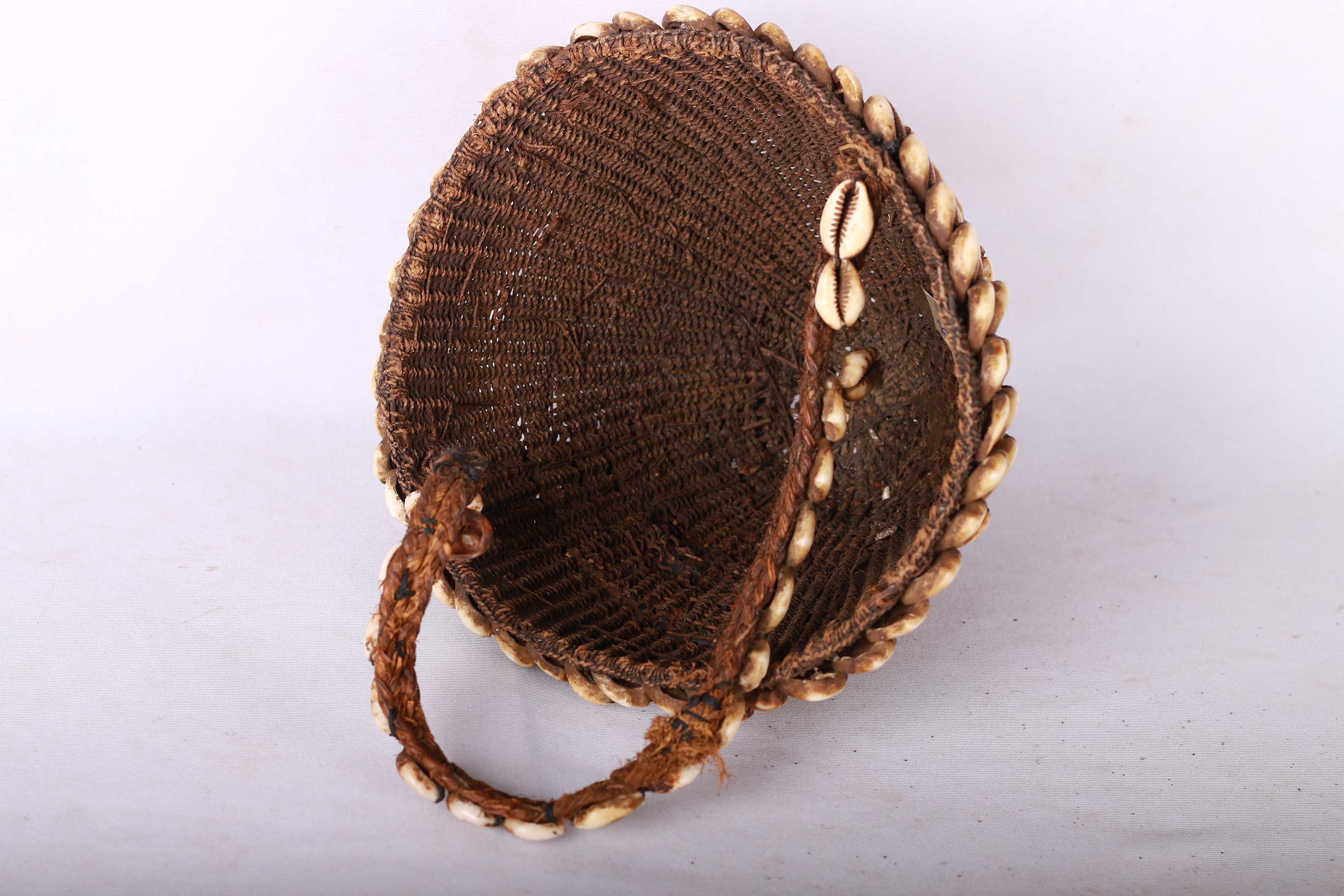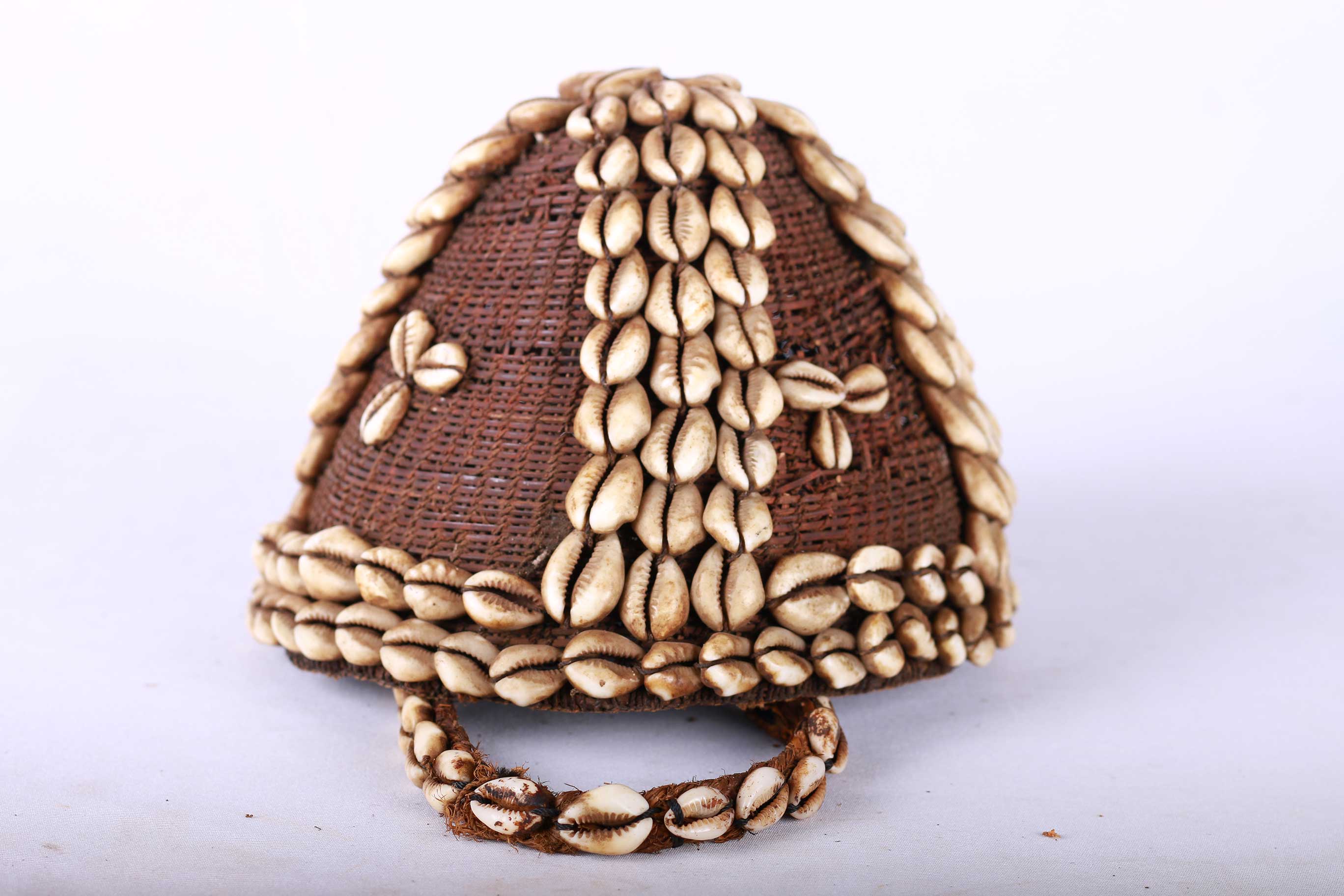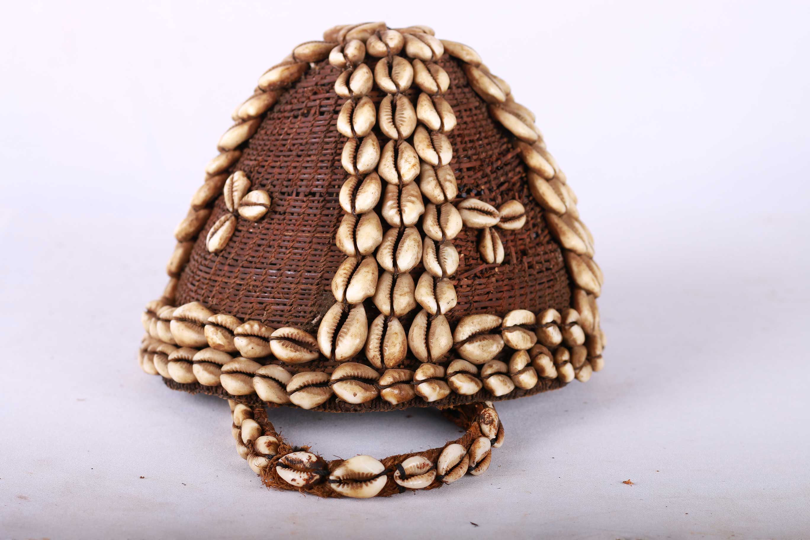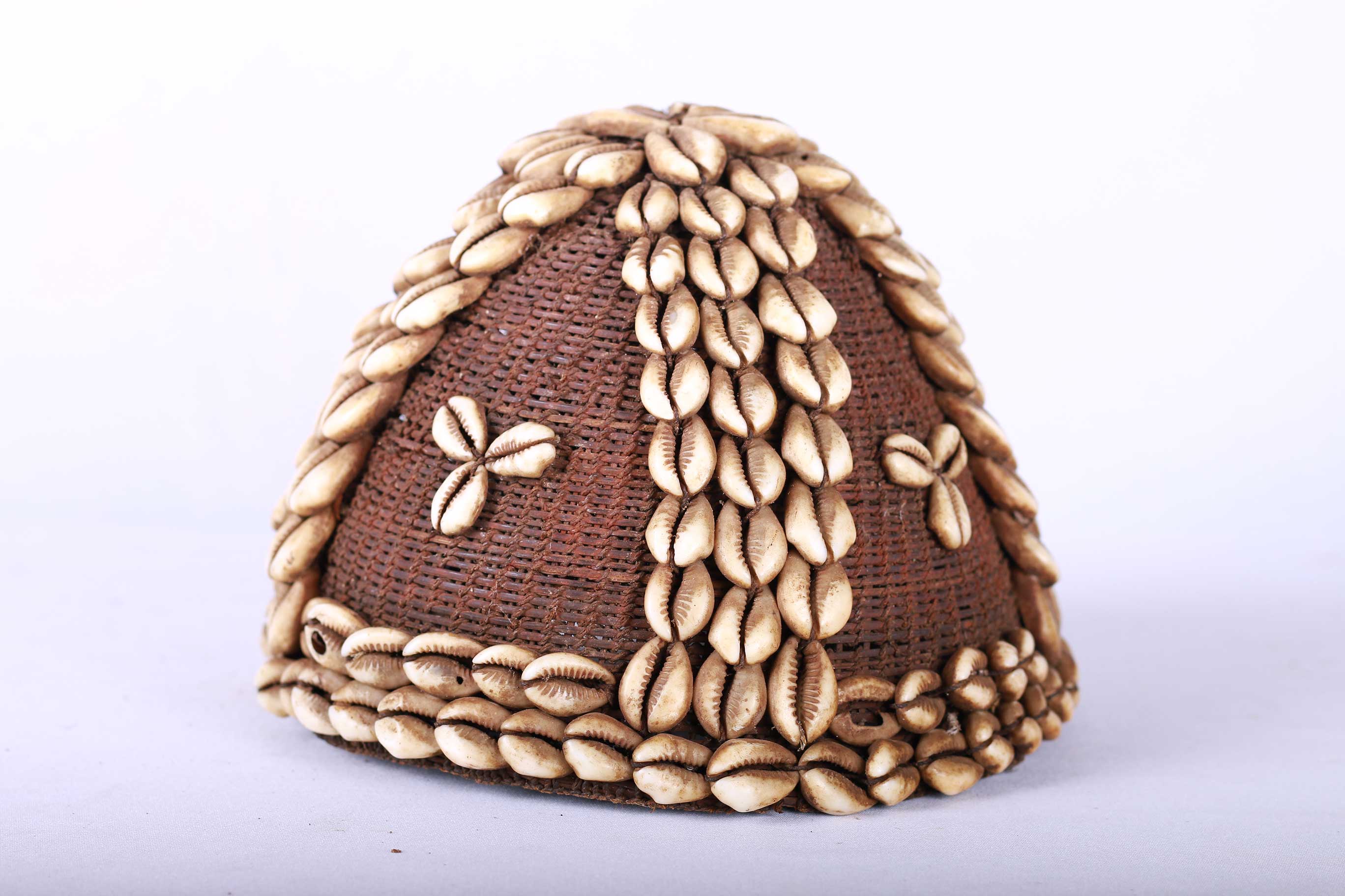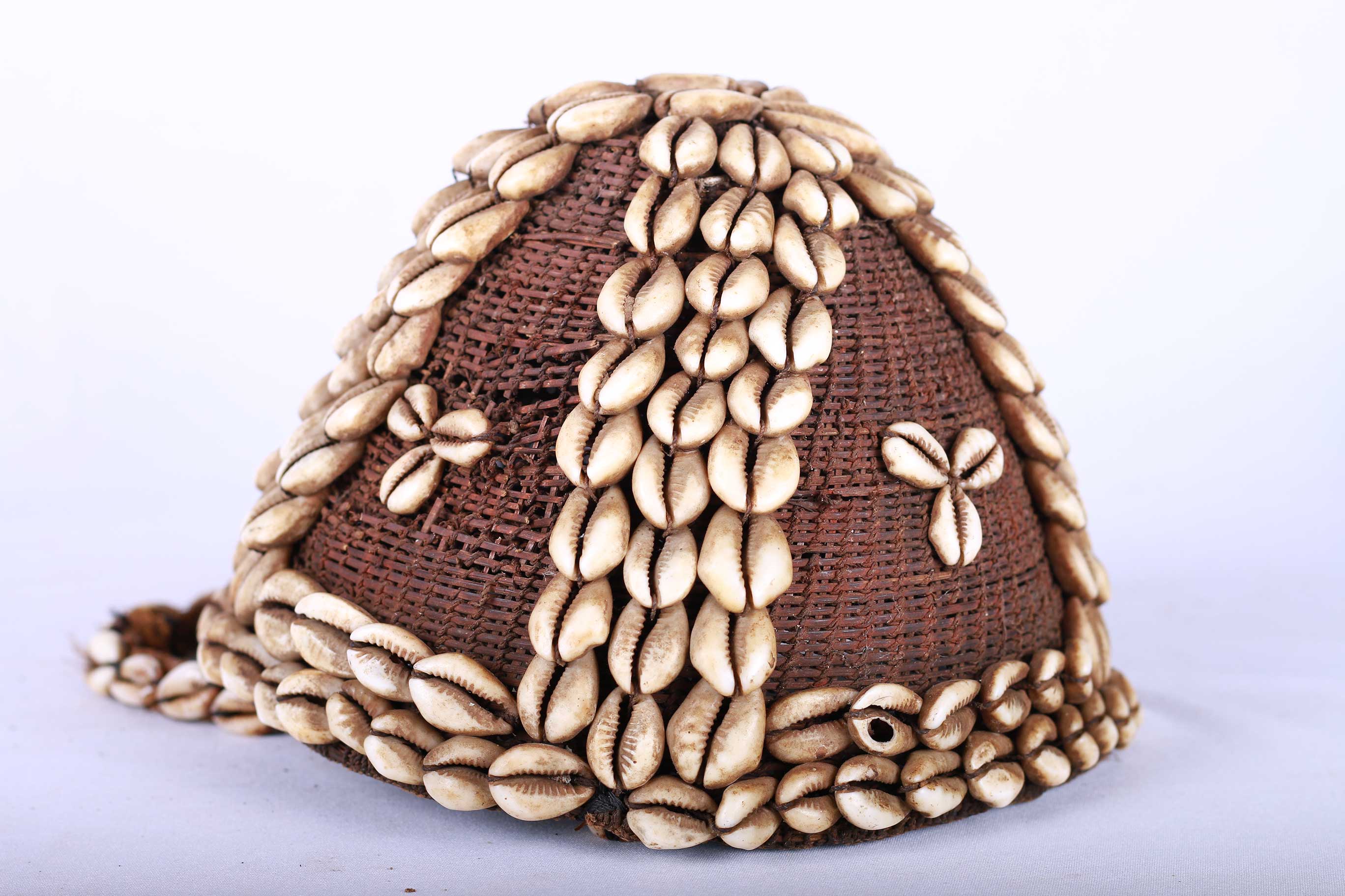 The hat was made in a basketry form with two layers of plant fiber both on the exterior and inner surface. The exterior is partly decorated with cowrie shells arranged in a beautiful pattern. The strap is decorated with cowrie shells. The cowrie shells are sewn on to the hat with coarse brown Z twist thread made from plant material. This is an old piece with visible signs of age and good usage.