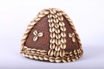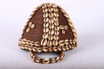 This ancient piece (a cowrie hat) originates from the Lega people. They are an ethnic group found in the Democratic Republic of Congo. All Lega art is used within the context of the Bwami society for the production of most Lega artwork. This hat could be worn by initiates to Kindi, the highest level of Bwami. Originally, cowrie shells were used on such prestige items before the growing influence of the western culture in Congo.
