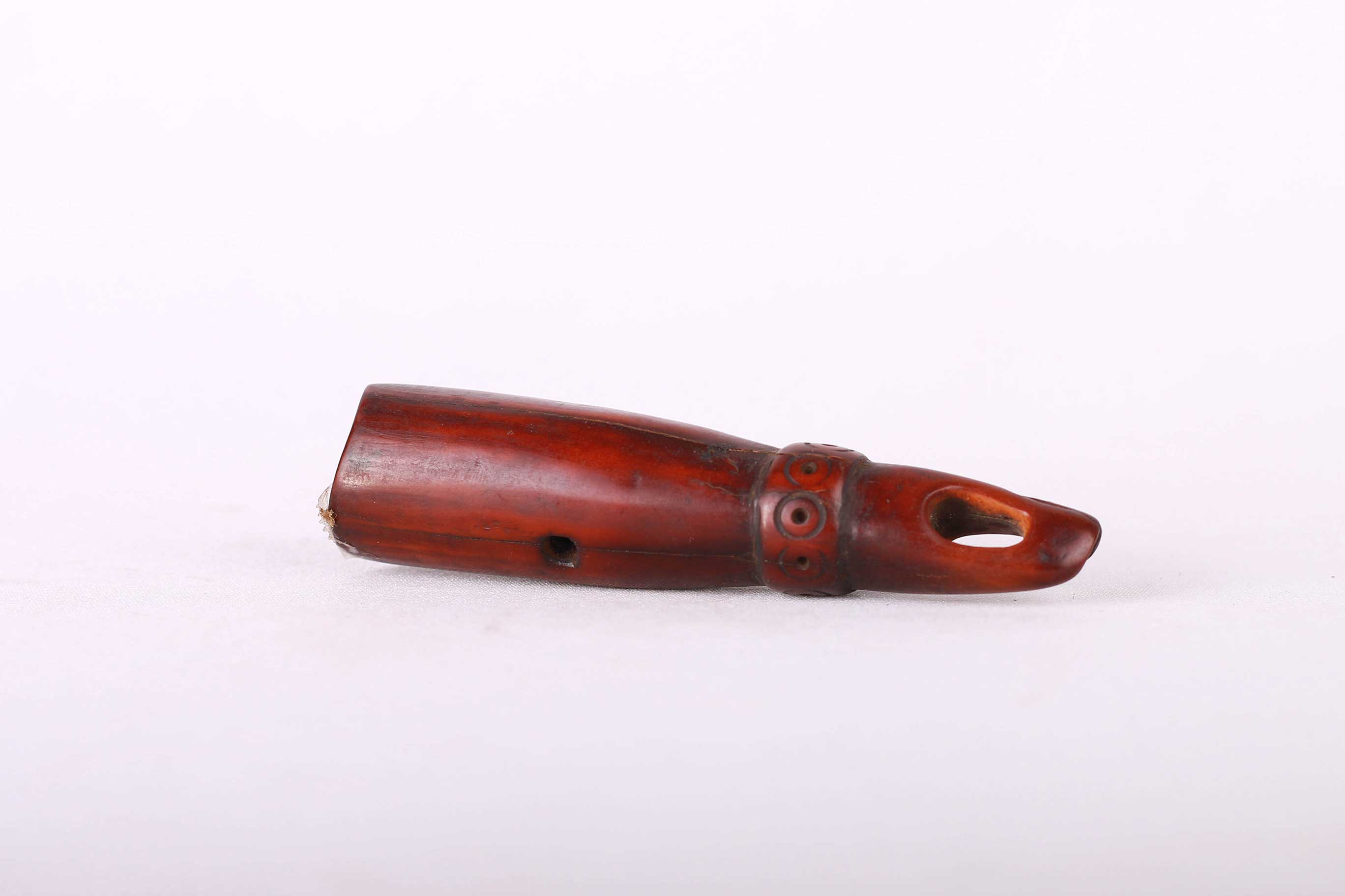 Only members of the “Kindi” level were allowed to possess such ivory figures. Each object was combined with special proverbs implying positive or negative meaning, depending on the context in which they were has been carved out of ivory in the form of a human. A hole has been drilled where the columnar neck terminates, allowing this pendant to be strung upon a necklace. Stylistically, the face is characteristic of the Lega style, including eyes represented by two concentric circles, a motif repeated along the sides of the neck. Such a pendant may have served as decoration distinguishing the wearer as someone of wealth and taste. Alternately, it may have had a religious or ceremonial function. It has a brown colouration, light in weight and looks physically old with traces of usage.