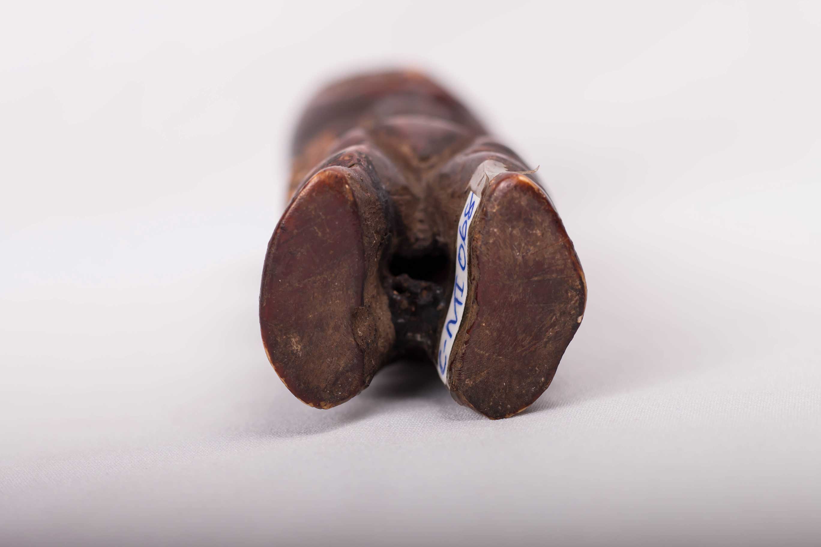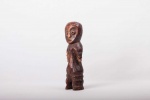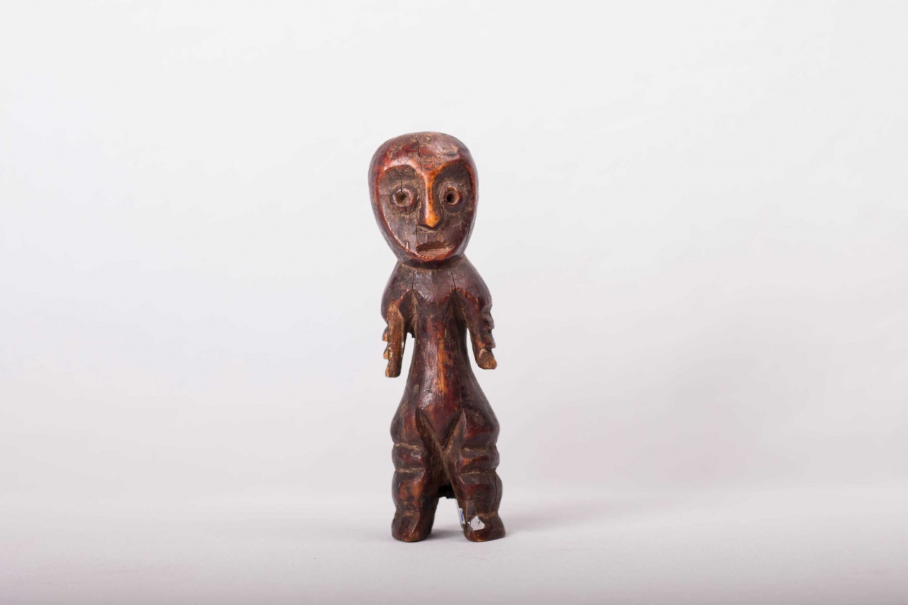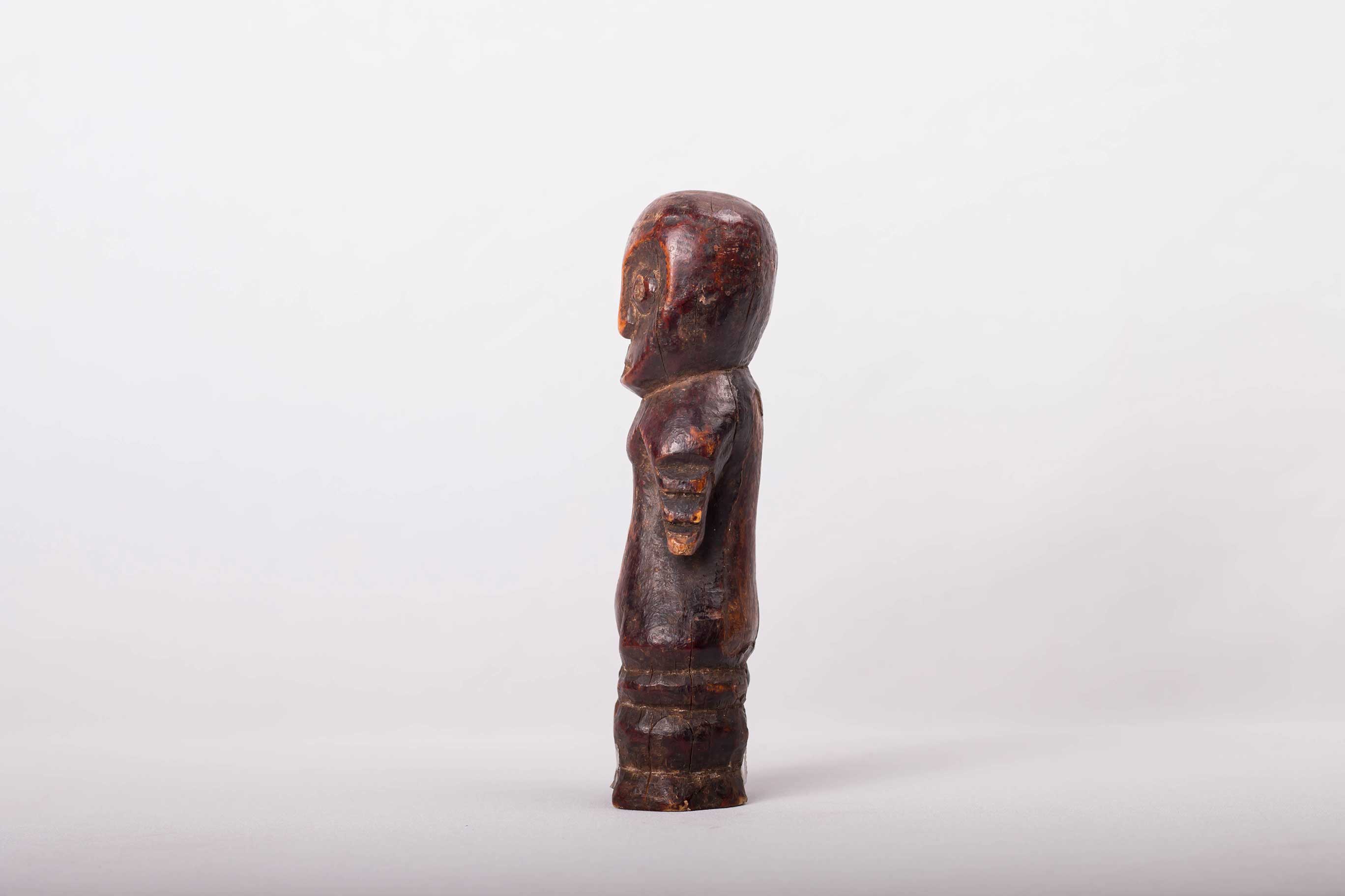 Some Lega figurative sculptures use flatness to illustrate the feminine posture of moral and social goodness. Lega figures are individually owned by the highest-ranking society members, are the most coveted of all initiation objects. Some anthropomorphic figures are called kalimbangoma. Each member of a sublevel of the highest Bwami rank owns an ivory human kalimbangoma figure as a sign of his status. The following statue has a dark brown patina and is visibly old.