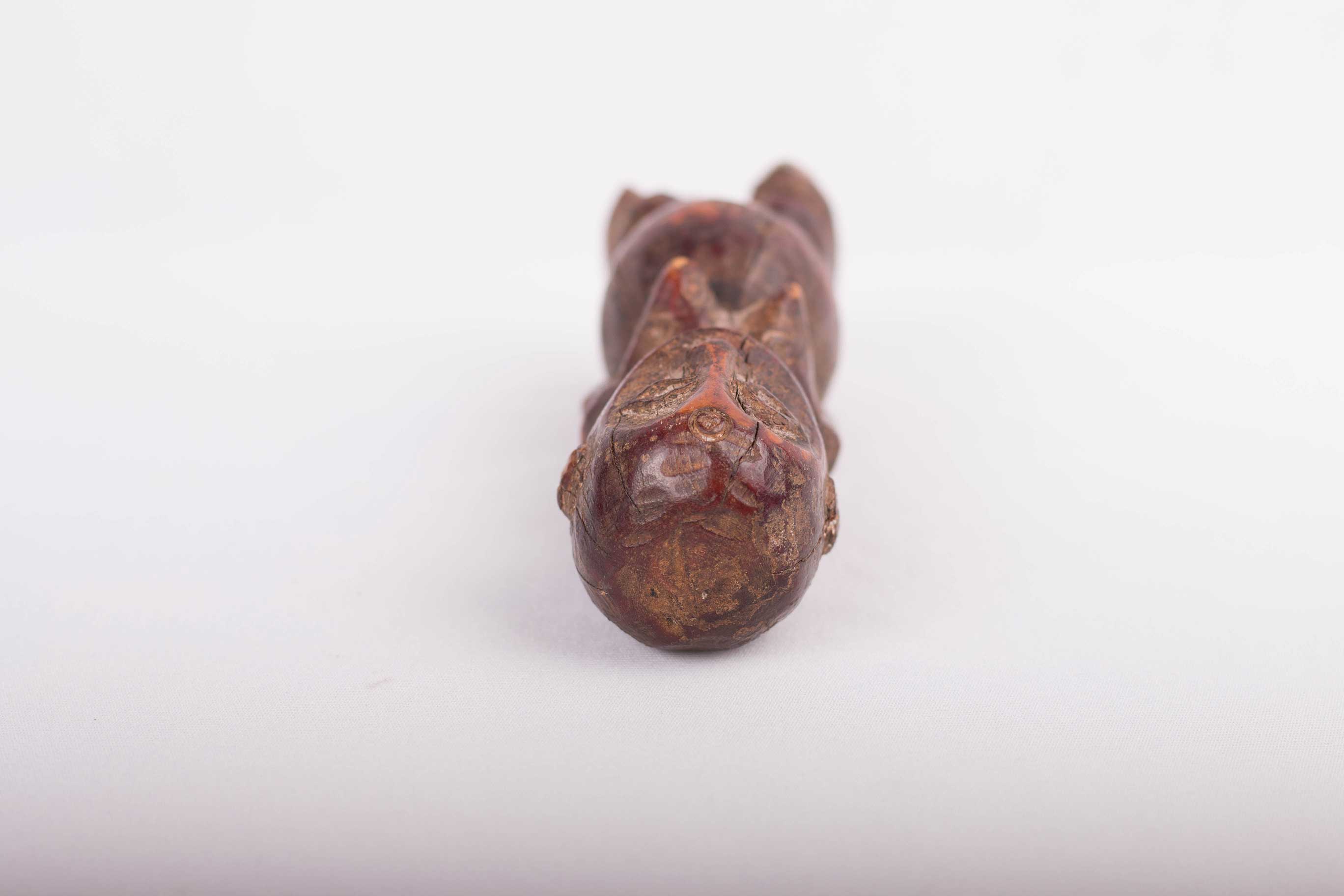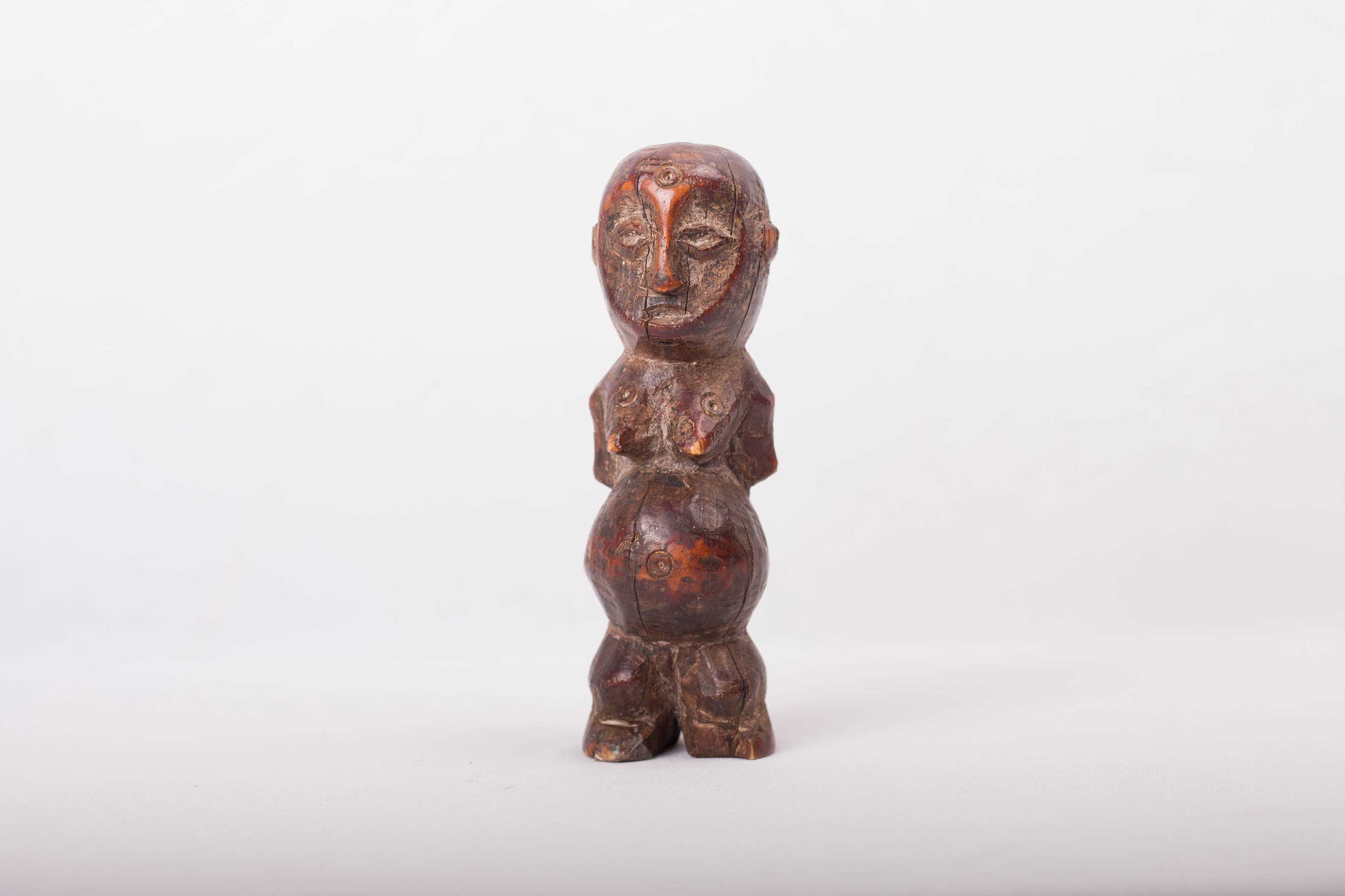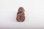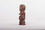 Some Lega figurative sculptures use flatness to illustrate the feminine posture of moral and social goodness. Lega figures are individually owned by the highest-ranking society members, are the most coveted of all initiation objects. Some anthropomorphic figures are called kalimbangoma. Each member of a sublevel of the highest Bwami rank owns an ivory human kalimbangoma figure as a sign of his status. The following statue has a dark brown patina and is visibly old.