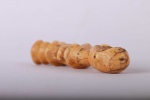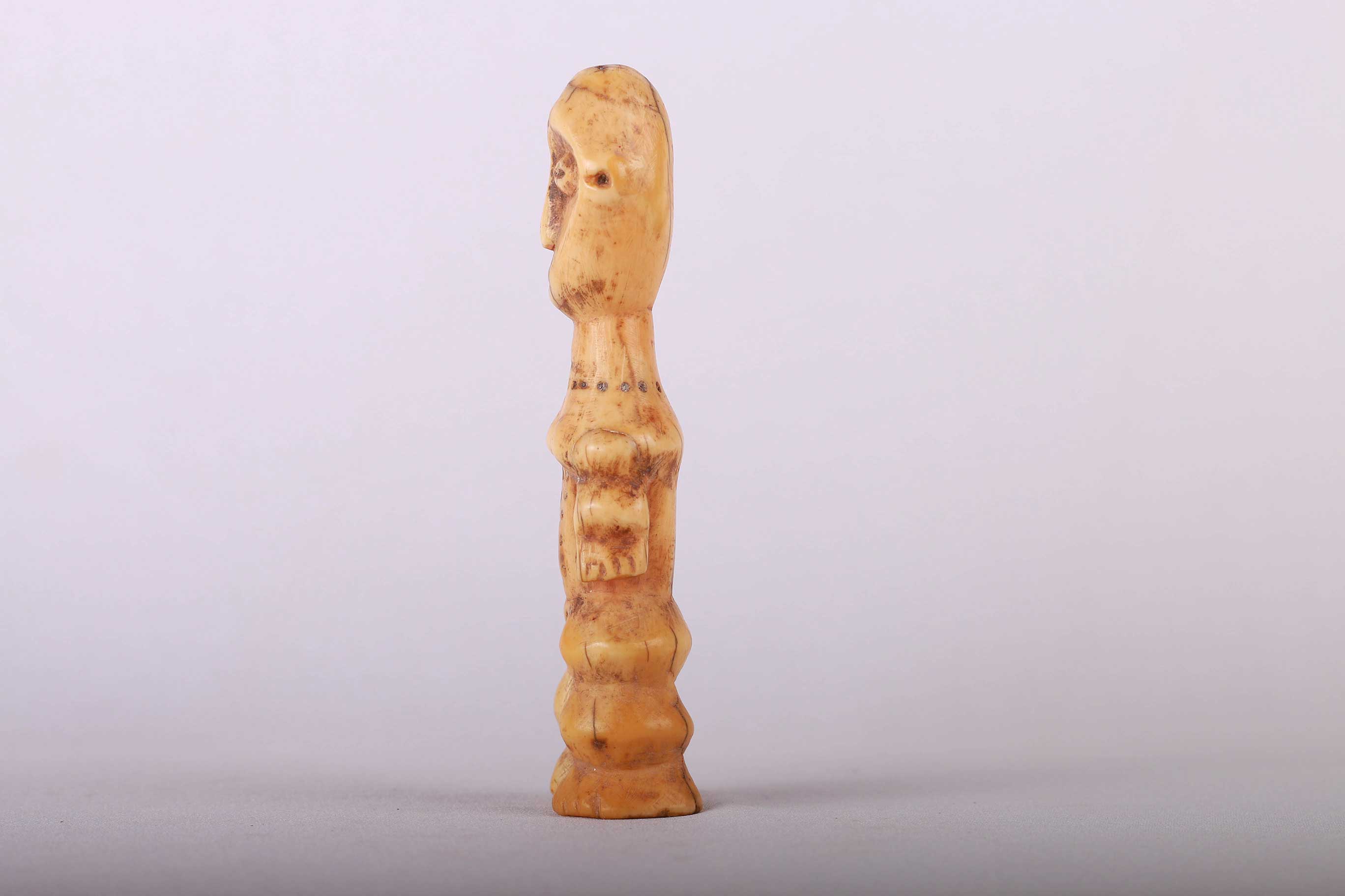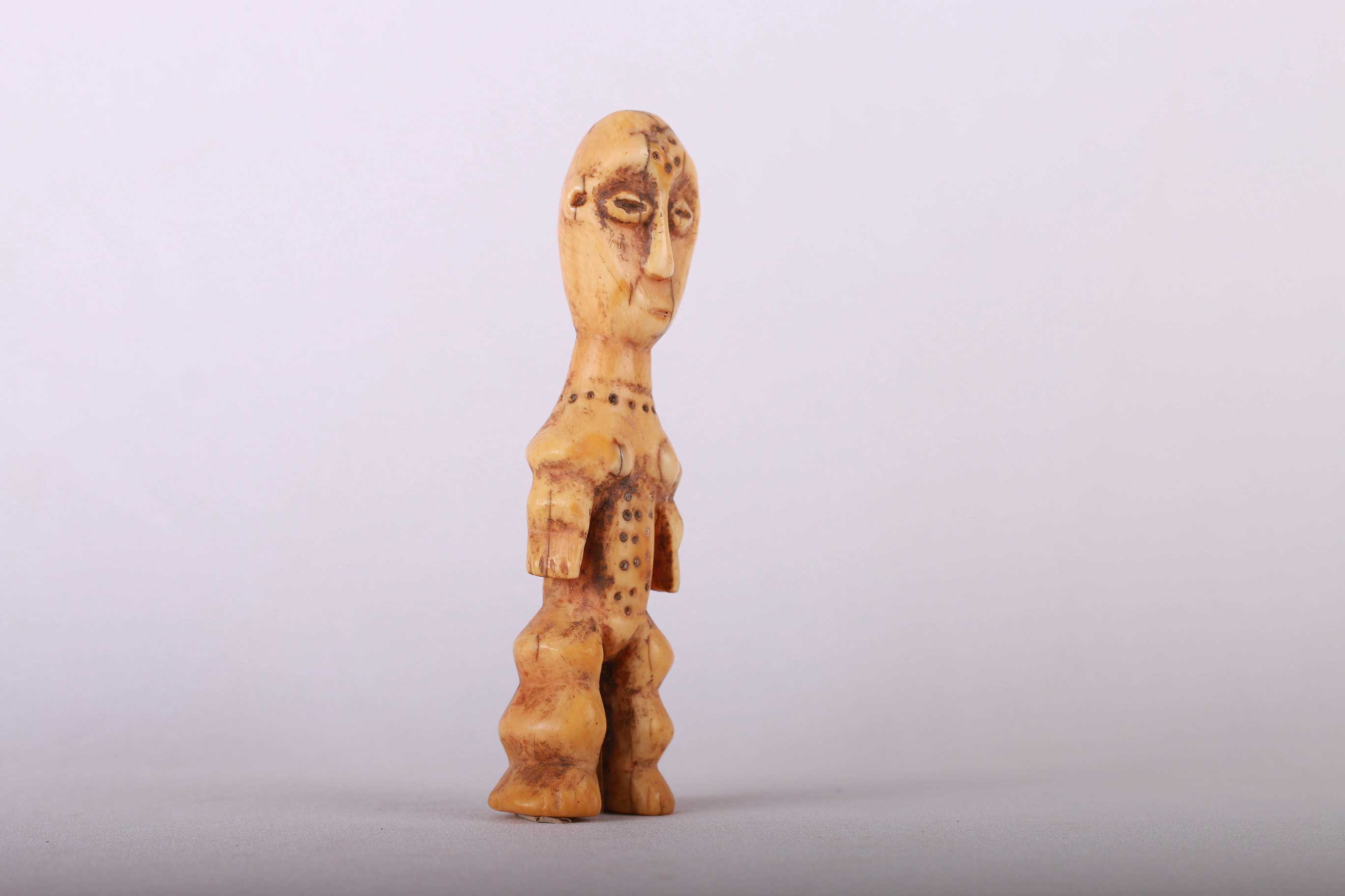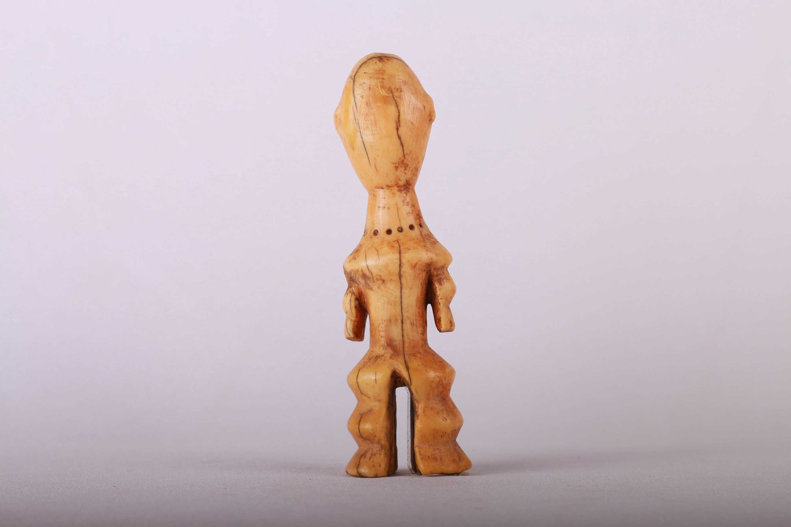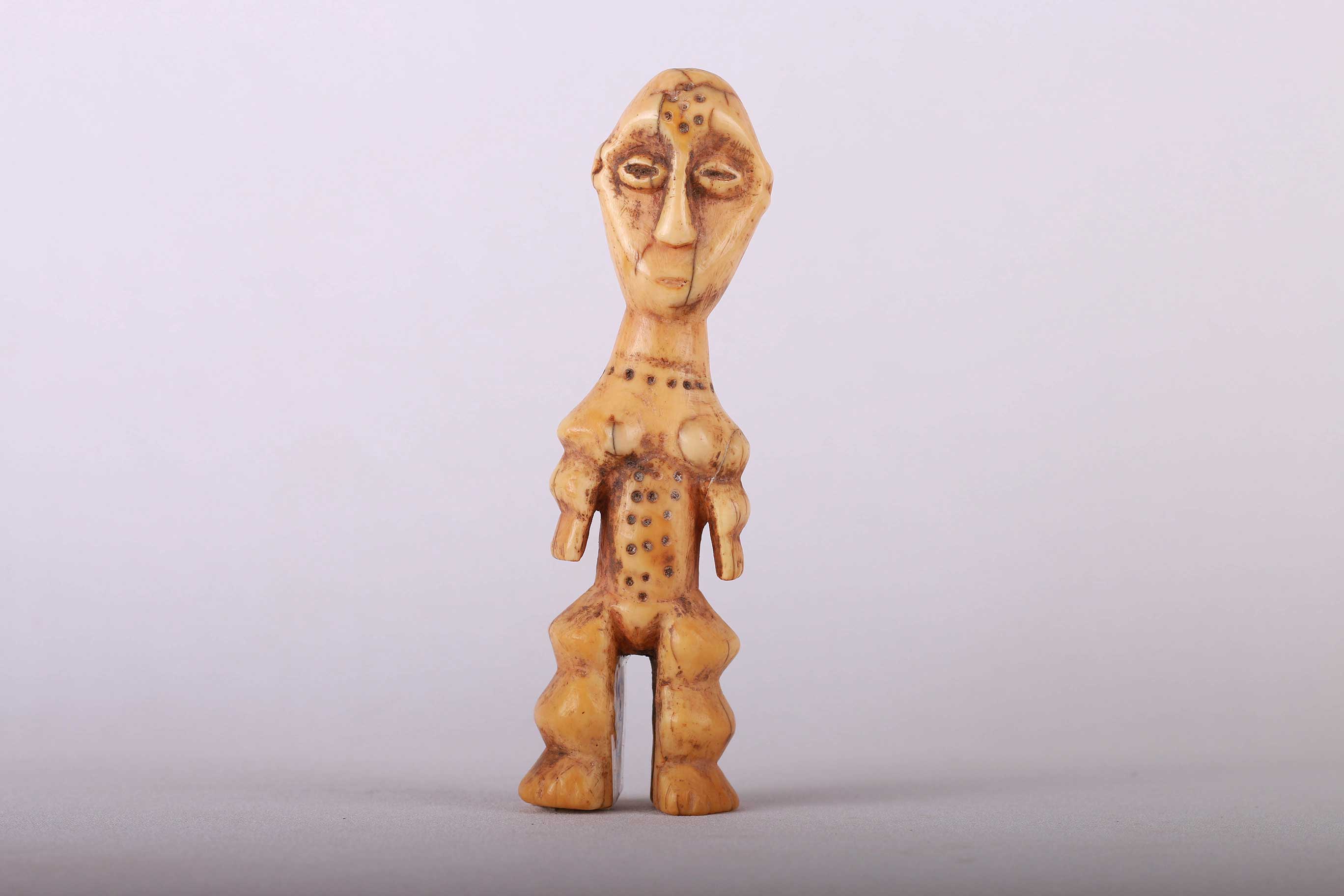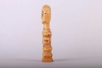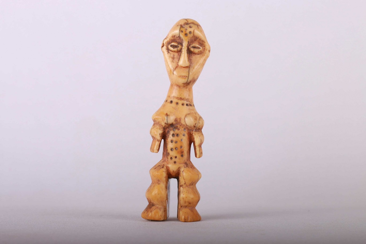Some Lega figurative sculptures use flatness to illustrate the feminine posture of moral and social goodness. Lega figures are individually owned by the highest-ranking society members, are the most coveted of all initiation objects. Some anthropomorphic figures are called Kalimbangoma. Each member of a sublevel of the highest Bwami rank owns an ivory human kalimbangoma figure as a sign of his status. The following statue has a light brown patina and is visibly old.