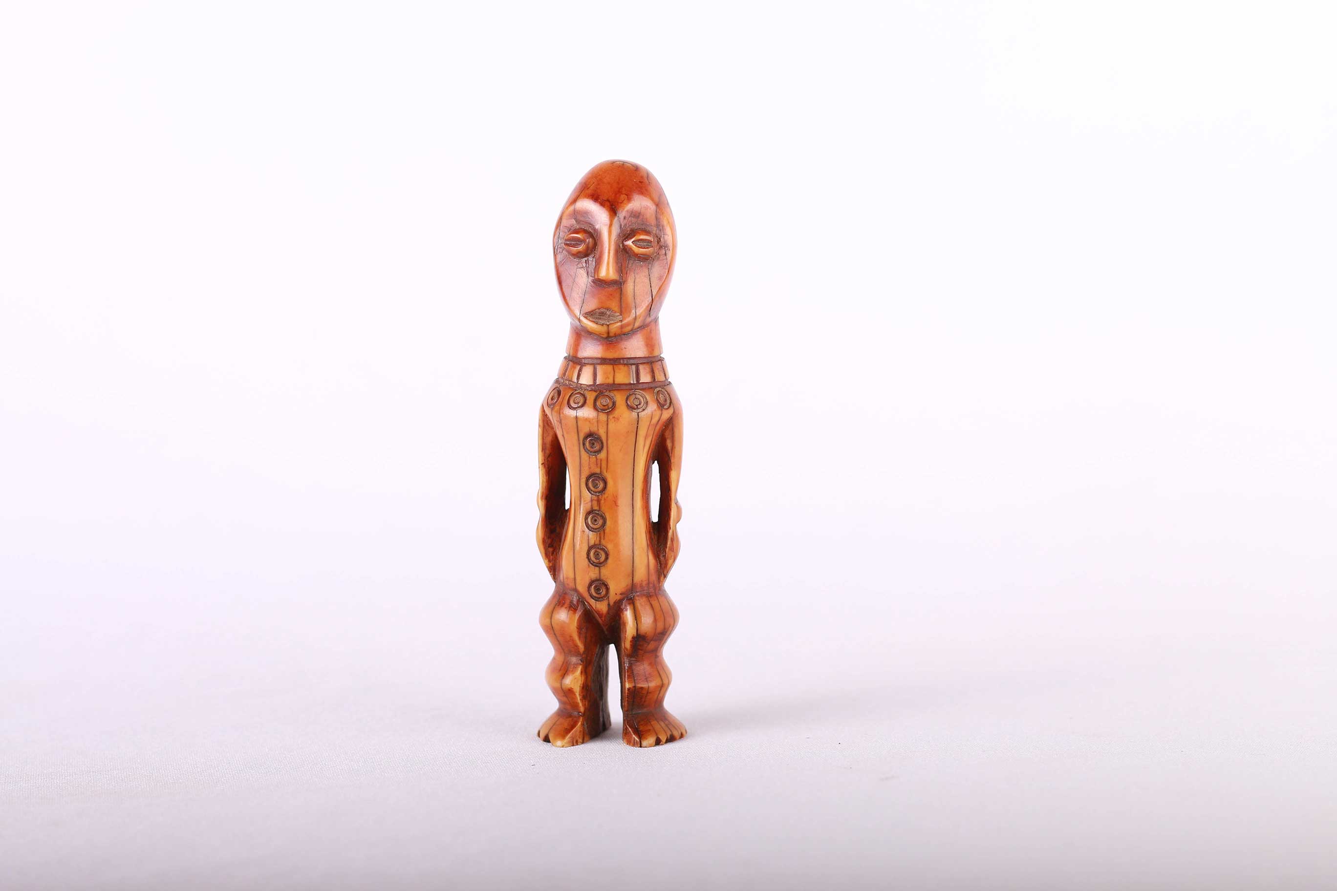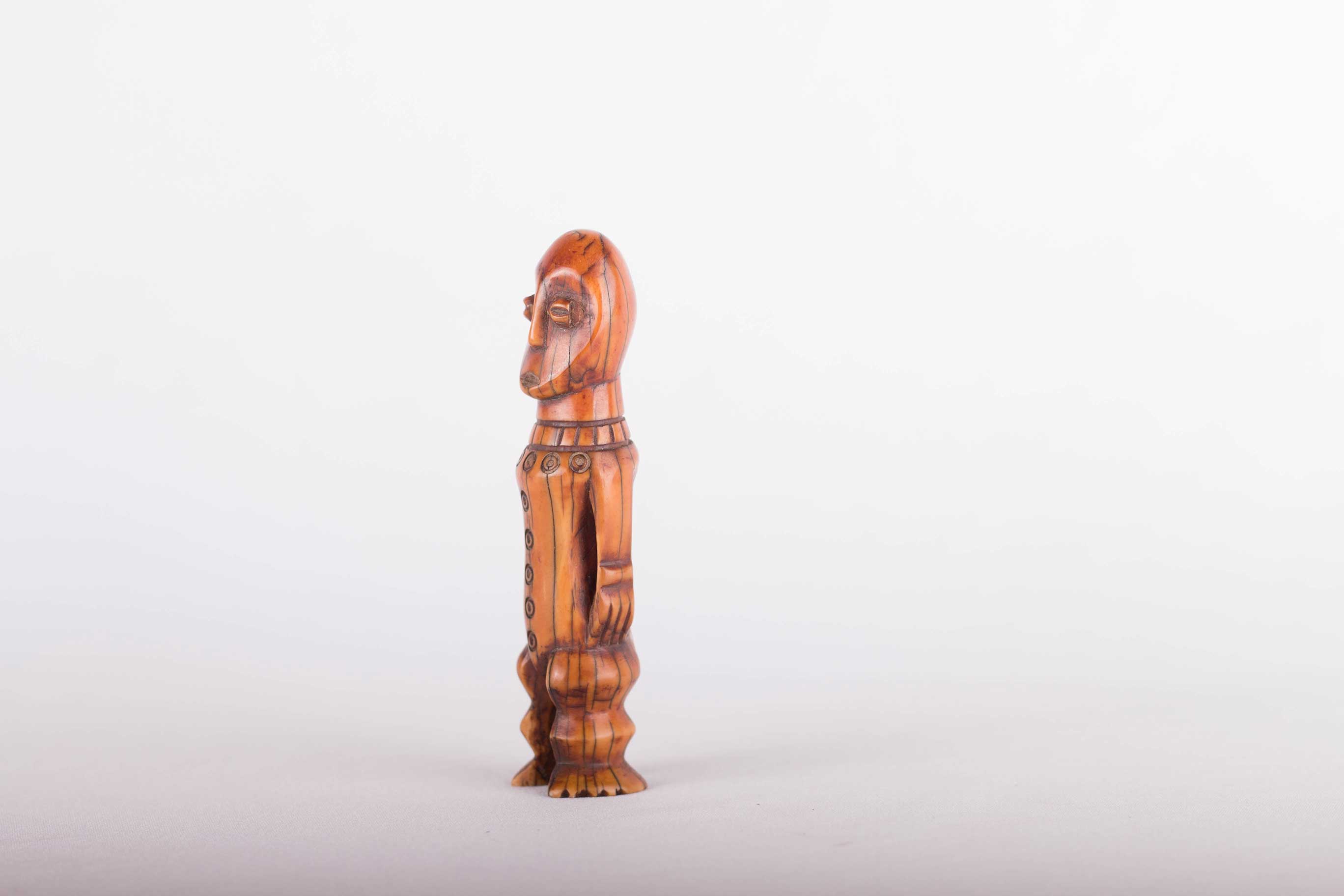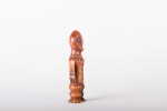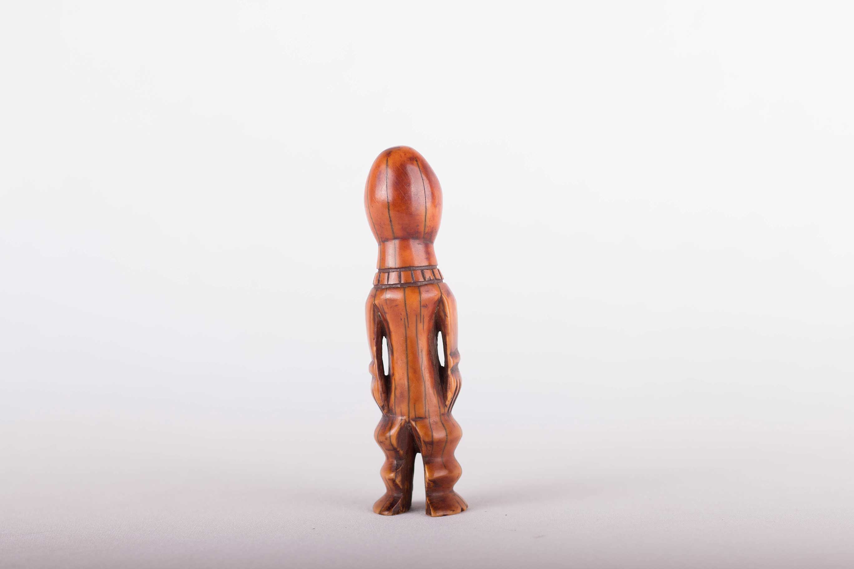 Some Lega figurative sculptures use flatness to illustrate the feminine posture of moral and social goodness. Lega figures are individually owned by the highest-ranking society members, are the most coveted of all initiation objects. Some anthropomorphic figures are called kalimbangoma. Each member of a sublevel of the highest Bwami rank owns an ivory human kalimbangoma figure as a sign of his status. The following statue has a light brown patina and is visibly old.