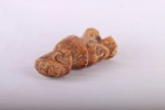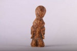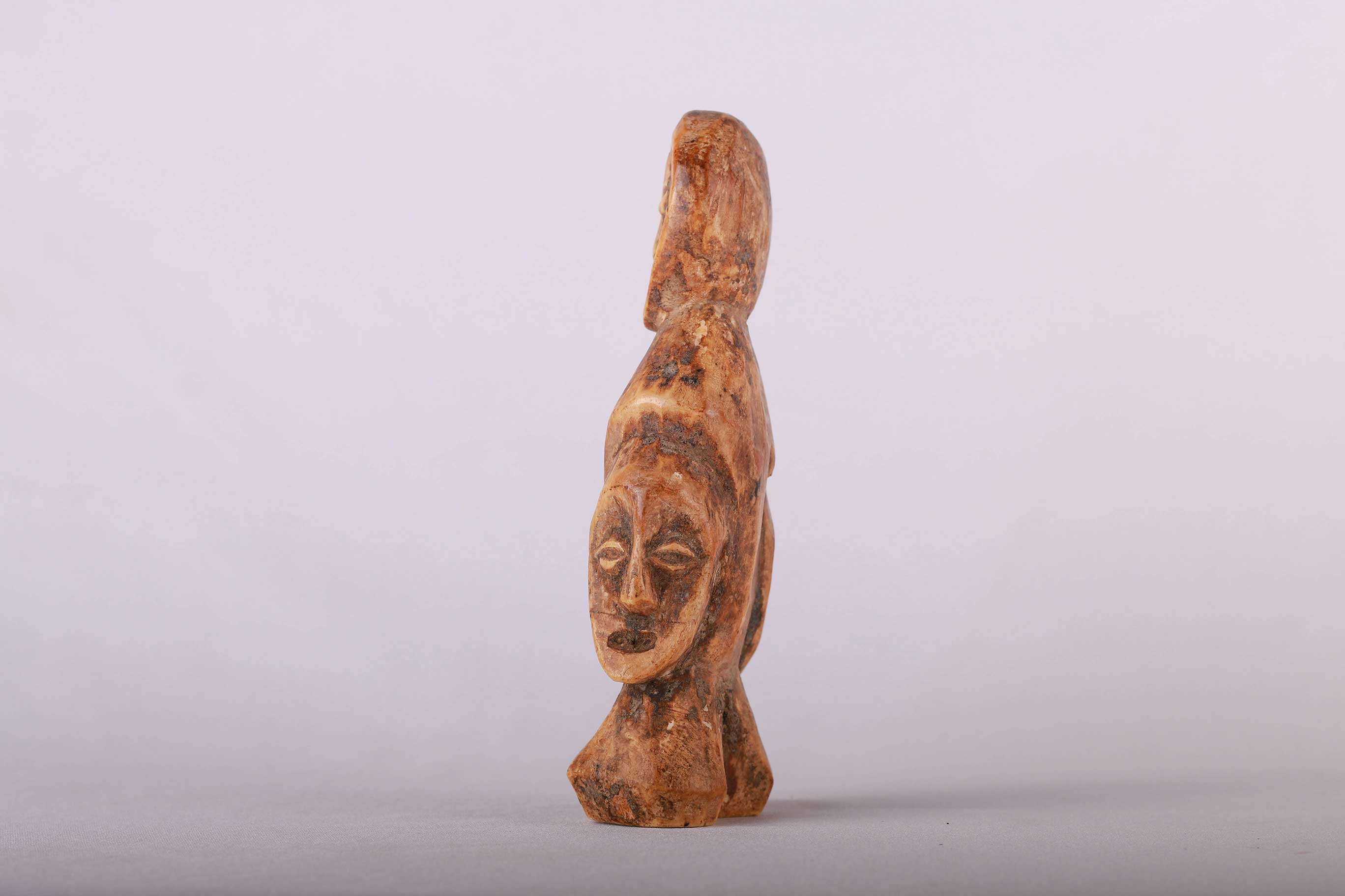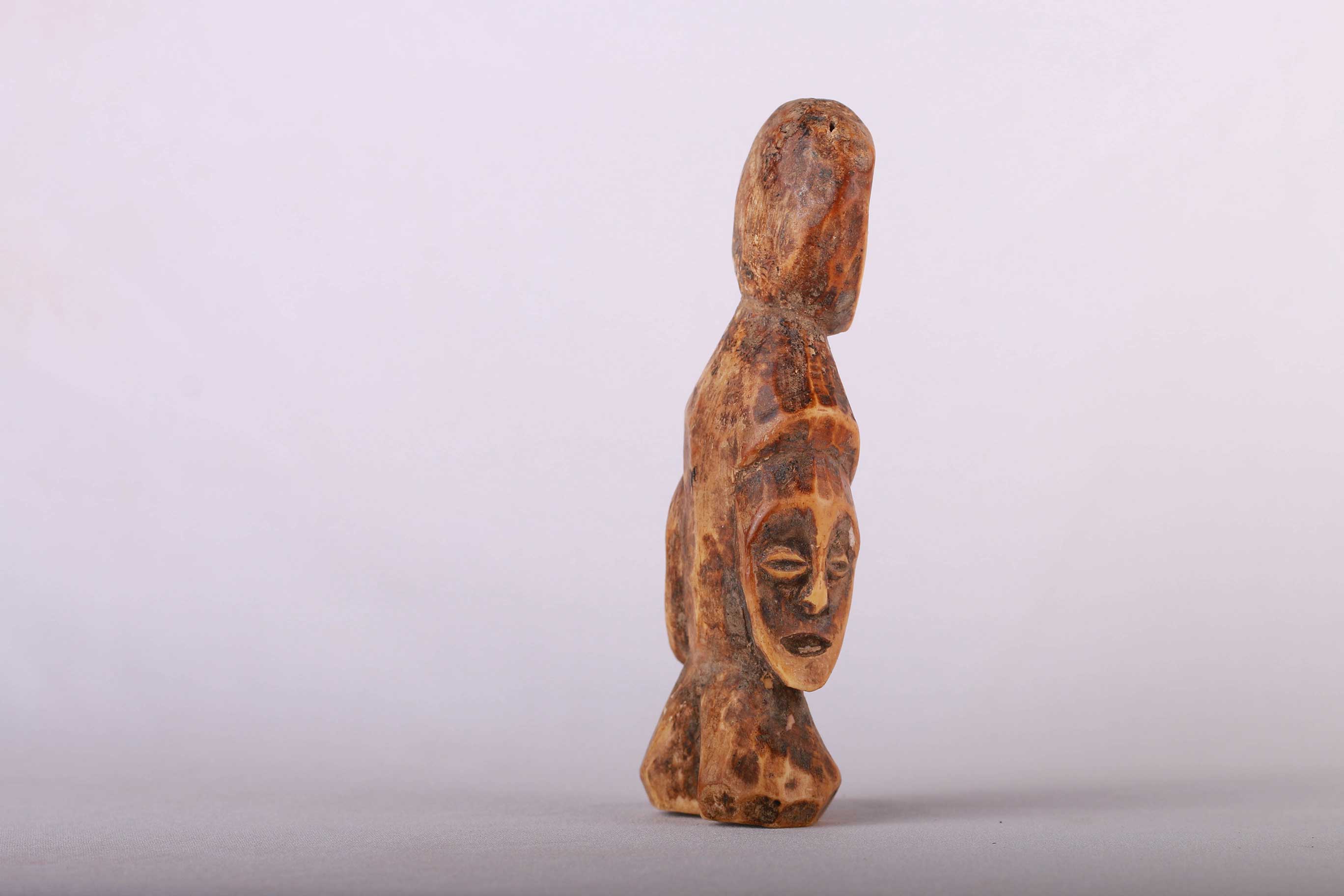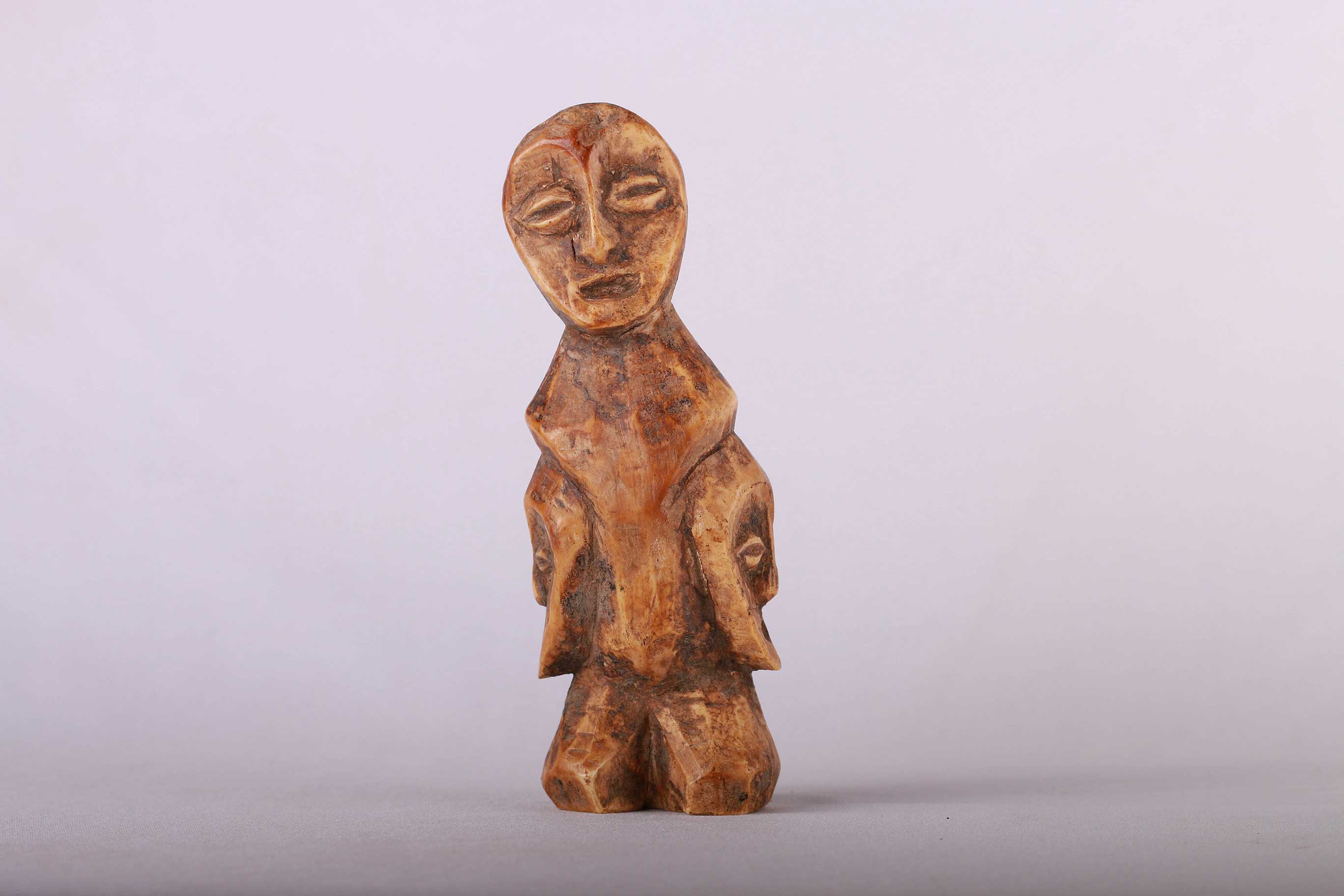 Some Lega figurative sculptures use flatness to illustrate the feminine posture of moral and social goodness. Lega figures are individually owned by the highest-ranking society members, are the most coveted of all initiation objects. Some anthropomorphic figures are called kalimbangoma. Each member of a sublevel of the highest Bwami rank owns an ivory human kalimbangoma figure as a sign of his status. The following statue has a light brown patina and is visibly old.