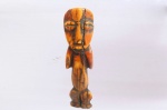 Some Lega figurative sculptures use flatness to illustrate the feminine posture of moral and social goodness. Lega figures were individually owned by the highest-ranking society members, they are the most coveted of all initiation objects. Each member of a sublevel of the highest Bwami rank owned an ivory human kalimbangoma figure as a sign of status. The following statue has a light brown patina, shows signs of wear due to old age and natural abrasion.