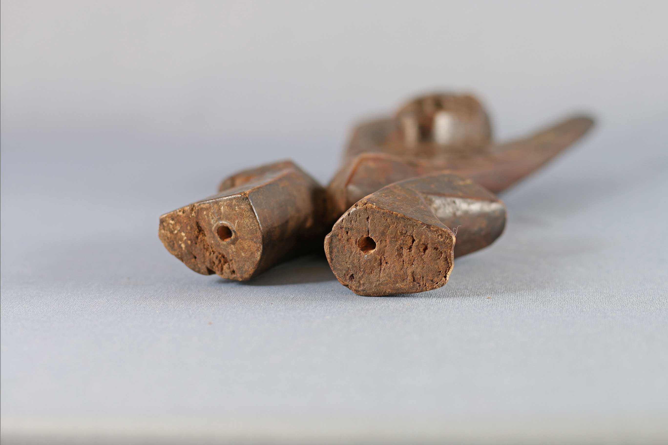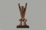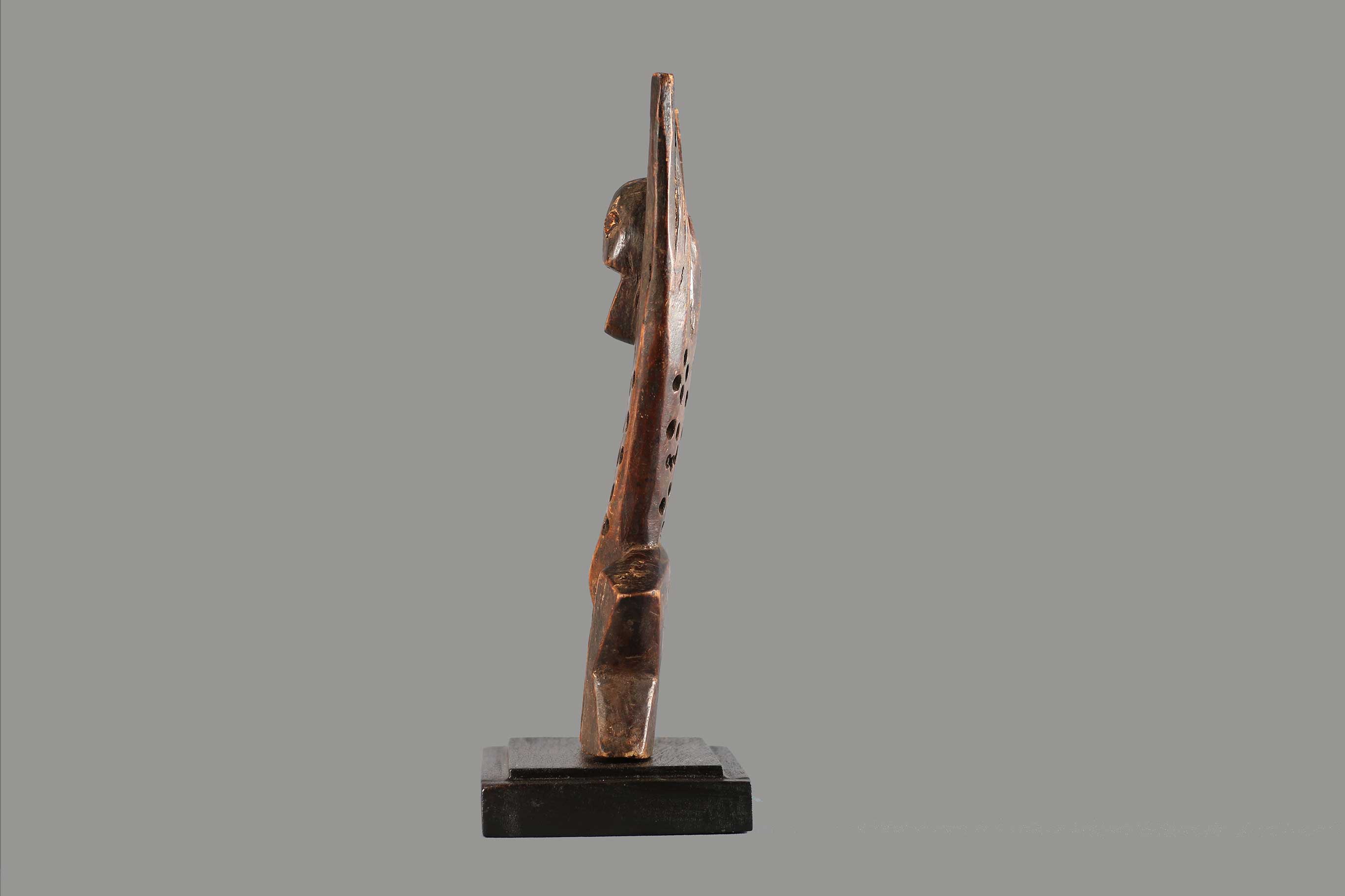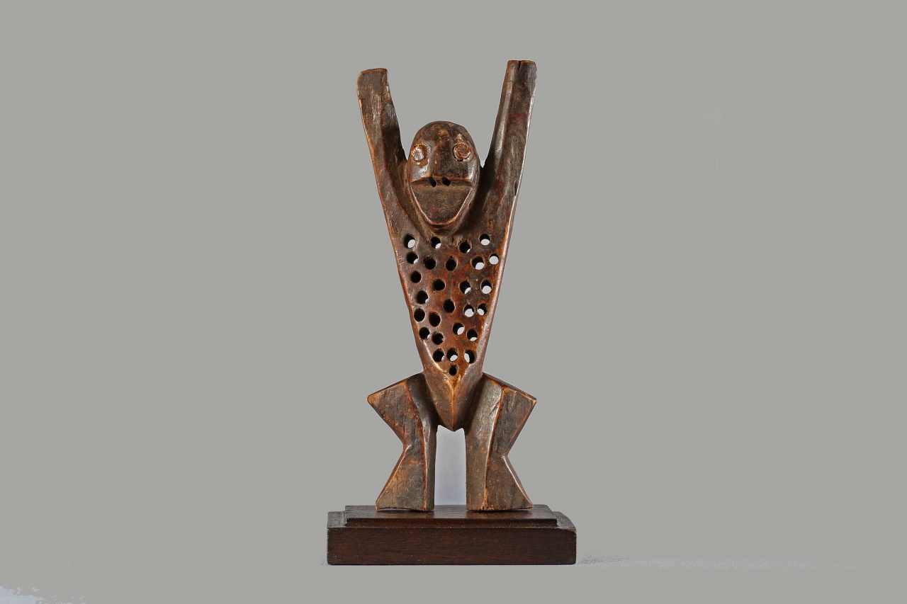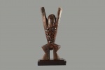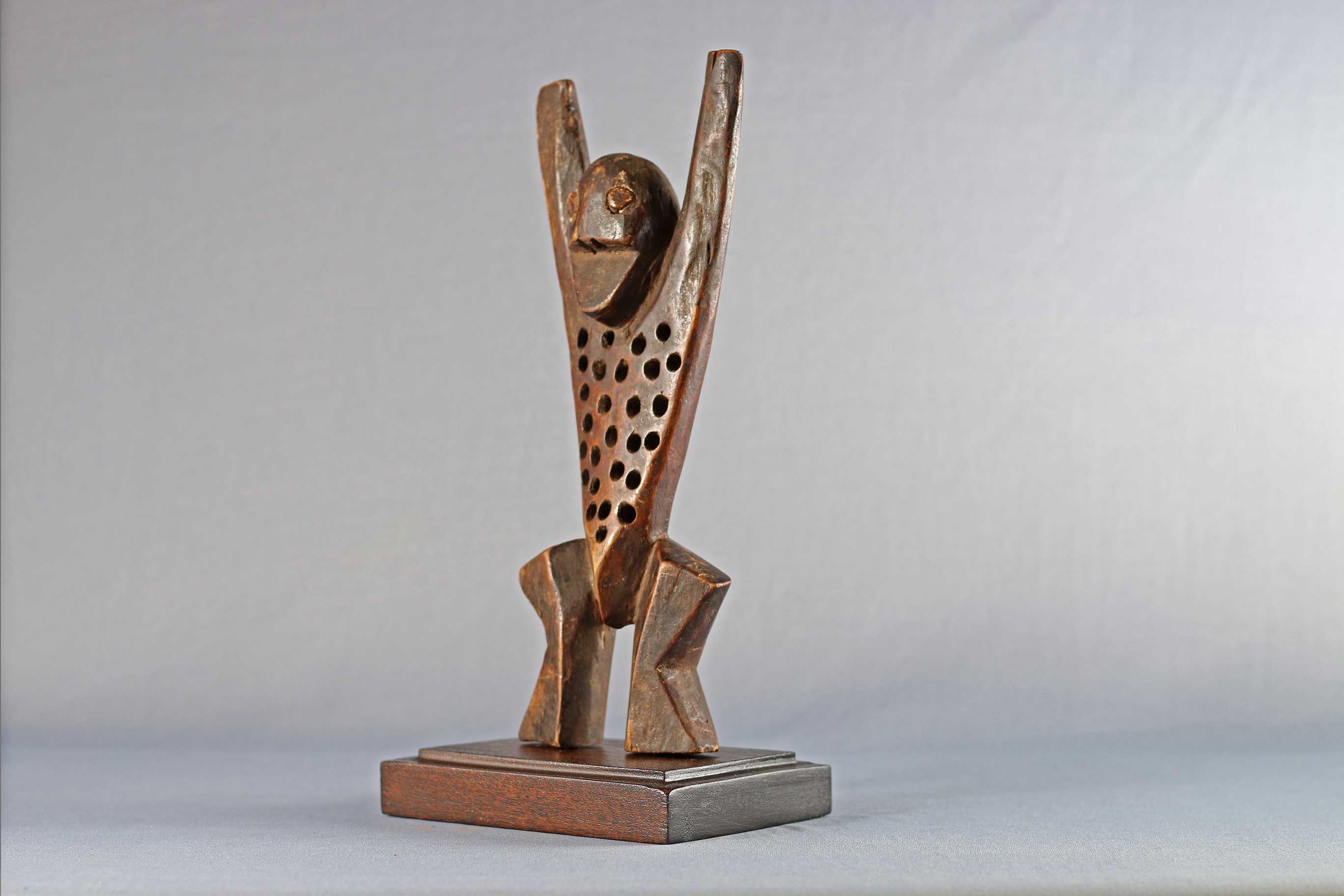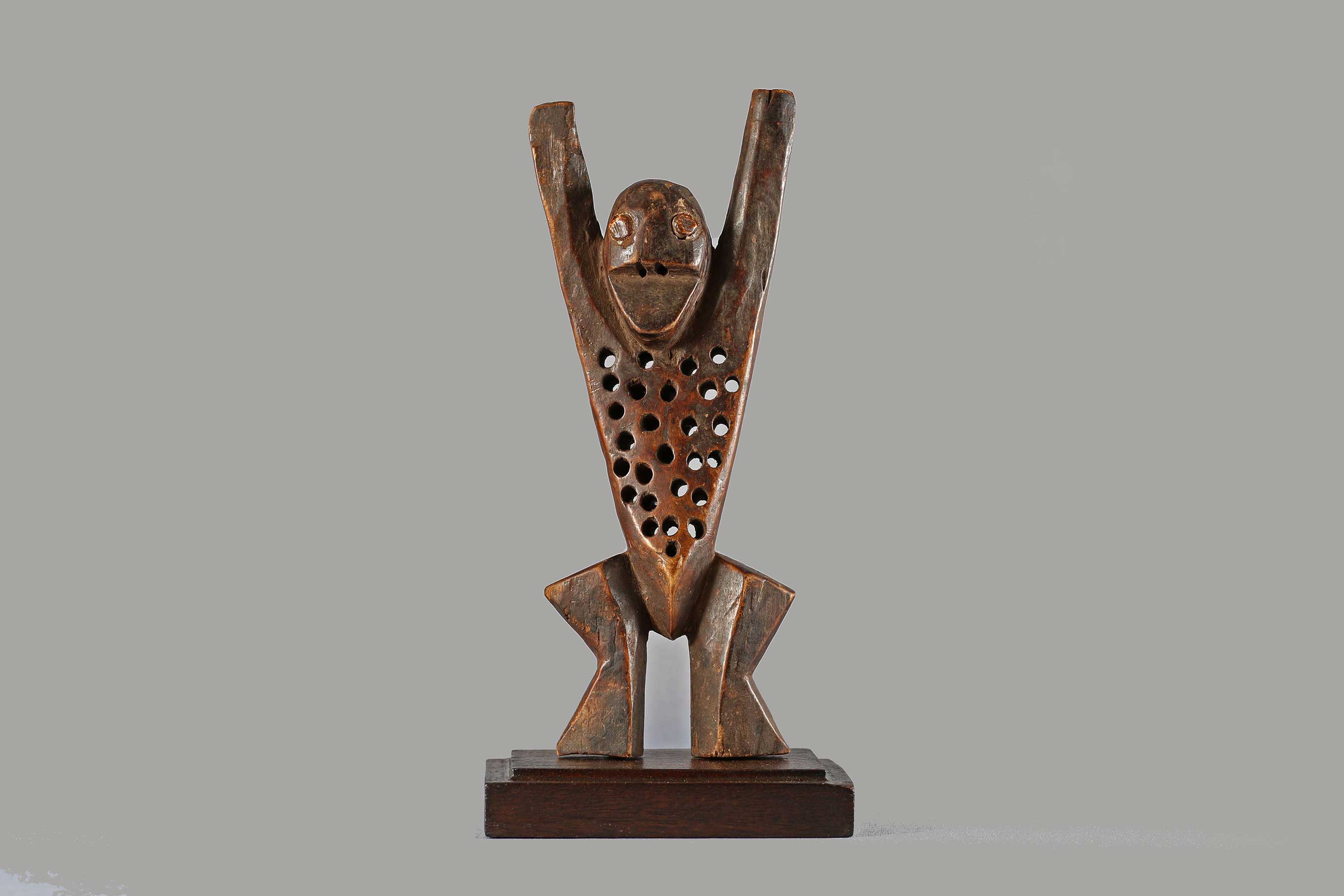The Lega Katanda in the eastern part of the Democratic Republic of Congo along the Lualaba River. This Katanda or sleeping mat sculpture represents an adulterous woman who mocks the rules of a high ranking official of the Bwami. They were also used to represent laziness and sexual promiscuity to teach moral lessons to the community. This figure has a flat body pierced with holes and arms spread out wide. This sculpture is carved out of light wood with a dark patina and signs of old age due to much usage.