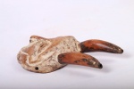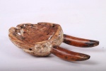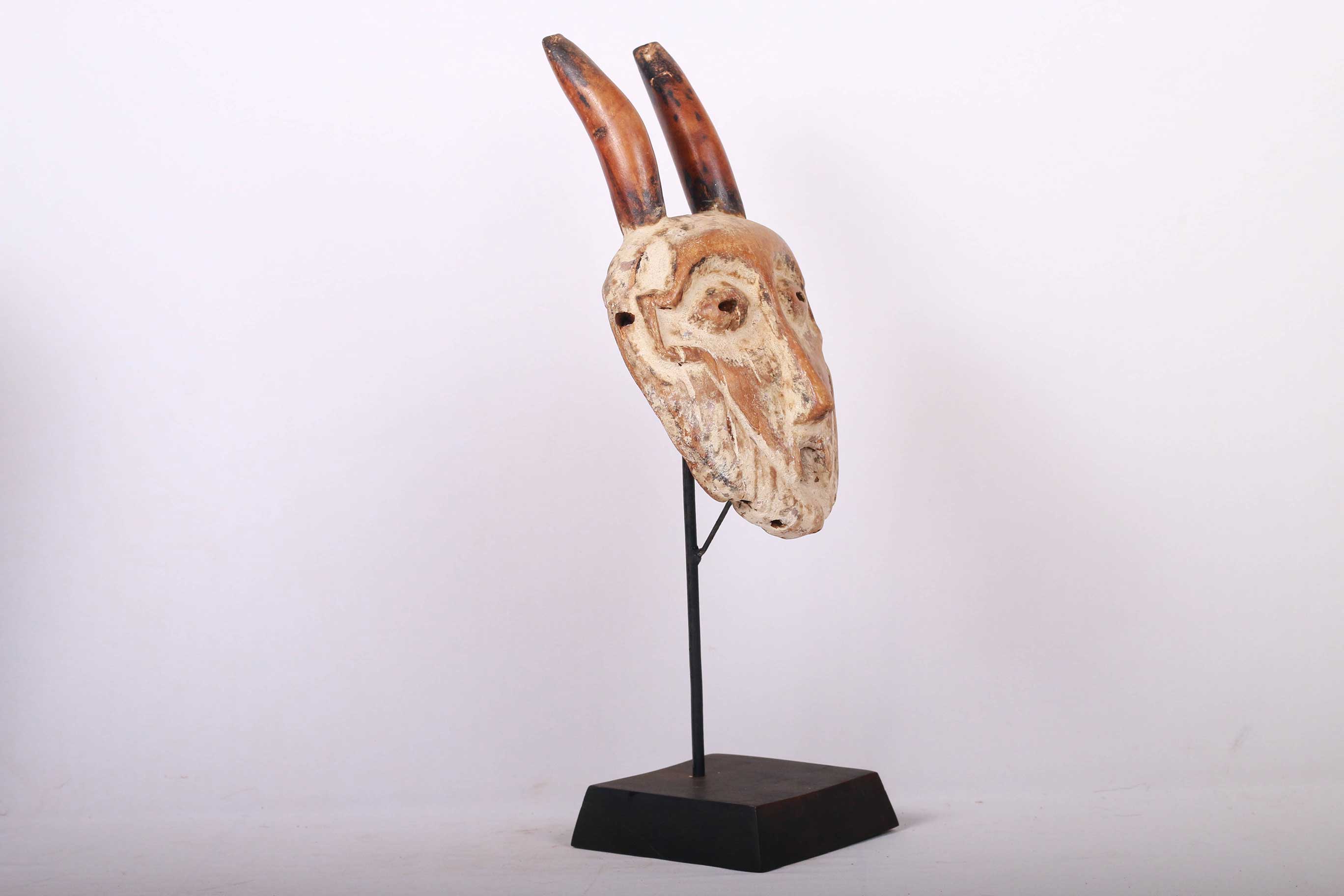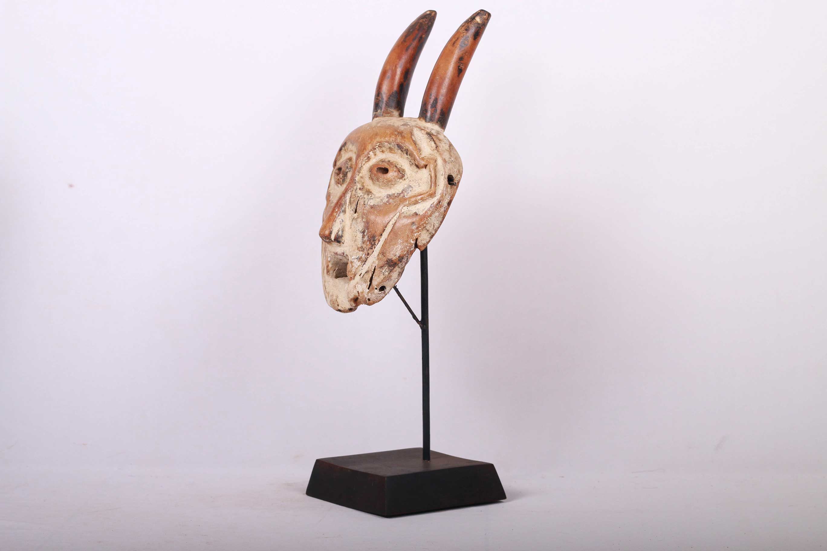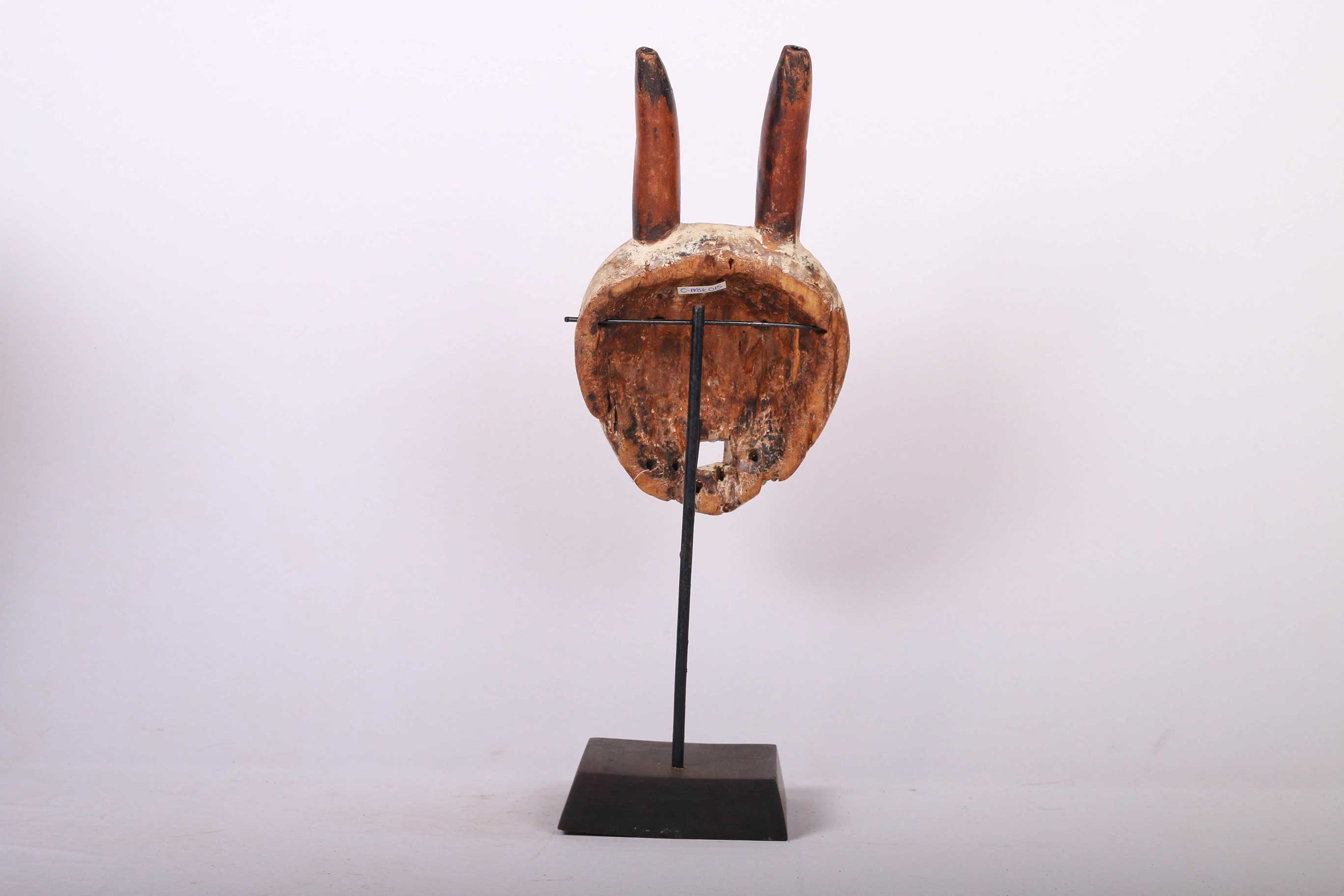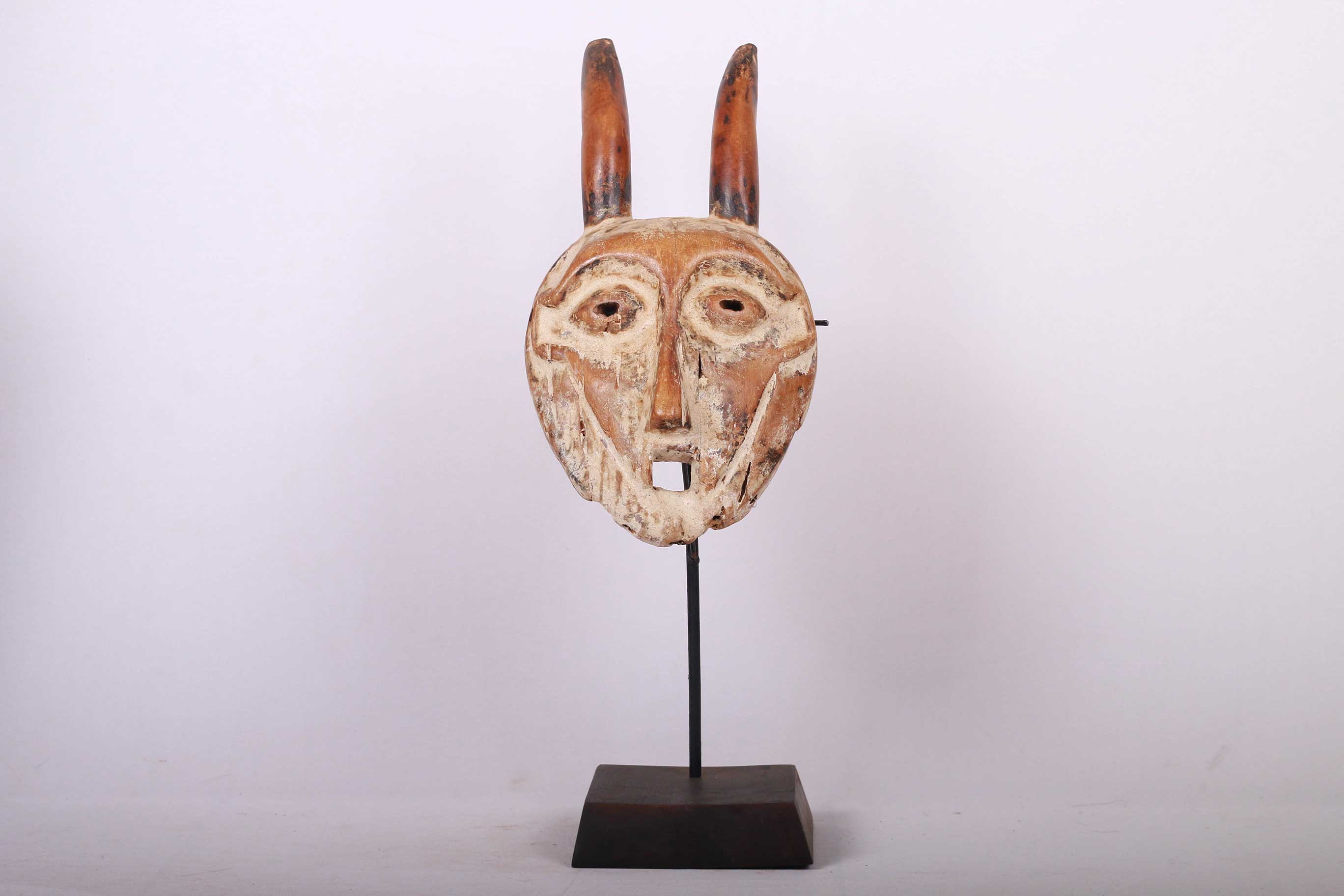 These masks with horns, known as Kayamba masks are used only in a few regions of Lega land in the DRC – thus they are rare masks. They usually belong to accomplished teachers. They are used by men and women in ceremonies with singing, drama, etc. The following mask is made from light wood and has a brown patina and shows good signs of age and usage.