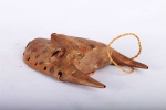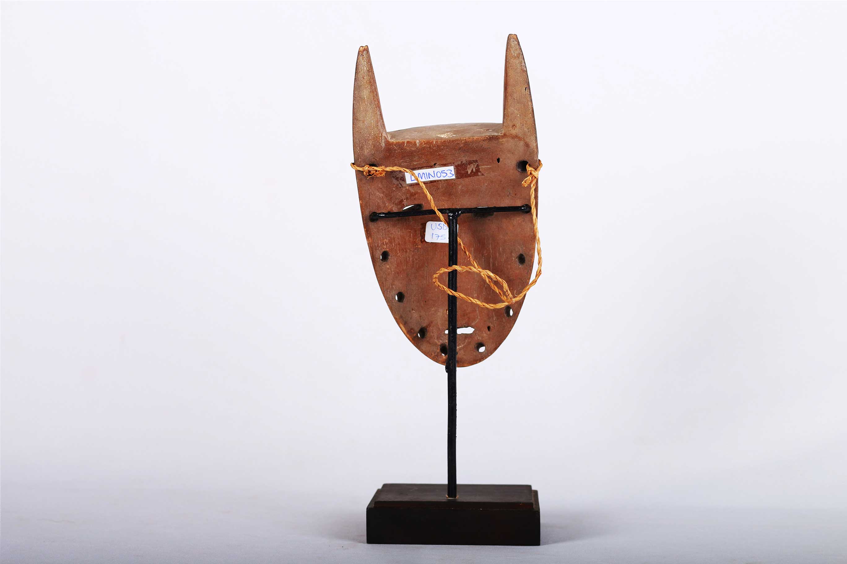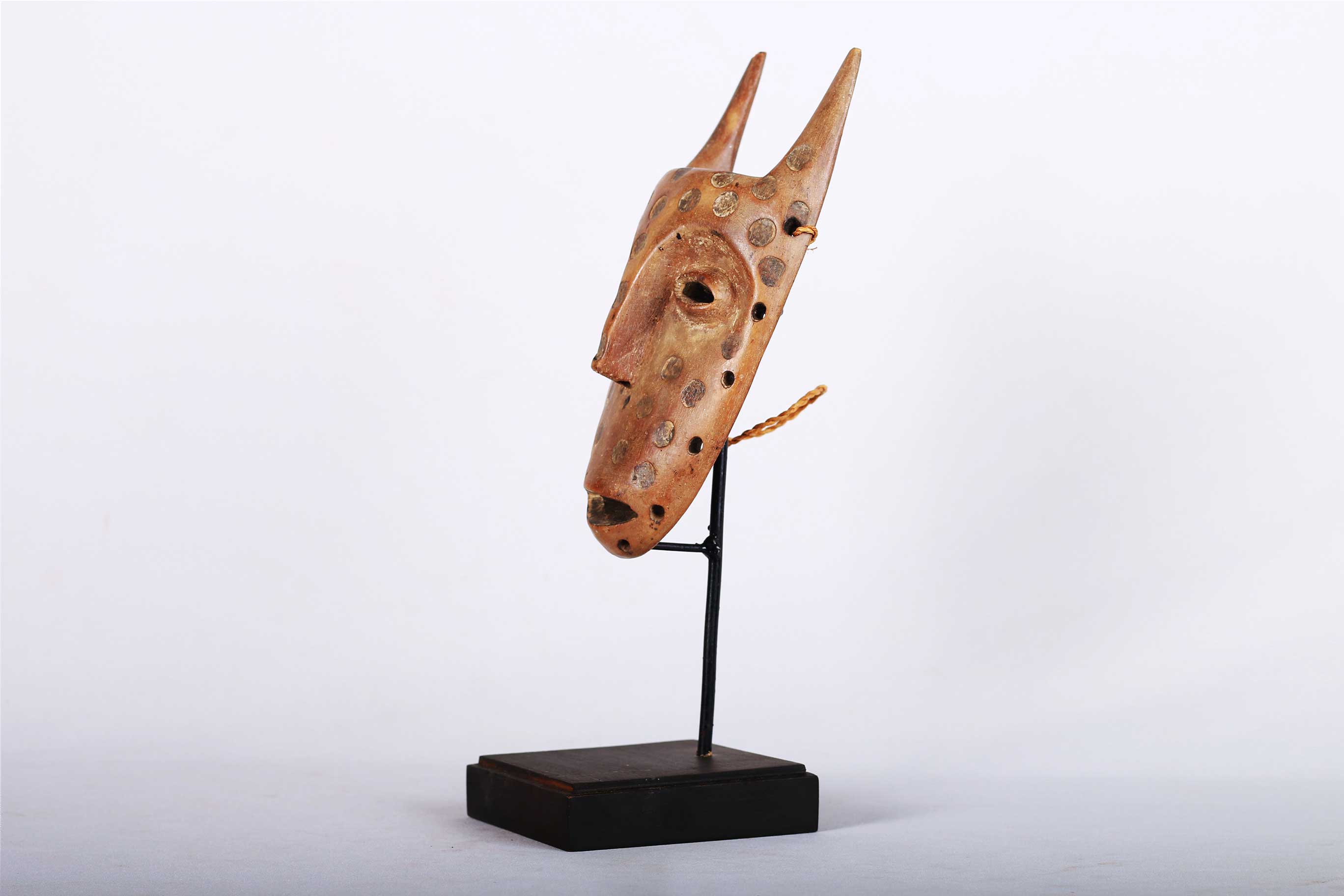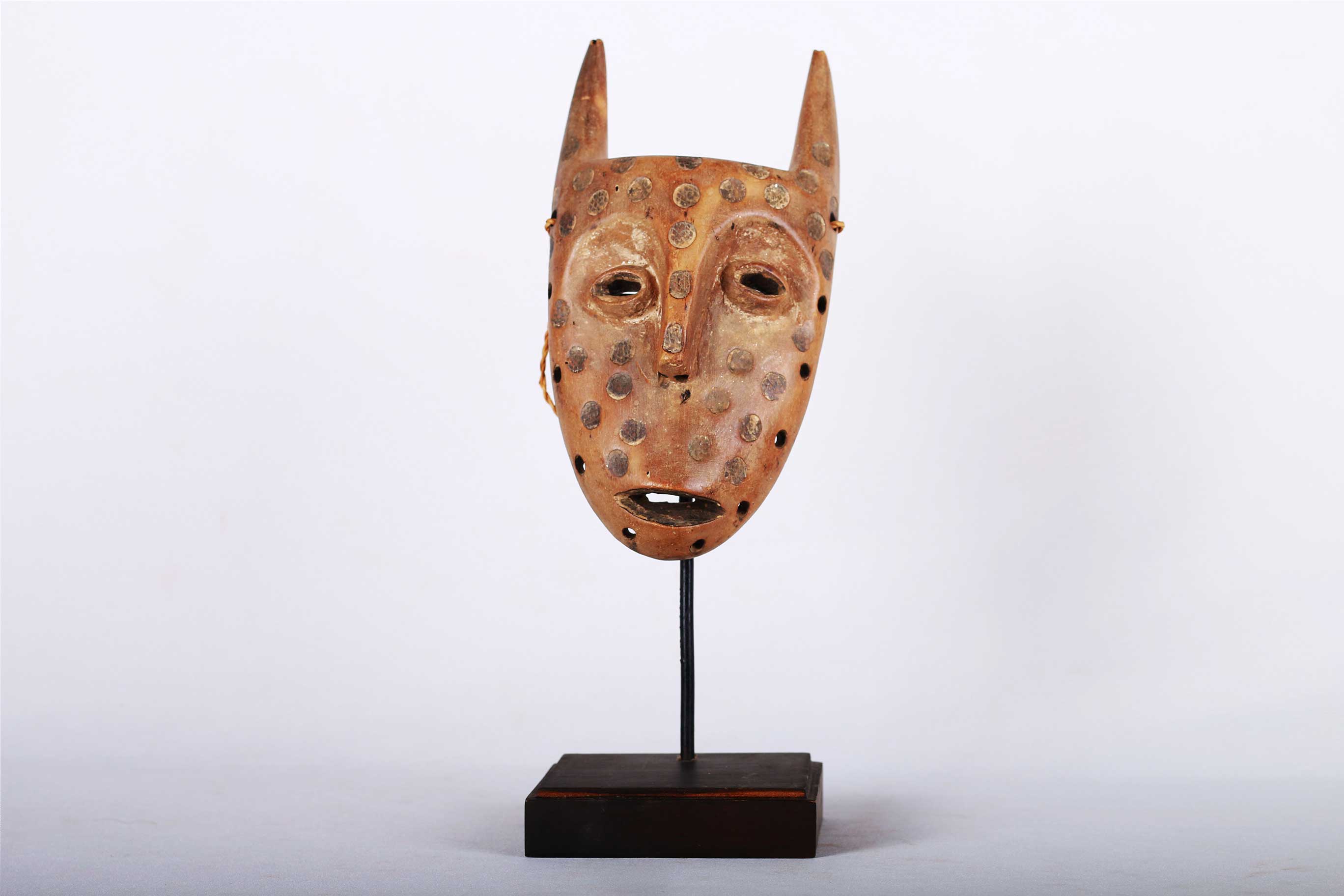 The Lega is an ethnic group found in the Democratic Republic of Congo. The Lega tribe art is created for primarily their semisecret associations of men and women, such as the Bwami society of the Lega peoples. The teachings of Bwami are a cornerstone of all aspects of life, guiding the moral development of the individual and governing relations with others. Bwami doctrine is represented by wood and ivory masks, heads, and small figures, all of which play a vital role during initiation into the society’s highest grades. Lega masks refer to ancestors and are passed from one generation of initiates to the next as symbols of continuity. Lega masks were used for the instruction and initiation ceremonies ceremony rites into the different progressive levels of Bwami society, the association that Lega men rise through with lifelong deeds and often learning up the hierarchy. These masks with horns, known as Kayamba masks are used only in a few regions of Lega land in the DRC – thus they are rare masks. They are used by men and women in ceremonies with singing, drama, etc. They usually belong to accomplished teachers and it is believed to be a passport mask because of its small size, it was used to identify teachers during meetings and ceremonies. The following mask is made from light wood, has visible spots and has a brown patina and shows good signs of age and usage.