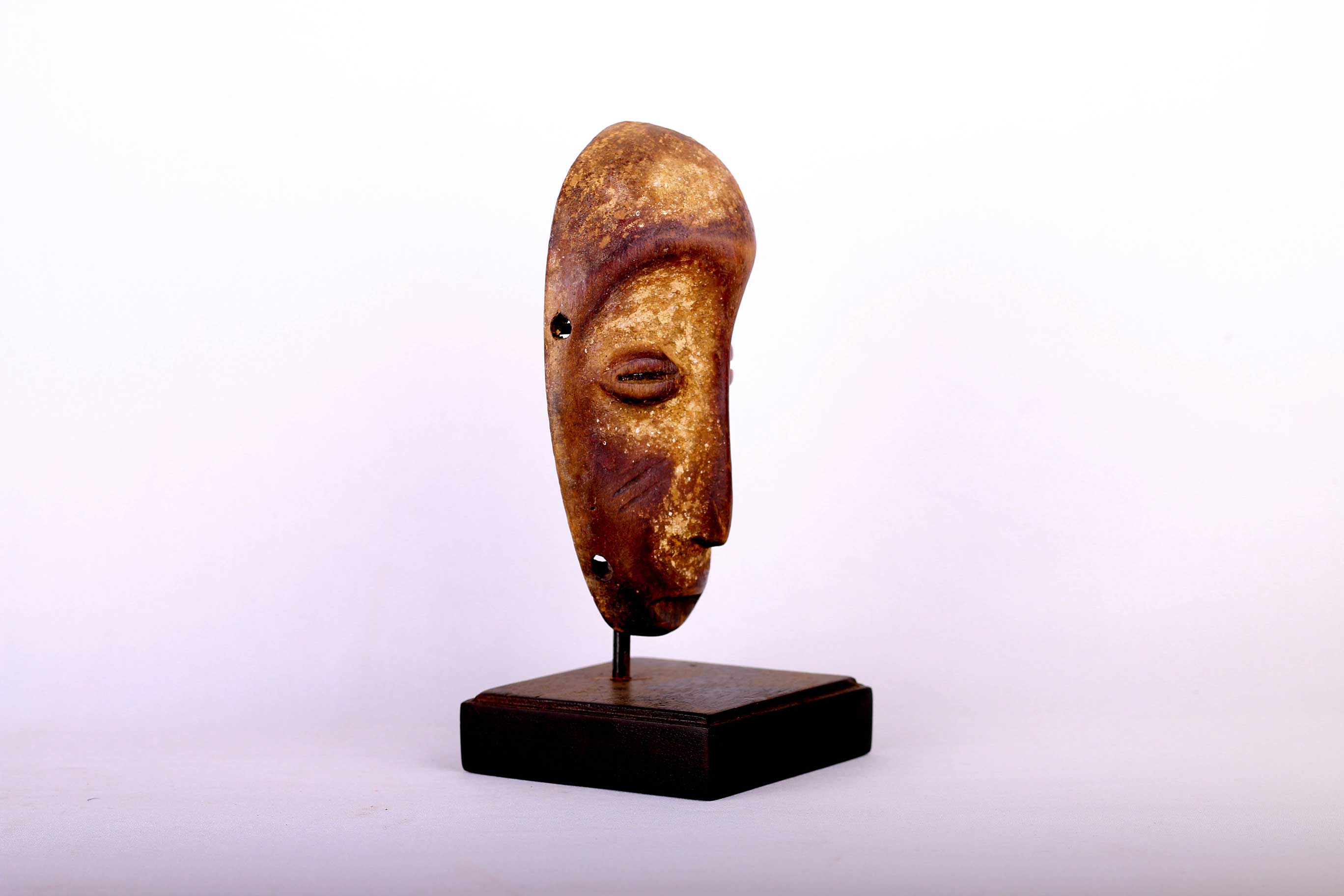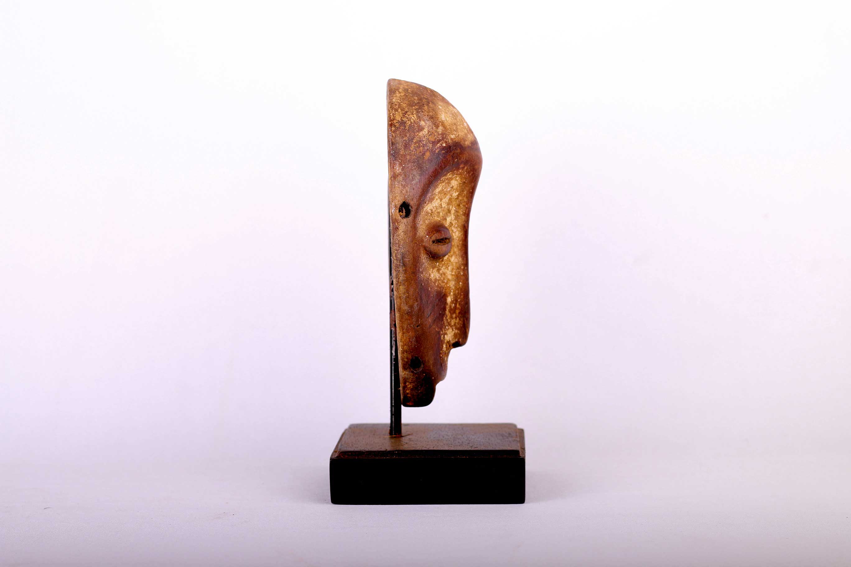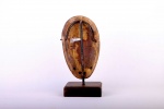 Lega inhabits the virgin forest of eastern DRC, between the great lakes and the Lualaba River, next to Luba people. This miniature mask is rare and such masks often served as badges in the Bwami society and were locally known as “Lukwango”.This passport mask has a brown patina with kaolin and shows signs of age.