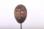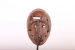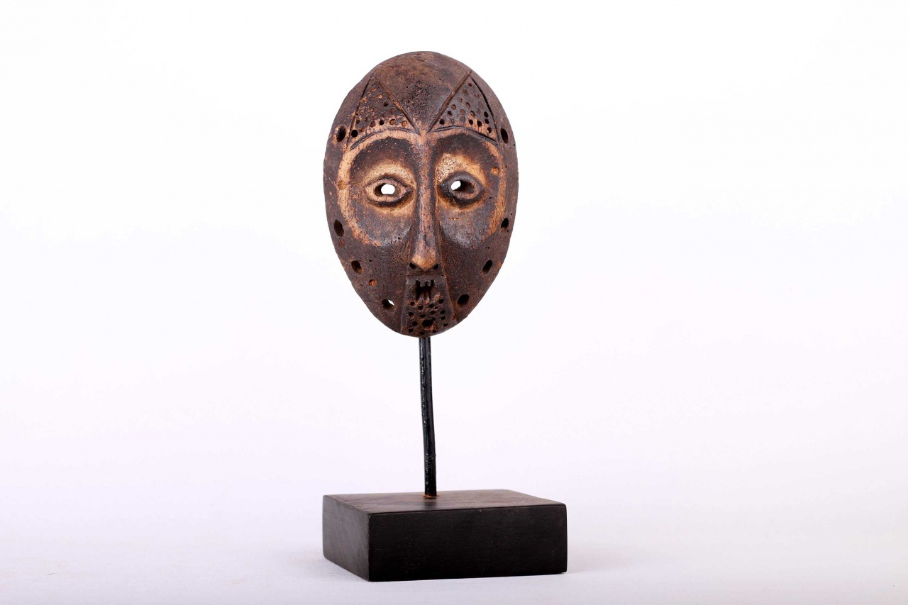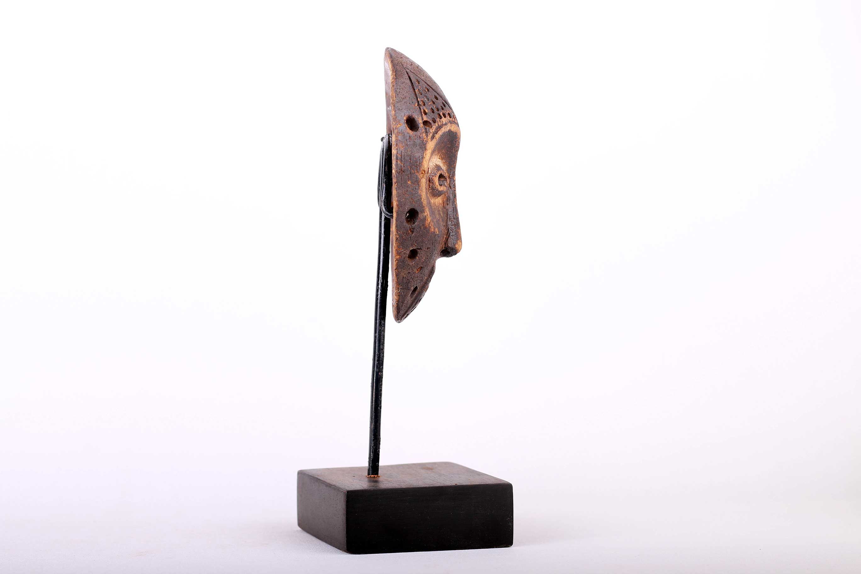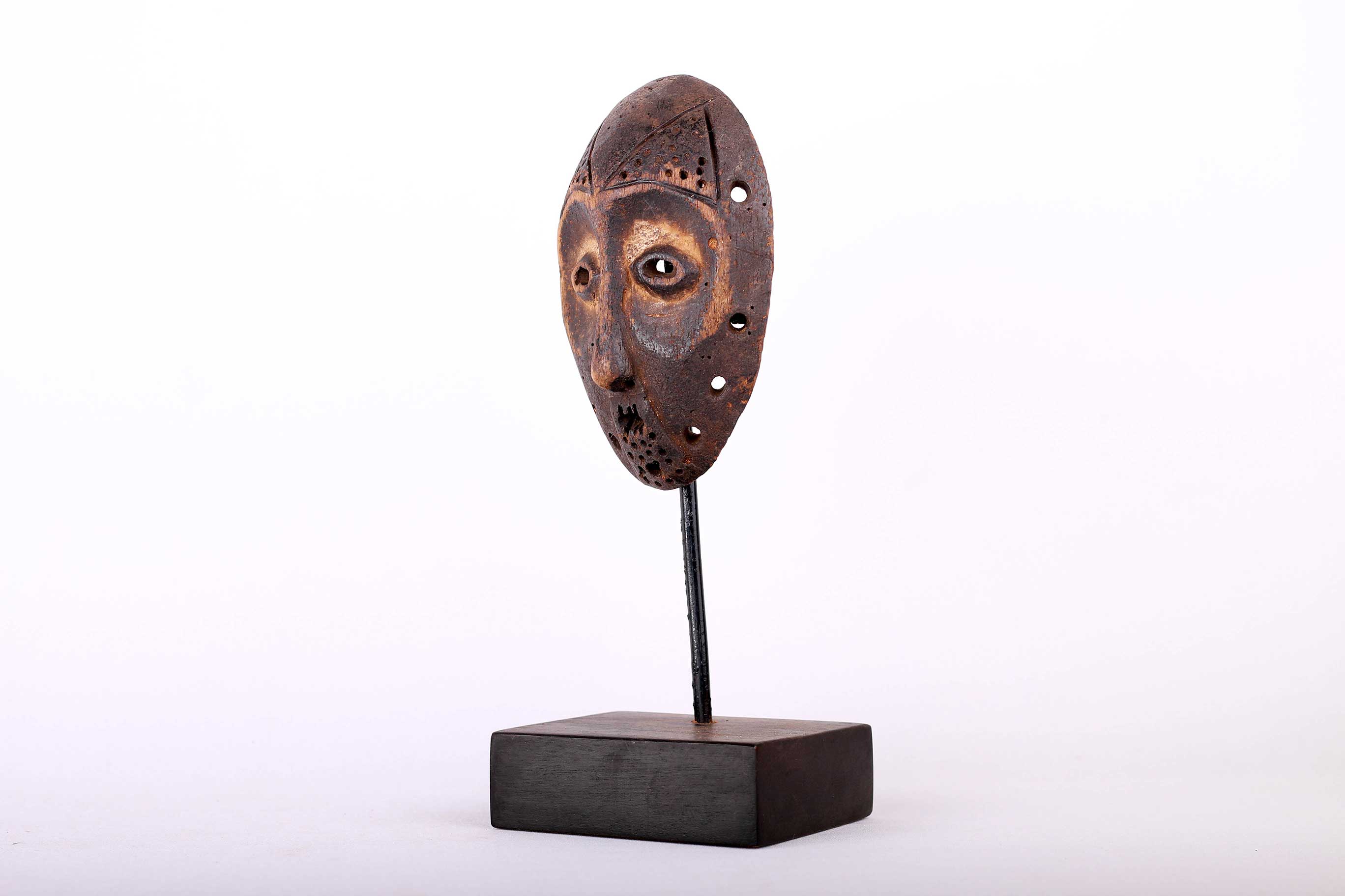 Lega inhabits the virgin forest of eastern DRC, between the great lakes and the Lualaba River, next to Luba people. These small masks are sometimes called “Passport” masks due to their use as identification. They are often sewn onto a piece of cloth & carried on the person in a pouch. They are miniature copies of family masks and enable the carrier to retain contact with the spirit embodied in the parent mask. The masks are used to invoke benevolent spirits during secret society meetings. They also demand offerings from initiates during initiation ceremonies such as libations. In addition to warding off evil, the miniature masks also serve as witnesses during initiation ceremonies. The following miniature mask has a black patina and shows visible signs of age and usage.