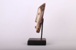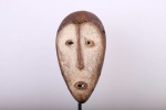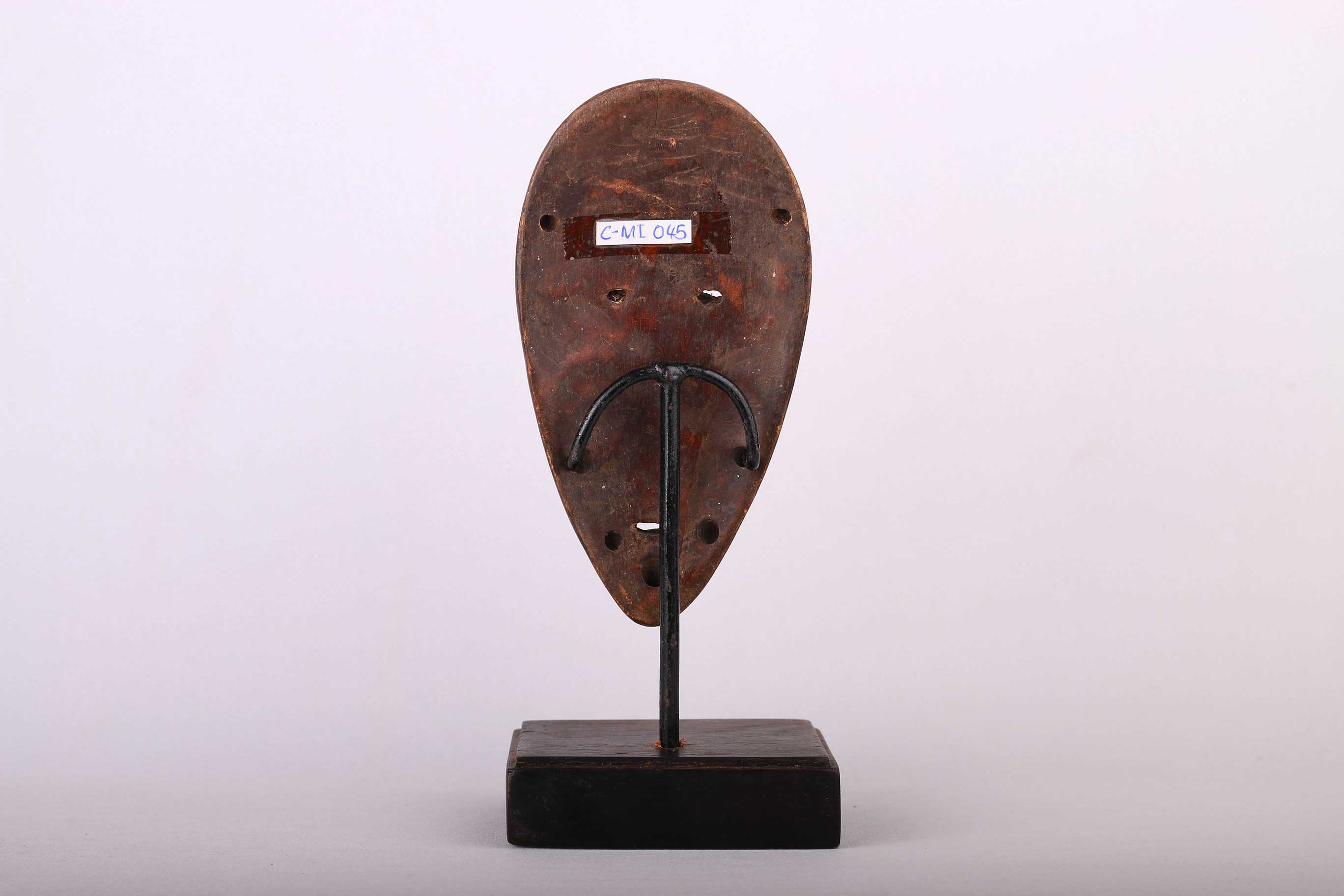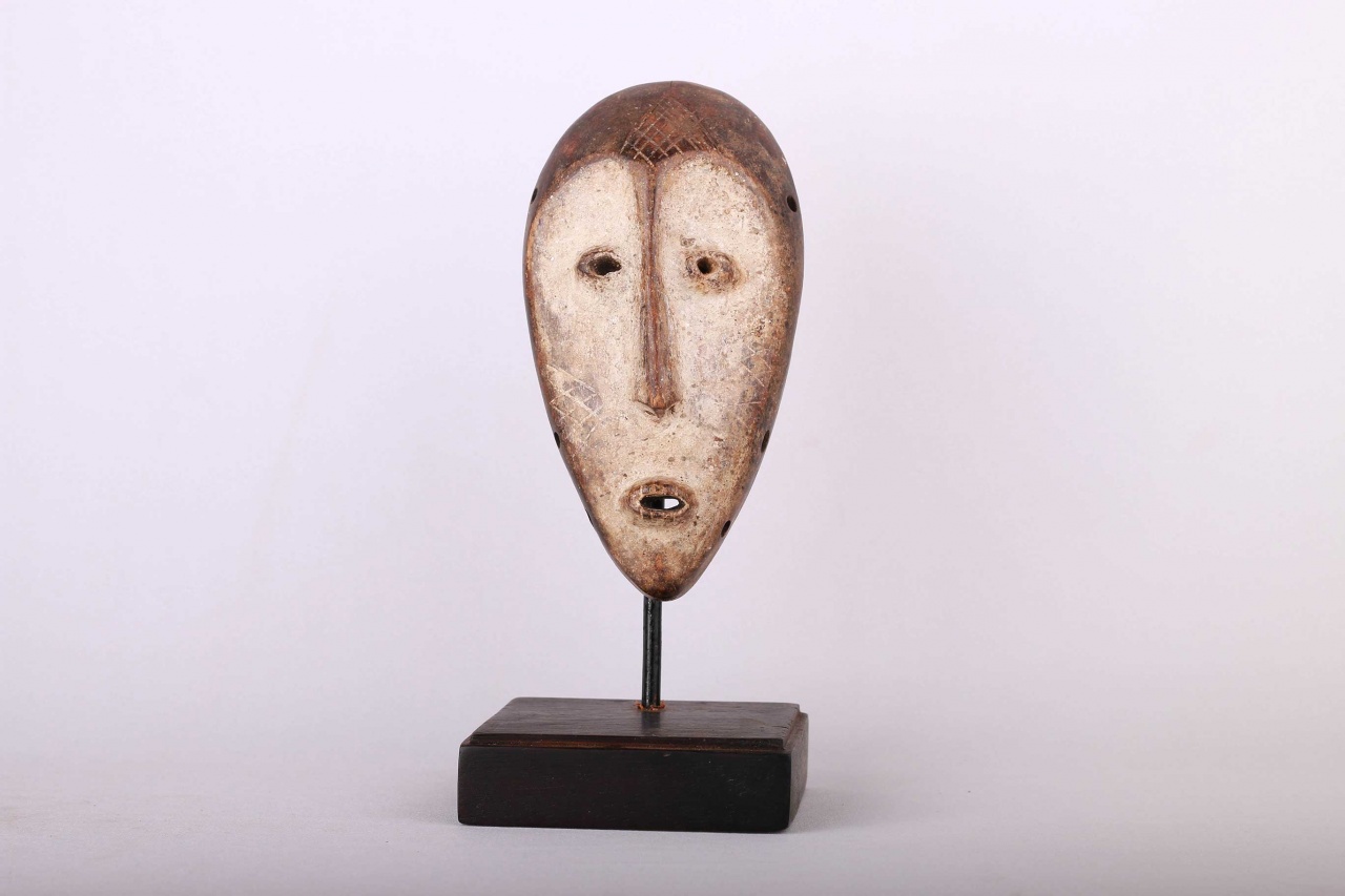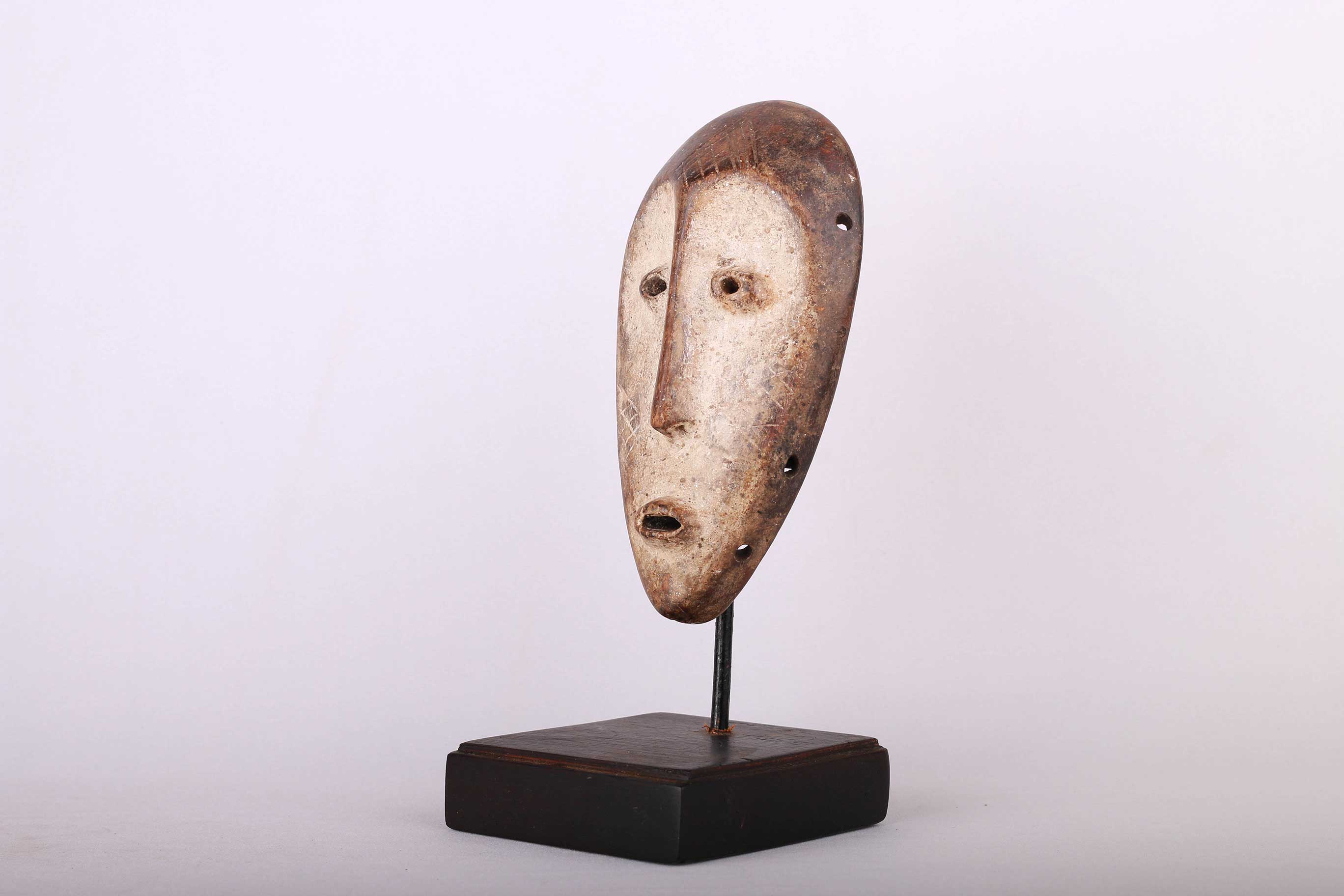 Lega inhabits the virgin forest of eastern DRC, between the great lakes and the Lualaba River, next to Luba people. These small masks are sometimes called “Passport” masks due to their use as identification. They are often sewn onto a piece of cloth & carried on the person in a pouch. They are miniature copies of family masks and enable the carrier to retain contact with the spirit embodied in the parent mask. The masks are used to invoke benevolent spirits during secret society meetings. They also demand offerings from initiates during initiation ceremonies such as libations. In addition to warding off evil, the miniature masks also serve as witnesses during initiation ceremonies. The following miniature mask has a brown patina and shows visible signs of age and usage.