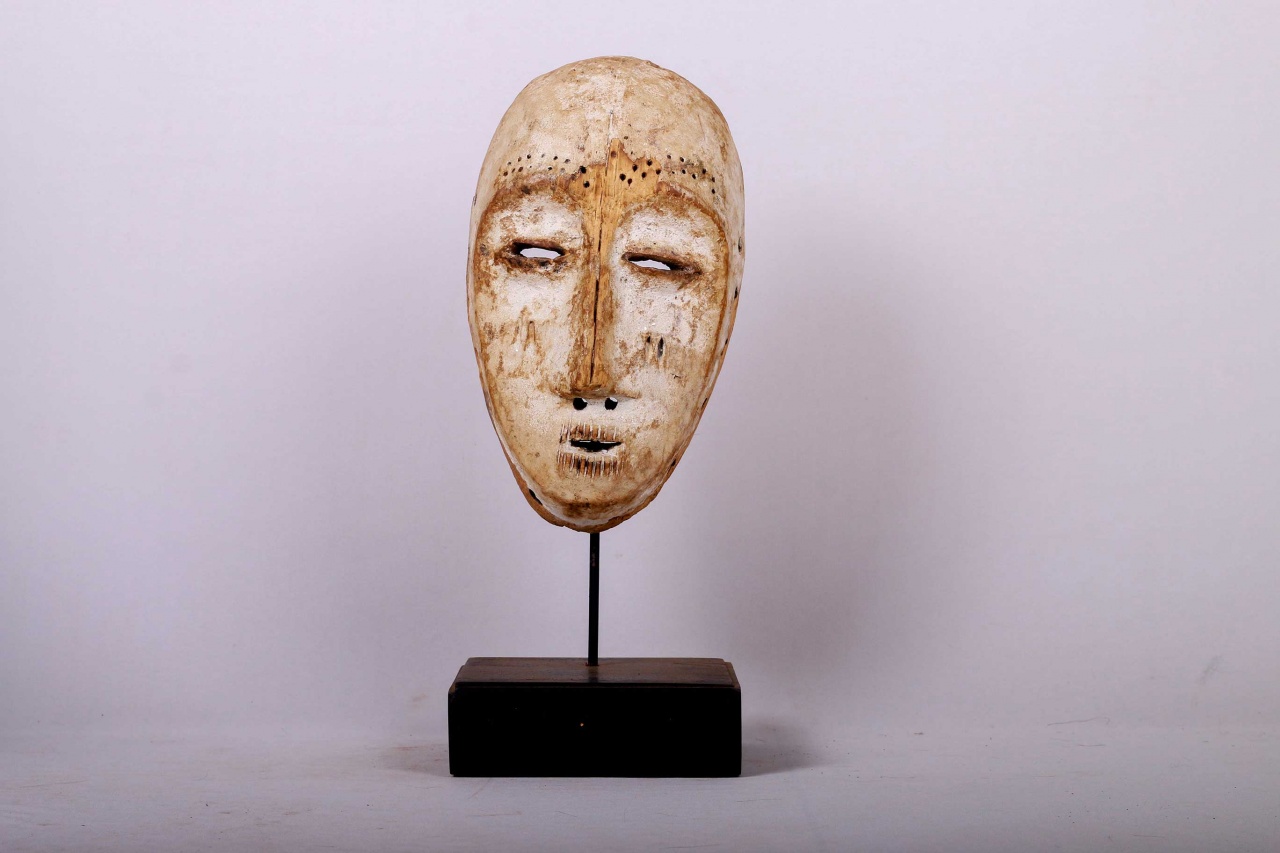 This is an old small Lega passport mask from the Lega tribe habiting in the Democratic Republic of Congo. Lega masks refer to ancestors and are passed from one generation of initiates to the next as symbols of continuity. Lega masks were used for the instruction and initiation ceremonies ceremony rites into the different progressive levels of Bwami society, the association that Lega men rise through with lifelong deeds and often learning up the hierarchy. The following mask is made from light wood and has a khaki patina, it shows good age and perfect usage.
