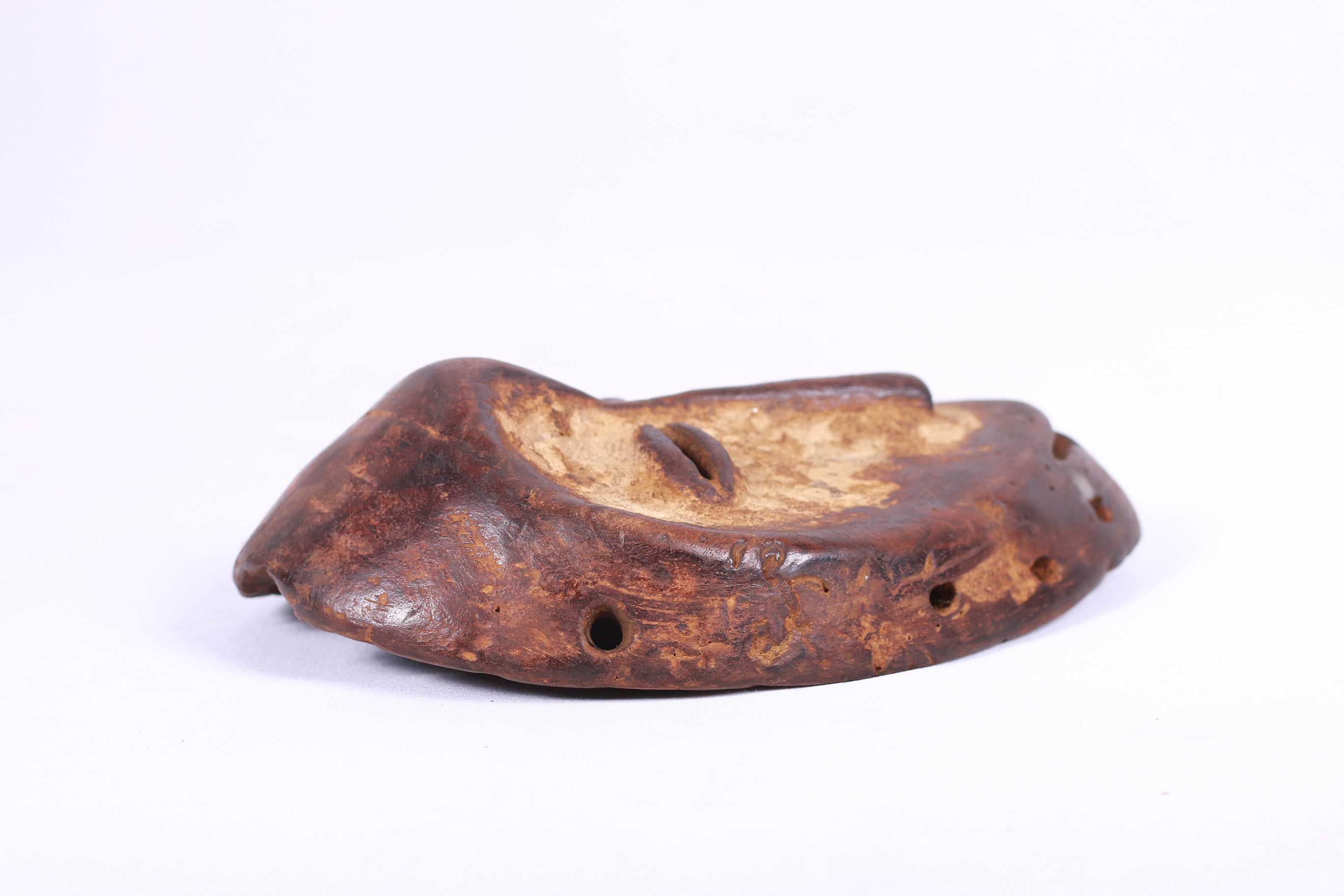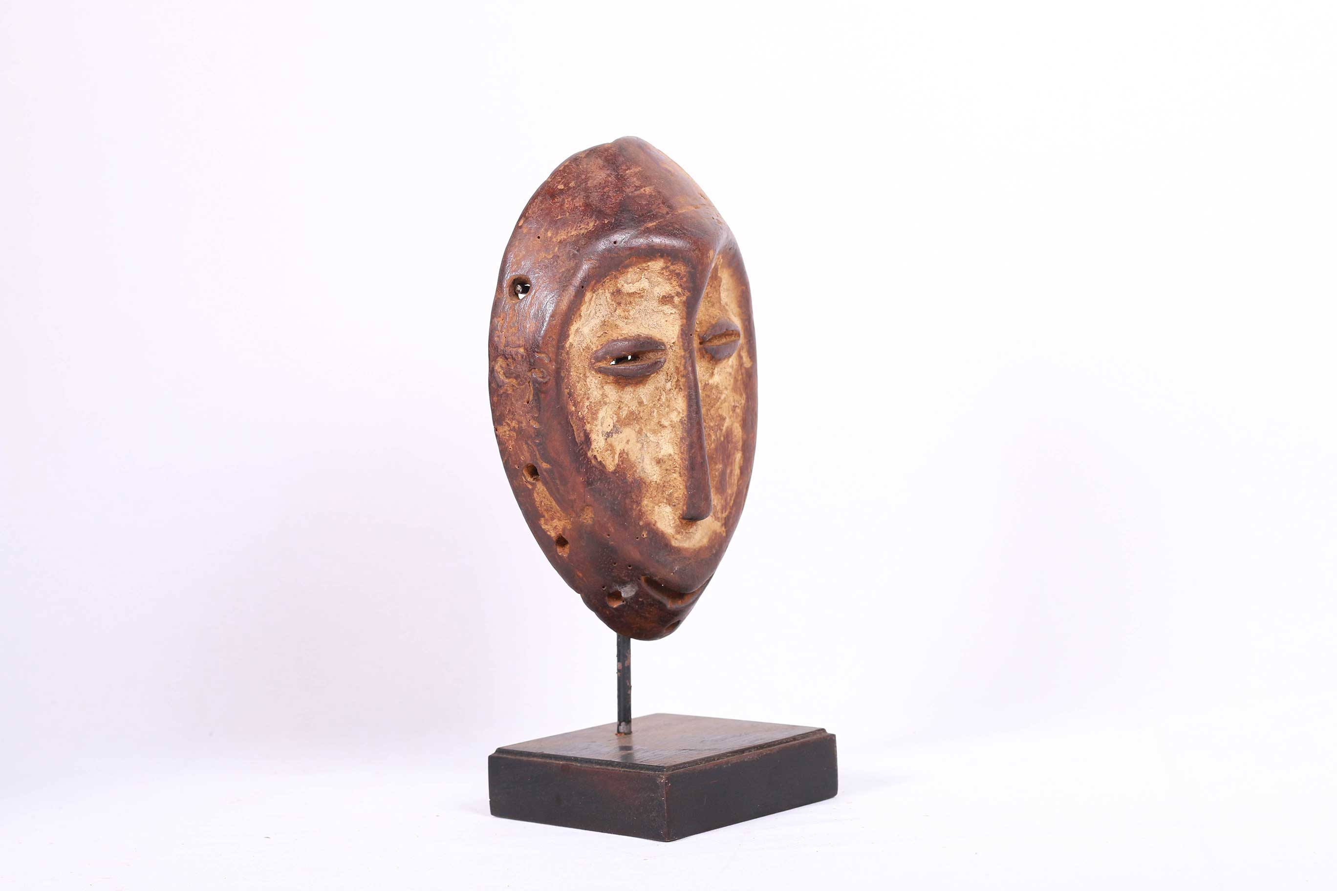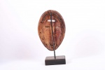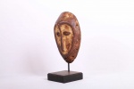 This is an old small Lega passport mask from the Lega tribe habiting in the Democratic Republic of Congo. Lega masks refer to ancestors and are passed from one generation of initiates to the next as symbols of continuity. Lega masks were used for the instruction and initiation ceremonies ceremony rites into the different progressive levels of Bwami society, the association that Lega men rise through with lifelong deeds and often learning up the hierarchy. The following mask is made from light wood and has a brown patina, it shows good signs of age and usage.