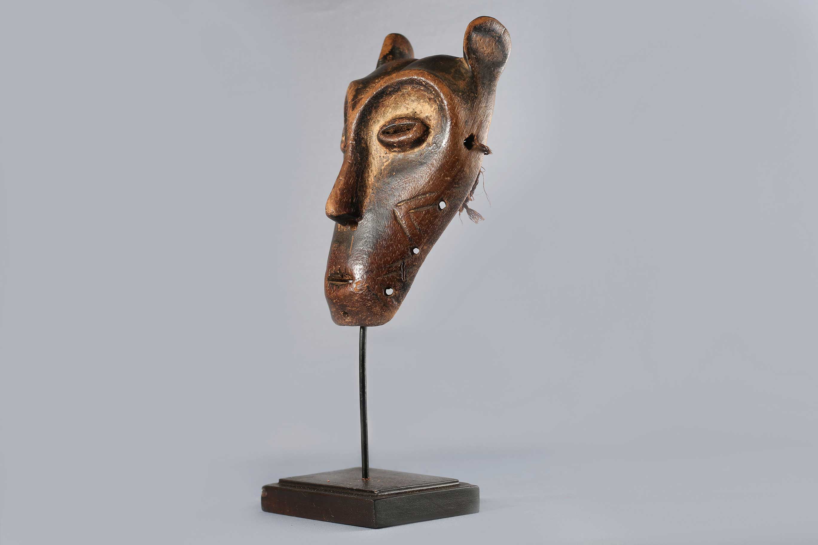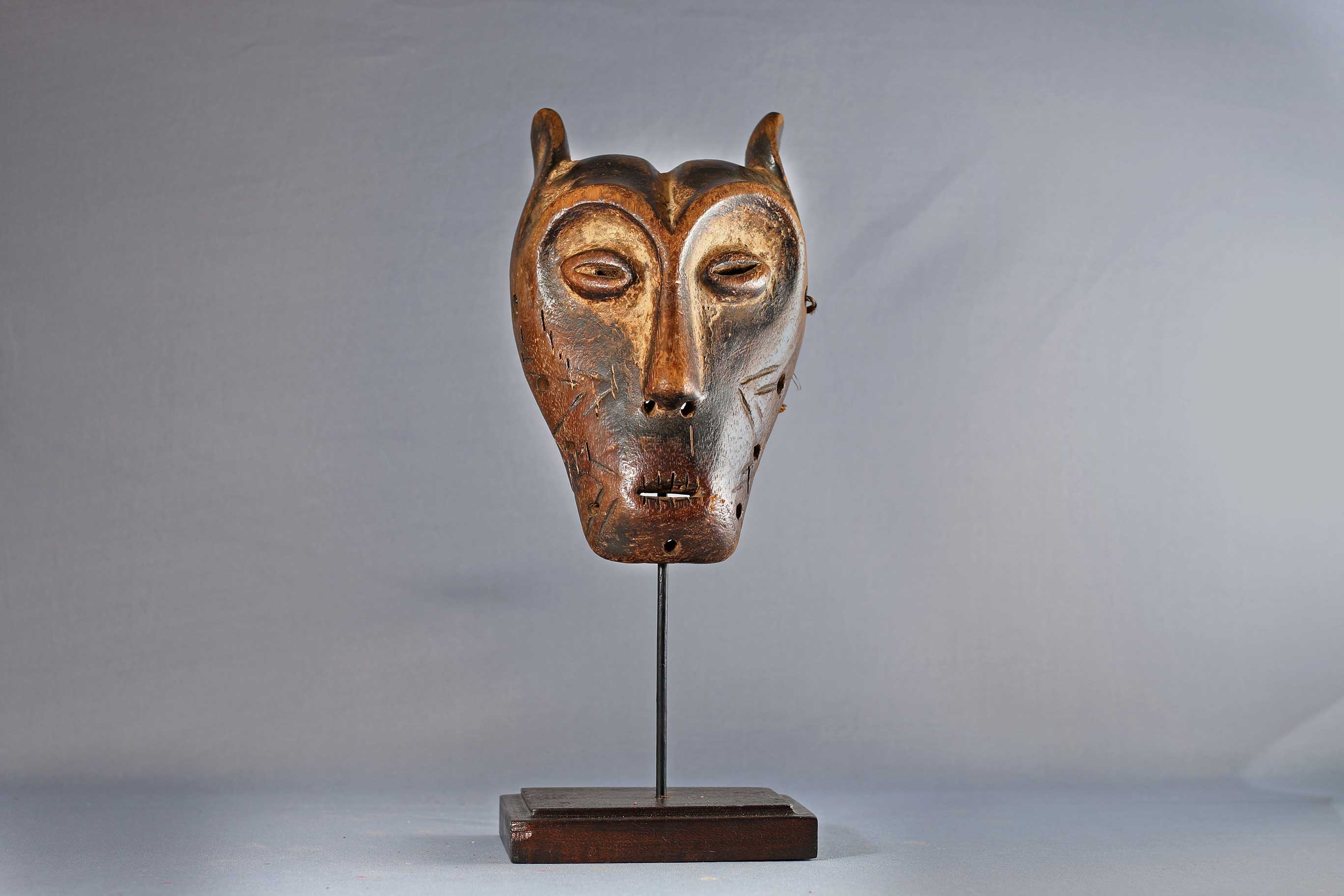 An intriguing old mask from the Lega tribe habiting in the Democratic Republic of Congo. Lega masks refer to ancestors and are passed from one generation of initiates to the next as symbols of continuity. Lega masks were used for the instruction and initiation ceremonies ceremony rites into the different progressive levels of Bwami society, the association that Lega men rise through with lifelong deeds and often learning up the hierarchy.