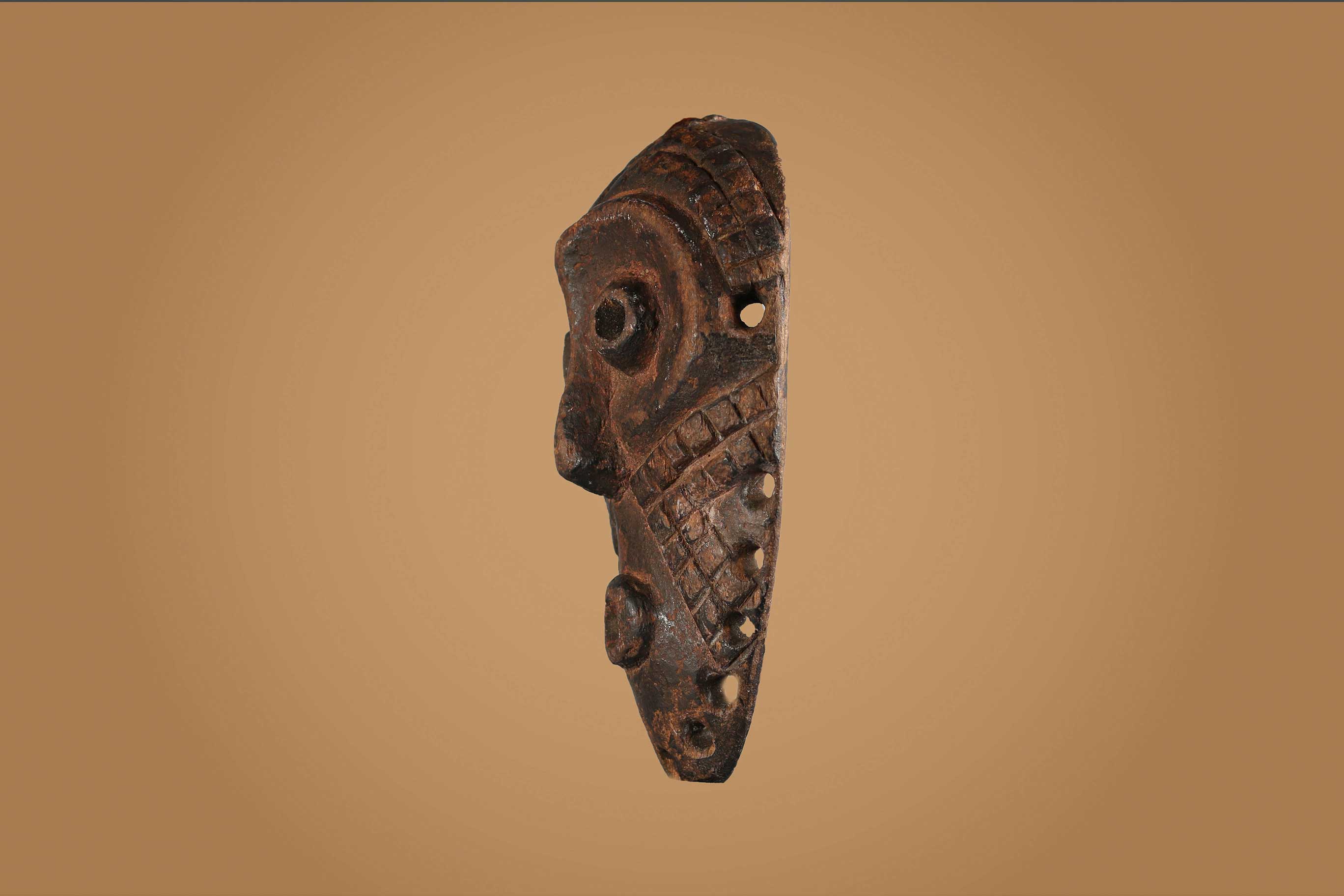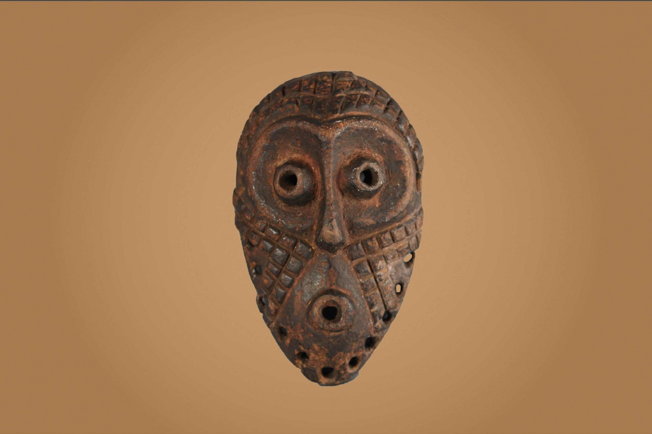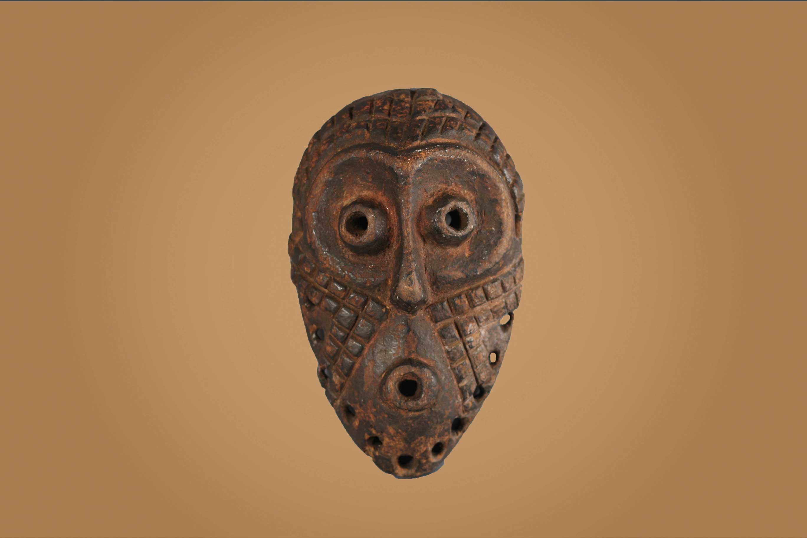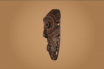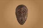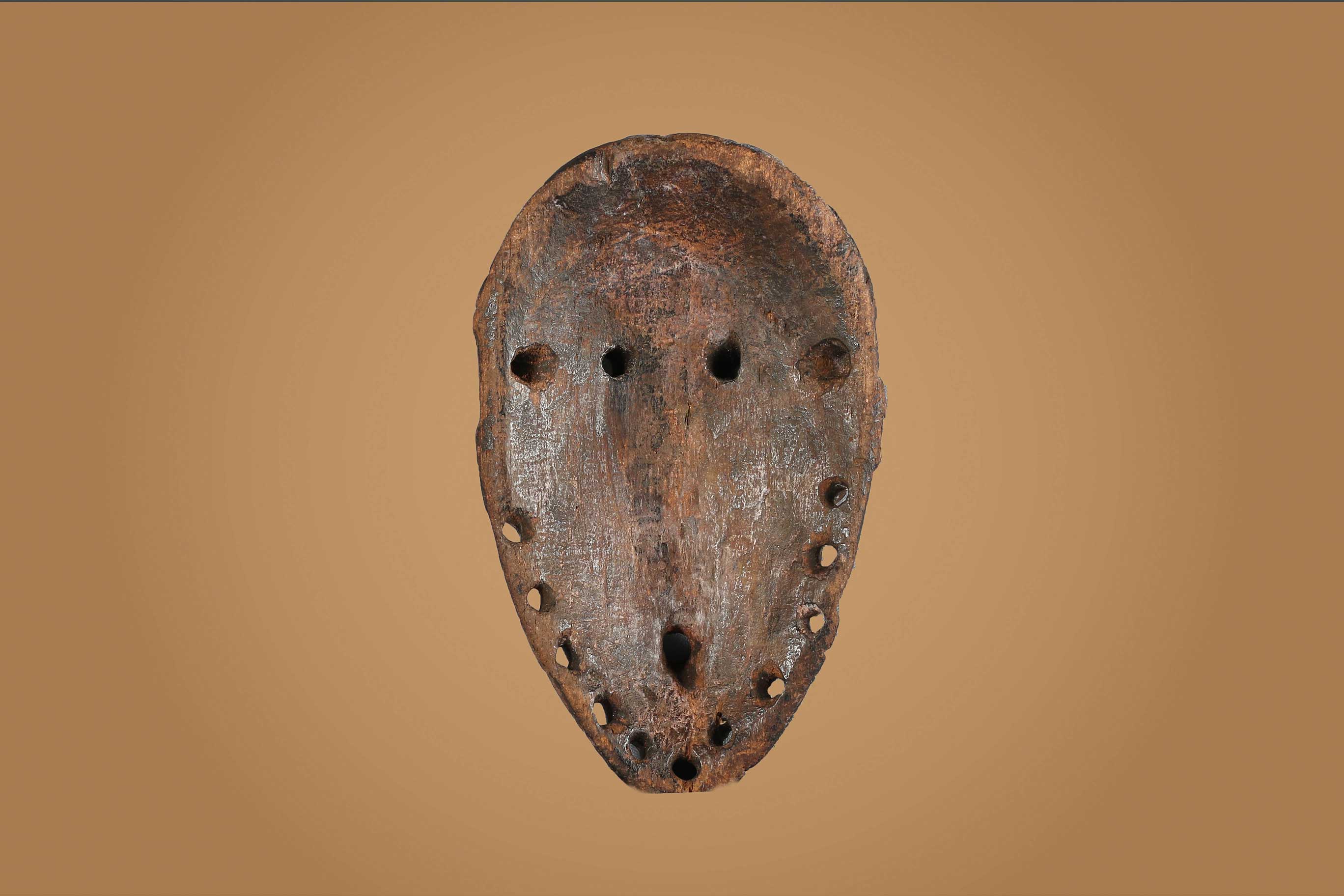 An ancient mask with interesting features from the Lega tribe habiting in the Democratic Republic of Congo. Lega masks refer to ancestors and are passed from one generation of initiates to the next as symbols of continuity. Lega masks were used for the instruction and initiation ceremonies ceremony rites into the different progressive levels of Bwami society, the association that Lega men rise through with lifelong deeds and often learning up the hierarchy. The following is a shallow faced mask carved in light wood, has an oval shape, round holes to represent eyes and a mouth and has a brown patina, it shows good signs of age and usage.