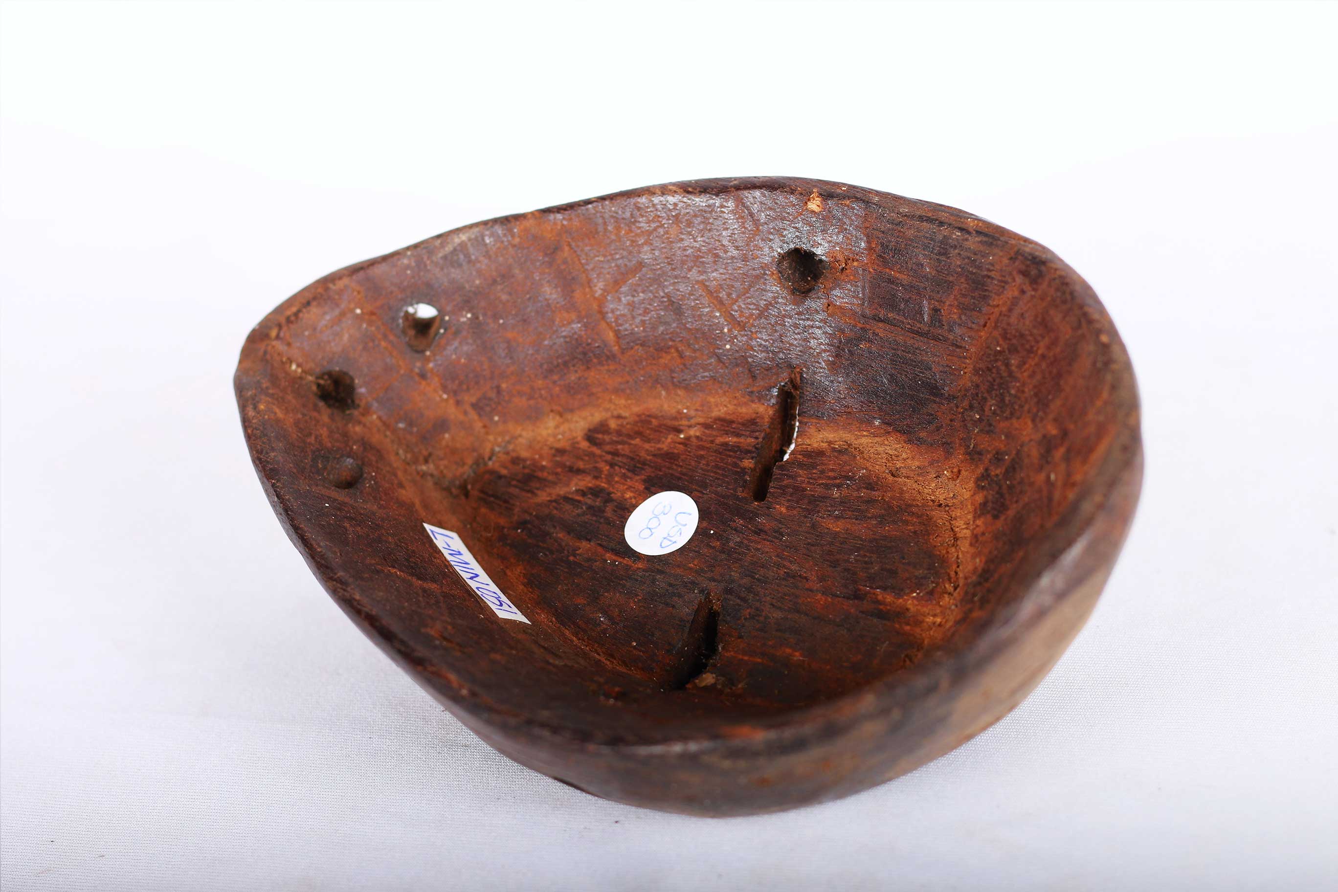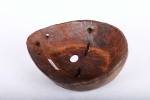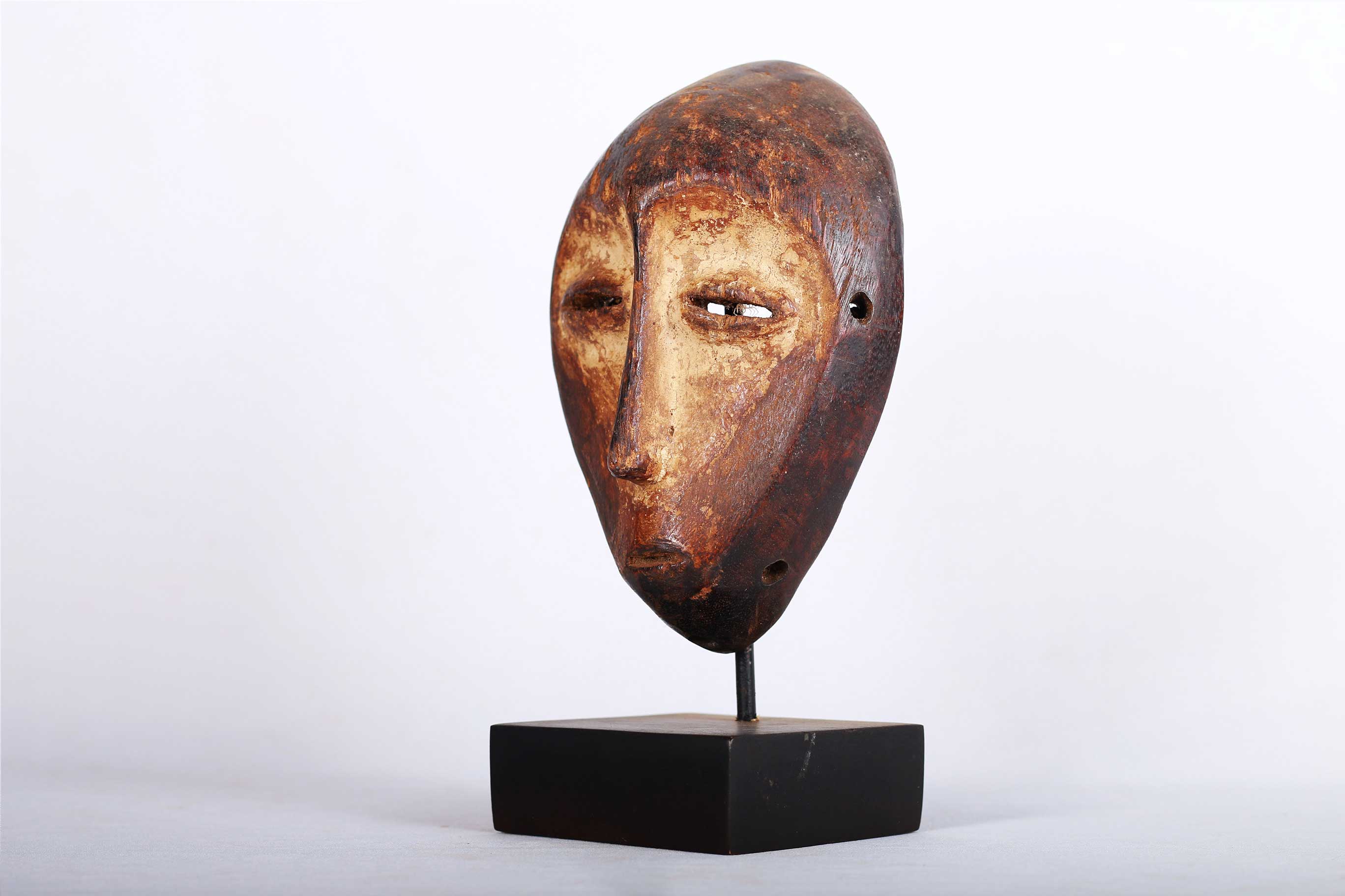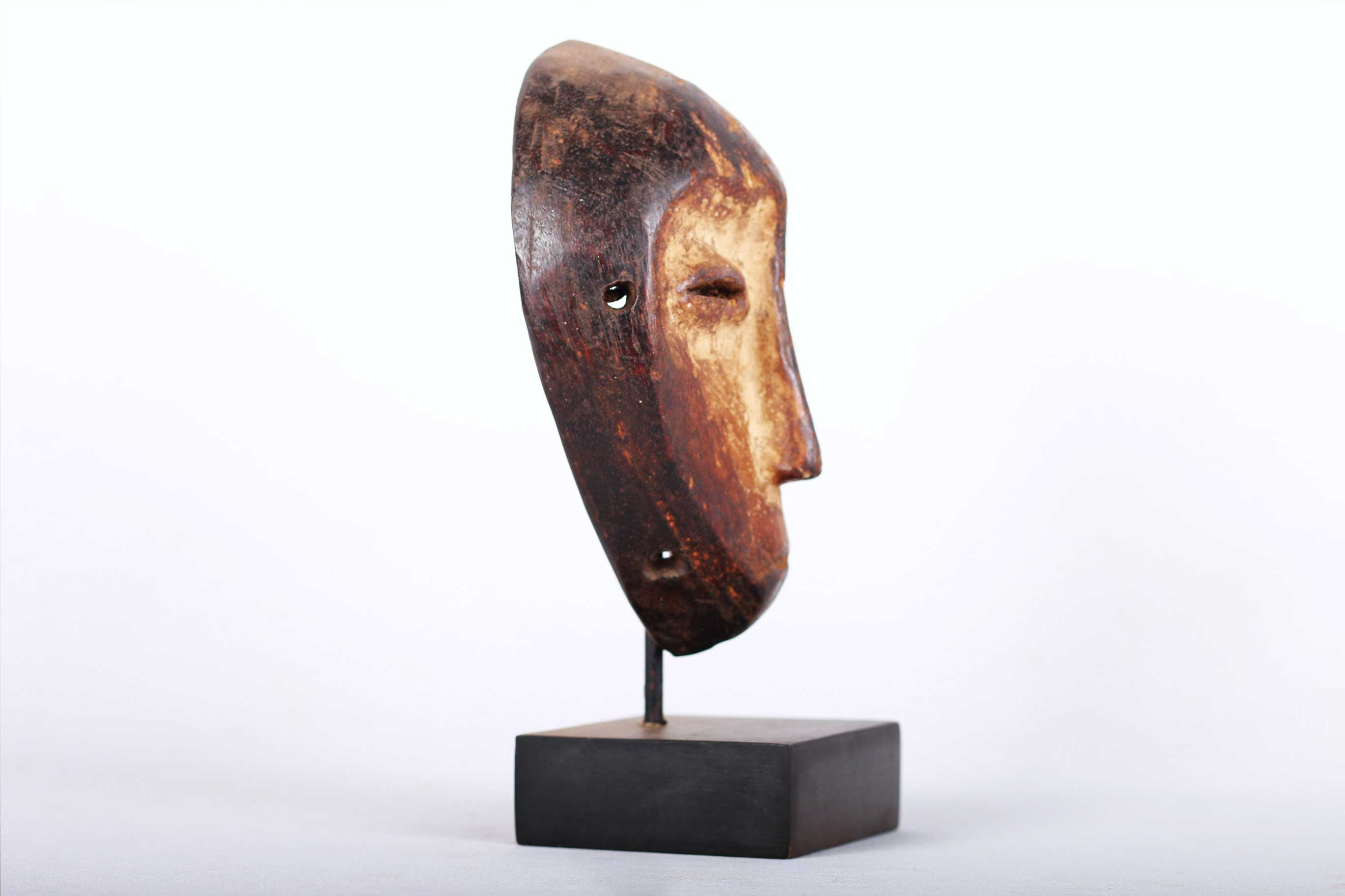This is a small carved wood tribal commonly known as a “passport mask” carried with the traveller to show the tribe that they belong to. They were not worn on the face but exhibited, they were sown on a piece of cloth, tied to the upper arm, or hung on a fence during meetings of the Bwami society in order to allow the arriving members to see who was already present. The miniature masks were used to invoke ancestral spirits during secret society meetings, they were also used to serve as witnesses during initiation ceremonies. These maskettes were hand-carried in a dance, dragged or swung by their beards, hung over a shoulder. The following oval-shaped mask has a brown patina with kaolin on the concave-shaped face, and it shows signs of age and nice usage.
