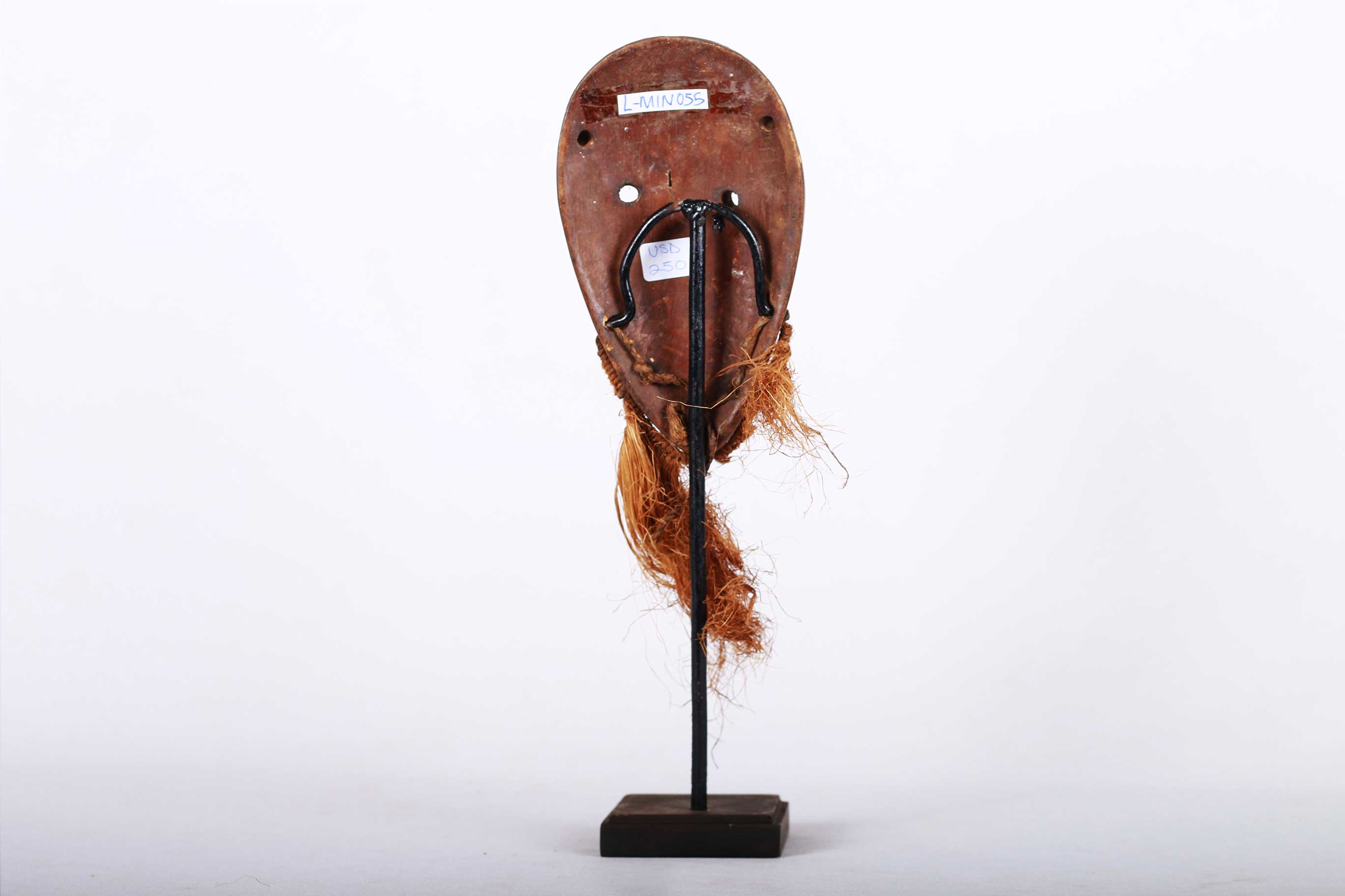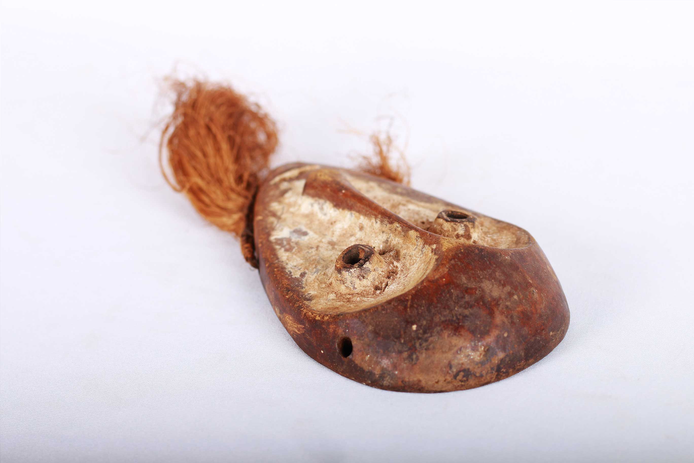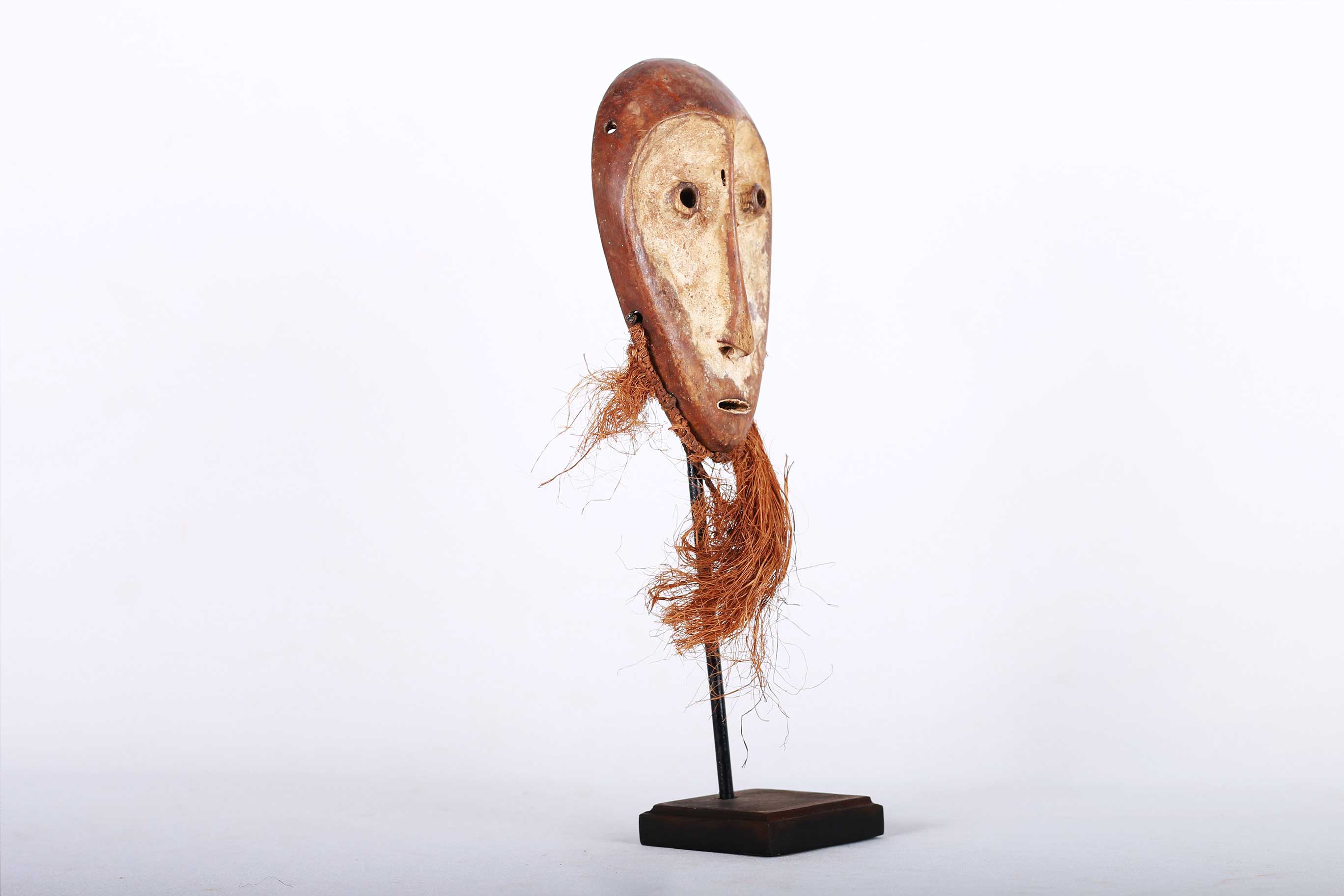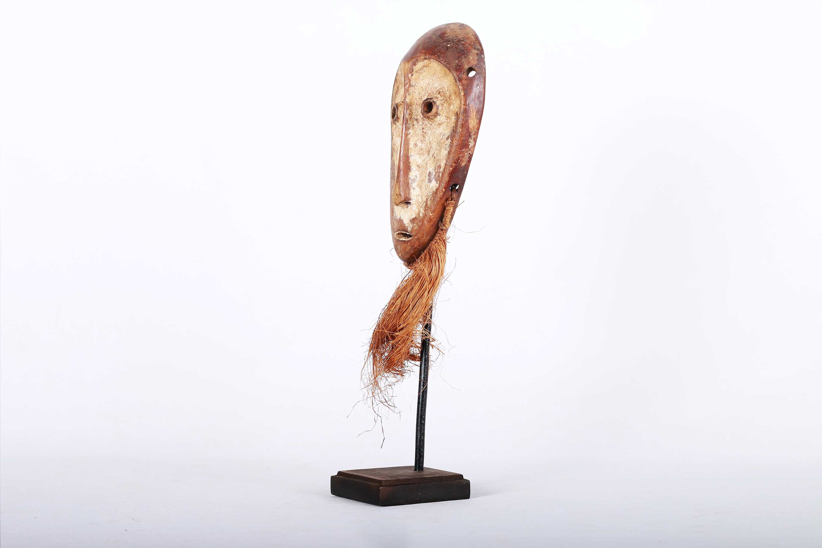 This is a Lega mask also called Rega/ Warega in eastern Democratic Republic of Congo, these small masks, called ‘Lukwakongo’, served as a form of ‘identification’ for the members of the ‘Bwami’ society. They were not worn on the face but exhibited, tied to the upper arm, or hung on a fence during meetings of the Bwami society in order to allow the arriving members to see who was already present. These maskettes were hand-carried in a dance, dragged or swung by their beards, hung over a shoulder. It is important to note that in very few instances the maskette is carried lying on the head or fixed on a tall black, goat mane hat worn by “Yananio” initiates, often in combination with one or two masks or hung from the front hat so that the beard covers the face of its wearer. The following is a flat mask made from light wood and has a brown patina and shows good age and usage.