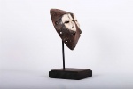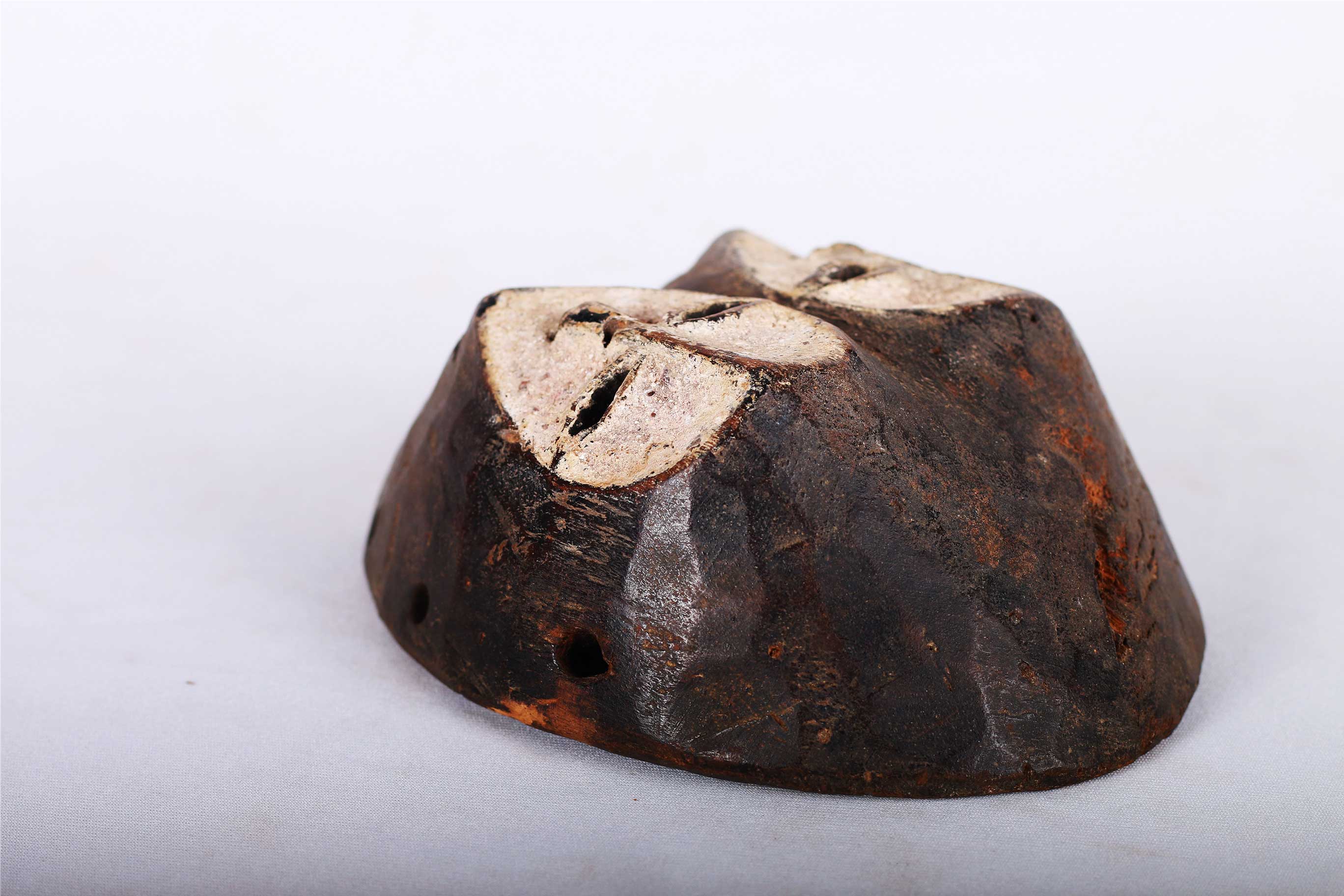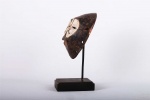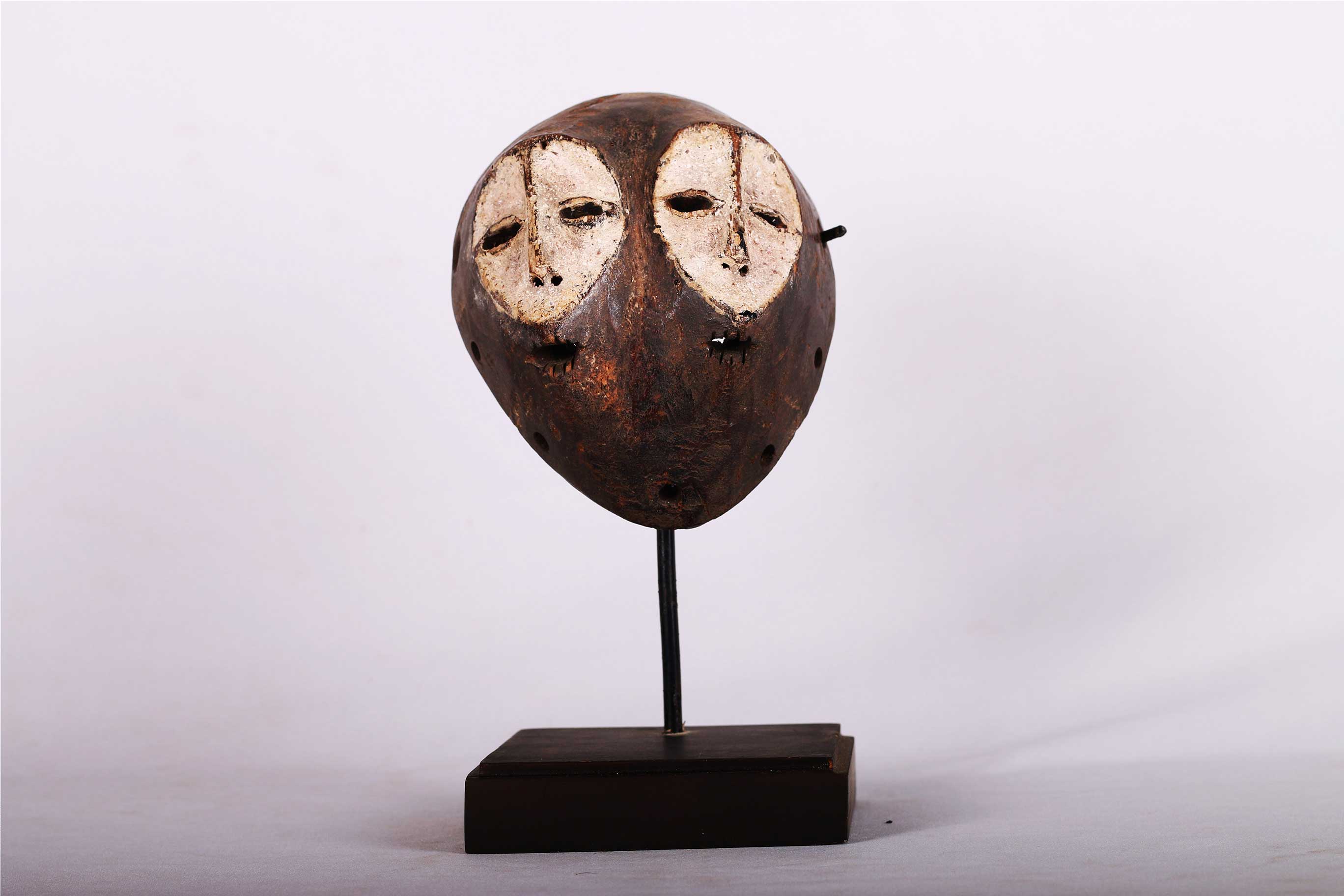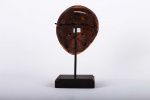 This is a Lega mask also called Rega/ Warega in eastern Democratic Republic of Congo, these small masks, called ‘Lukwakongo’, served as a form of ‘identification’ for the members of the ‘Bwami’ society. They were not worn on the face but exhibited, tied to the upper arm, or hung on a fence during meetings of the Bwami society in order to allow the arriving members to see who was already present. These maskettes were hand-carried in a dance, dragged or swung by their beards, hung over a shoulder. It is important to note that in very few instances the maskette is carried lying on the head or fixed on a tall black, goat mane hat worn by “Yananio” initiates, often in combination with one or two masks or hung from the front hat so that the beard covers the face of its wearer. The following mask is a concave-shaped double-faced made from light wood, a layer of kaolin on both faces and has a dark brown patina and shows good age and usage.