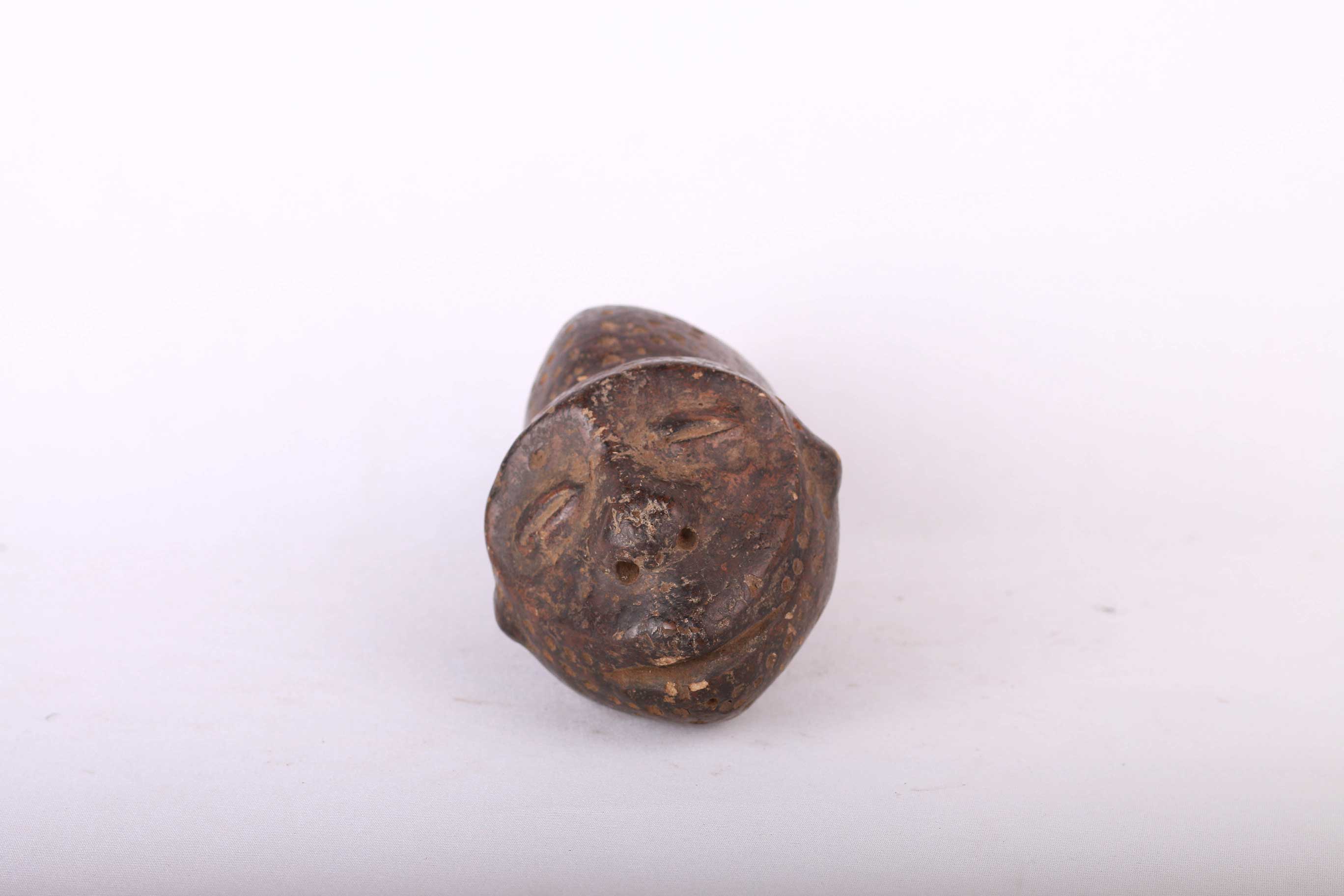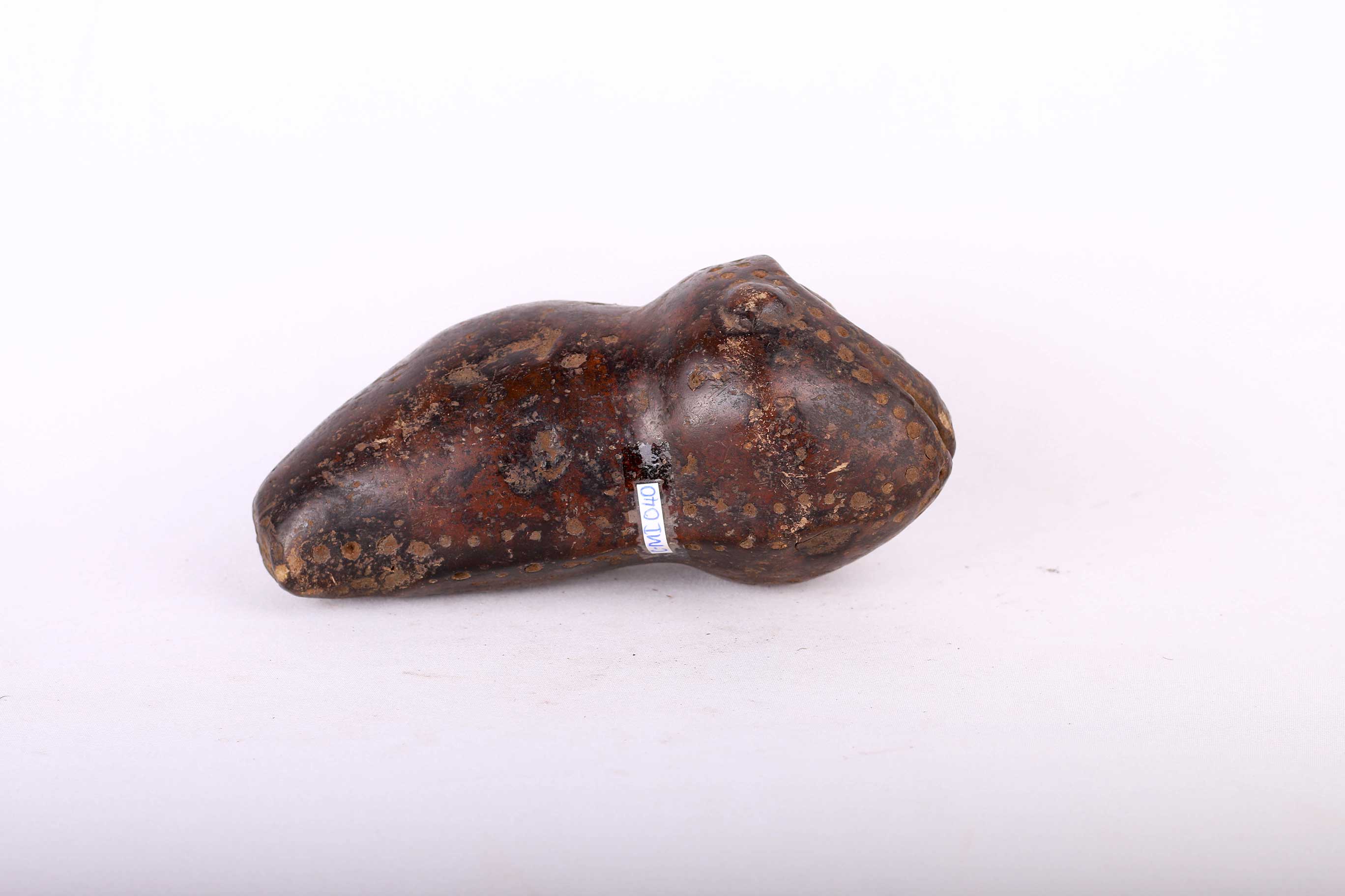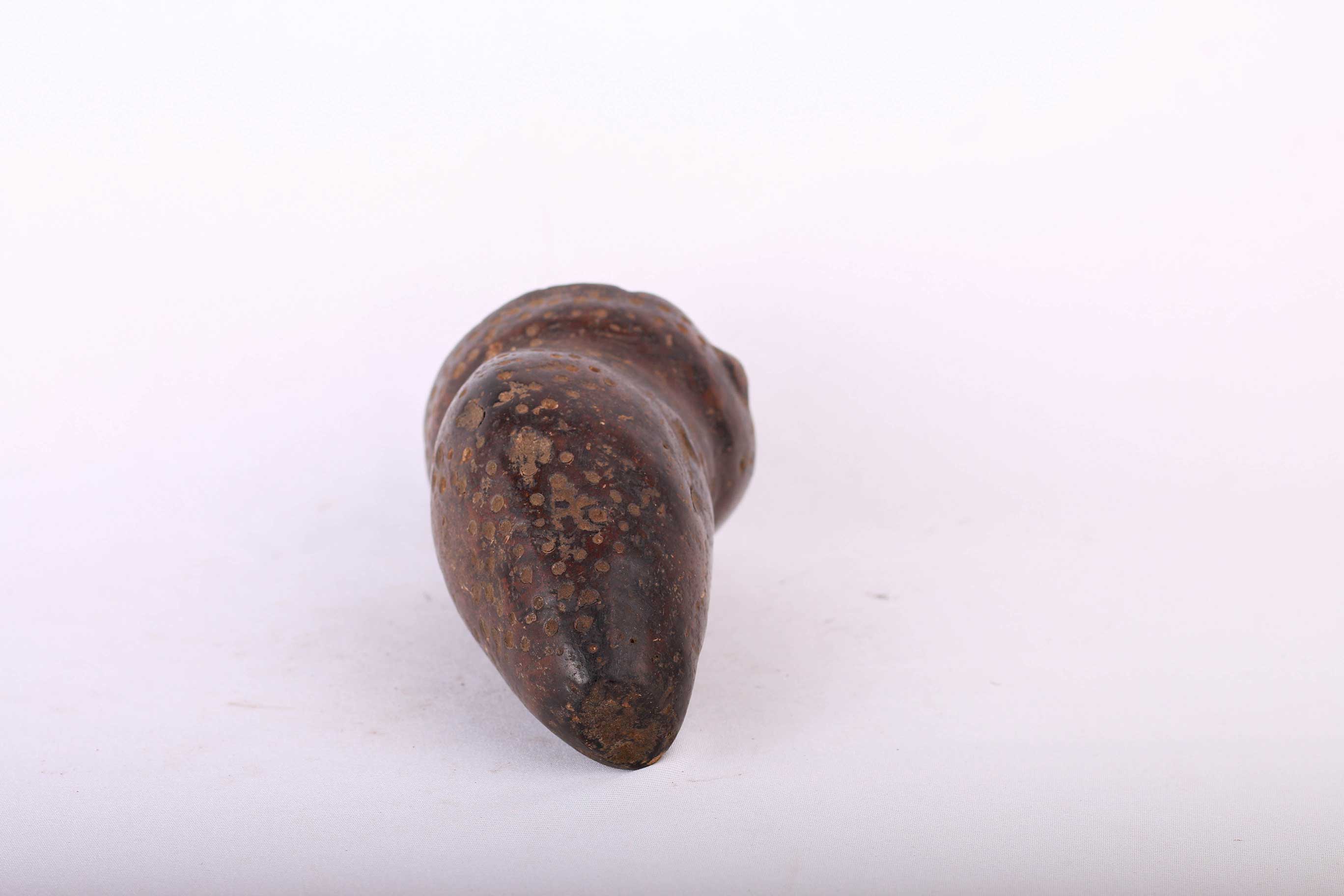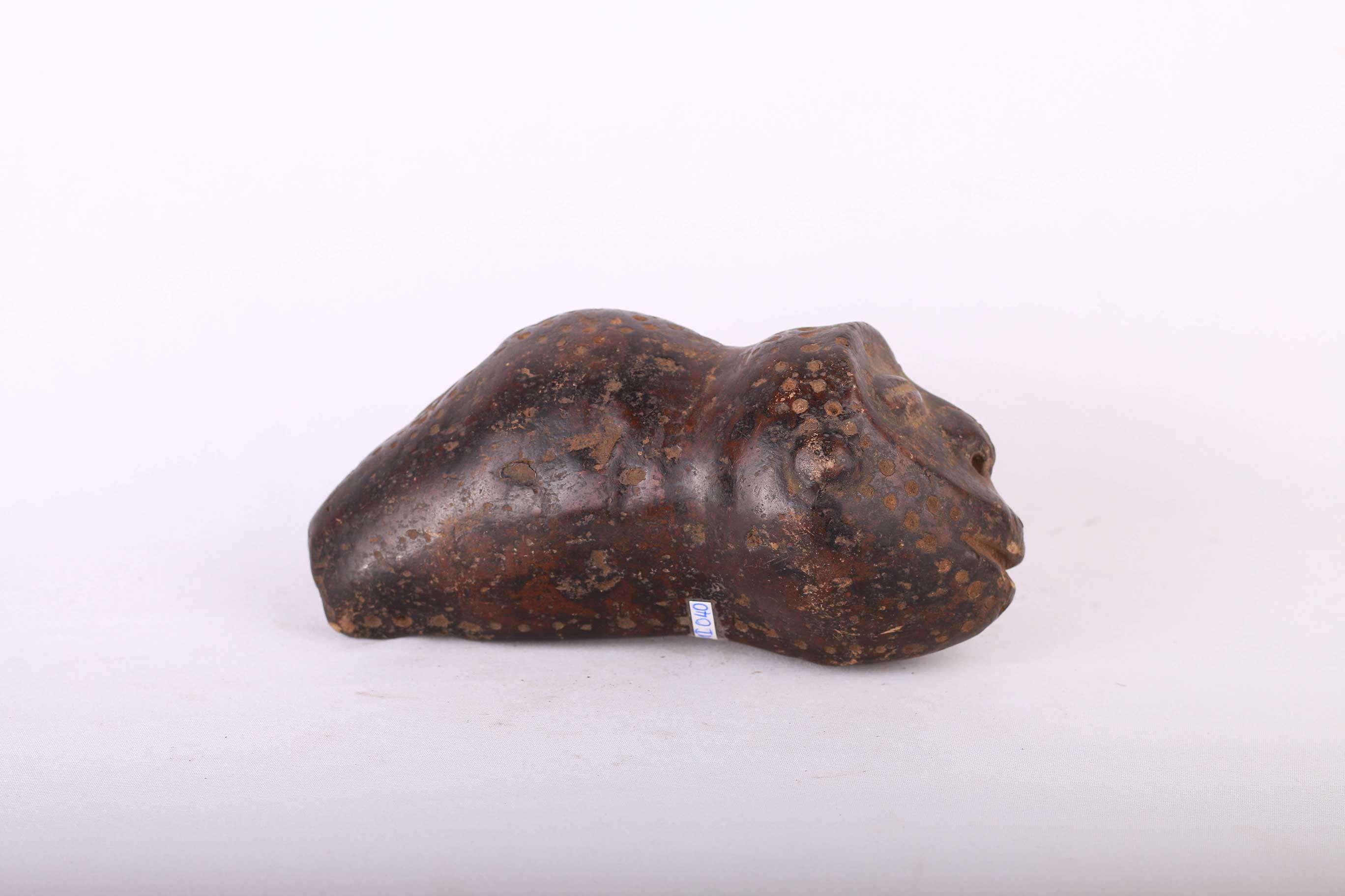 zoomorphic items were used in bwami, carved from wood, ivory, elephant bone, clay, there are hundreds of found object types displayed alongside ivory in initiation. Some zoomorphic sculptures, mostly quadrupeds are carved in an ambiguous form rendering them nearly impossible to identify. Zoomorphic forms are emblems used in initiation, individuals of lower grade may own them unless they are made of ivory. In other regions they are owned by the preceptor, in some regions of the Lega country, all of the above variations of ownership are possible. These stylized figures called Mugugunda have prescribed a name during the ritual that does not necessarily correspond with the sculptural form. This is an old clay statue with a black patina and it shows signs of age.