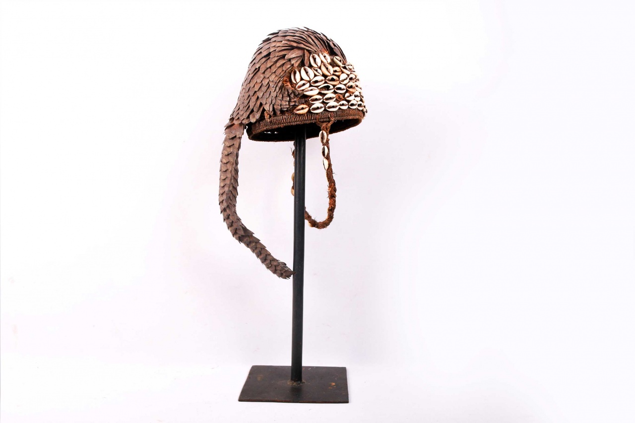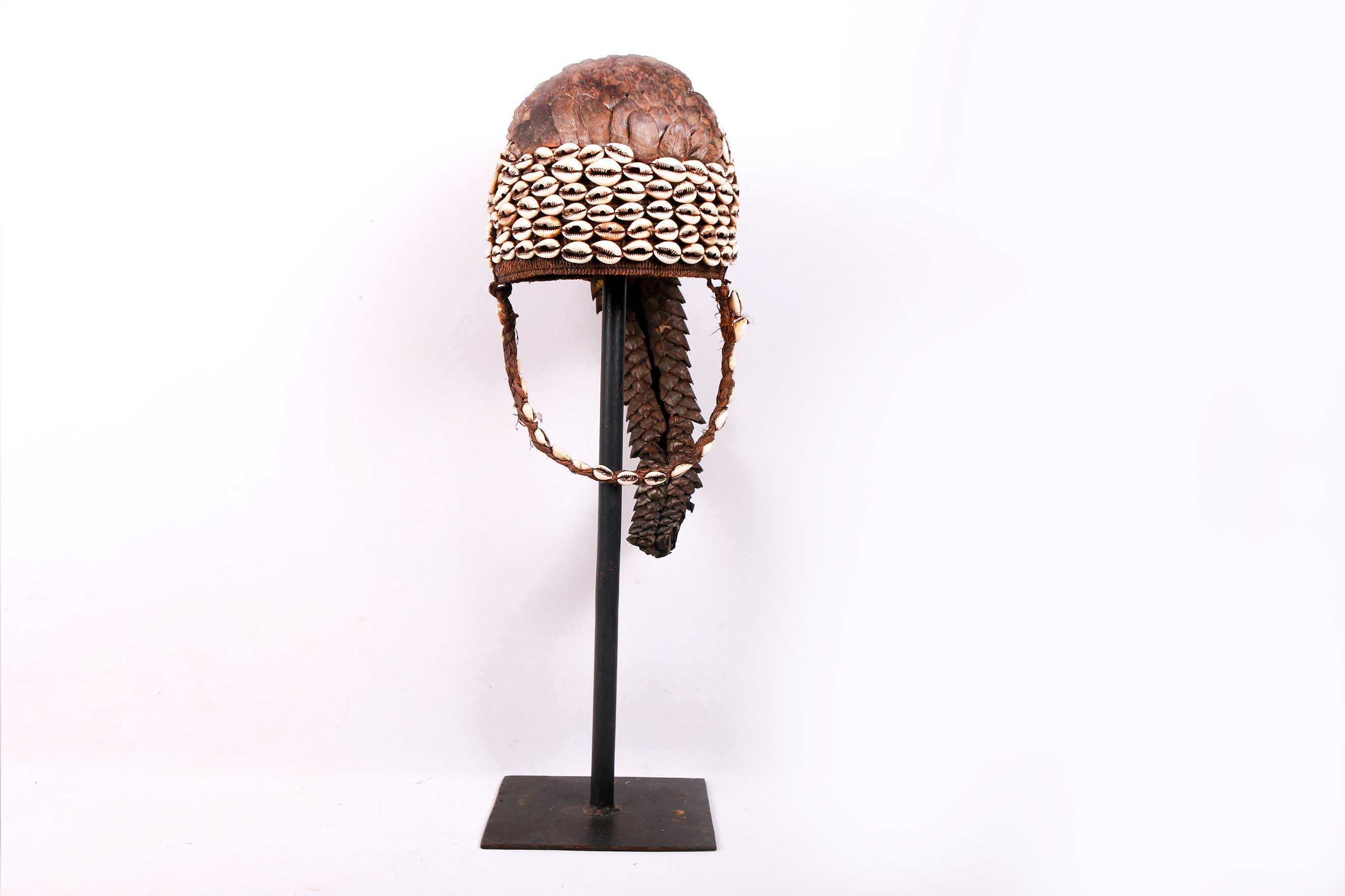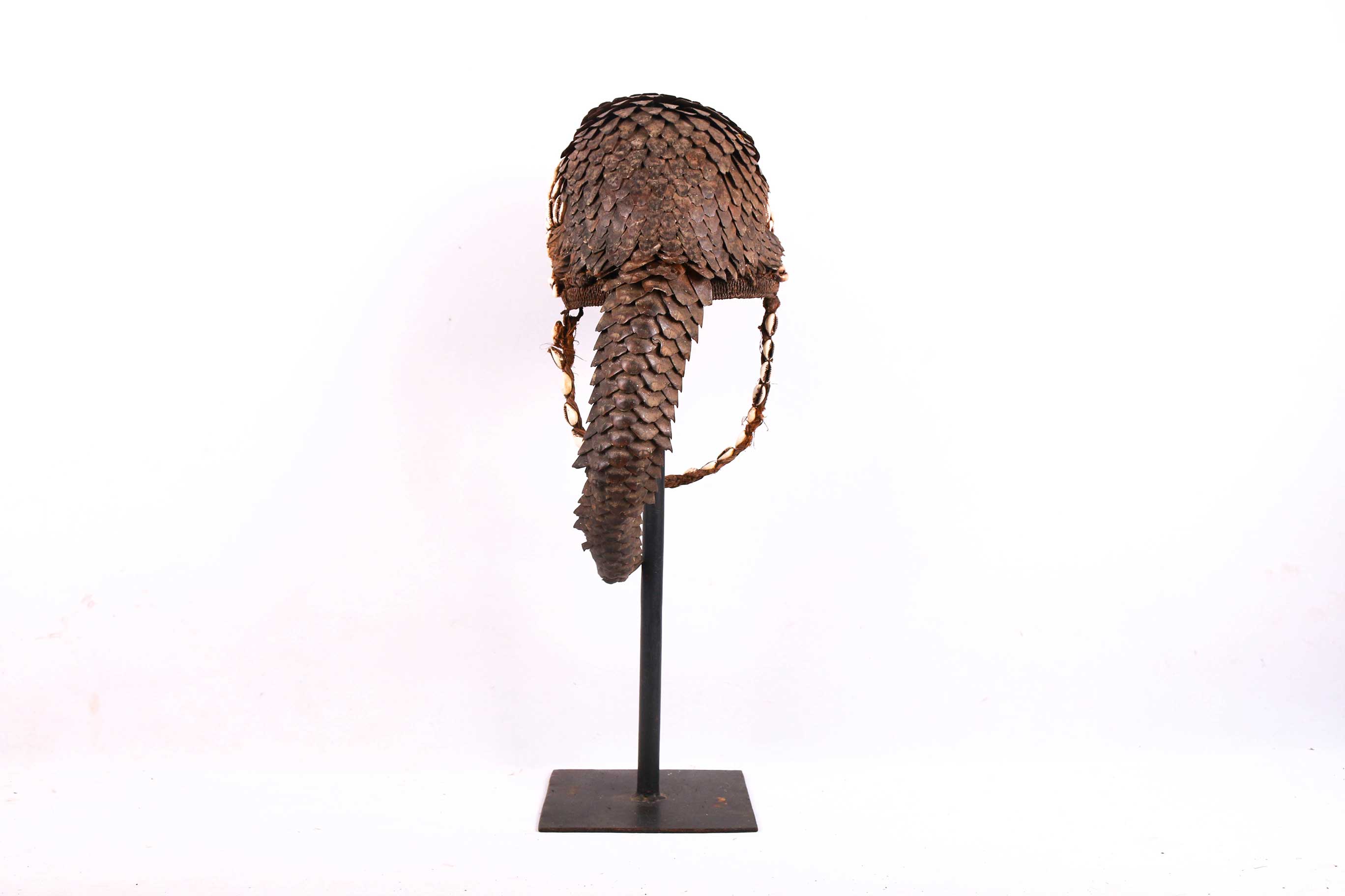 The hat was made in a solid cone form with crossed plant fiber woven together with plant material probably grass both on the outer and inner surface. On the solid cone form, is attached scales and the entire tail from a pangolin. The scales and tail appear to have been sewn on to the hat through round holes. The strap is made from braided vegetable fiber decorated with cowrie shells. This is an old piece with visible signs of age and good usage.