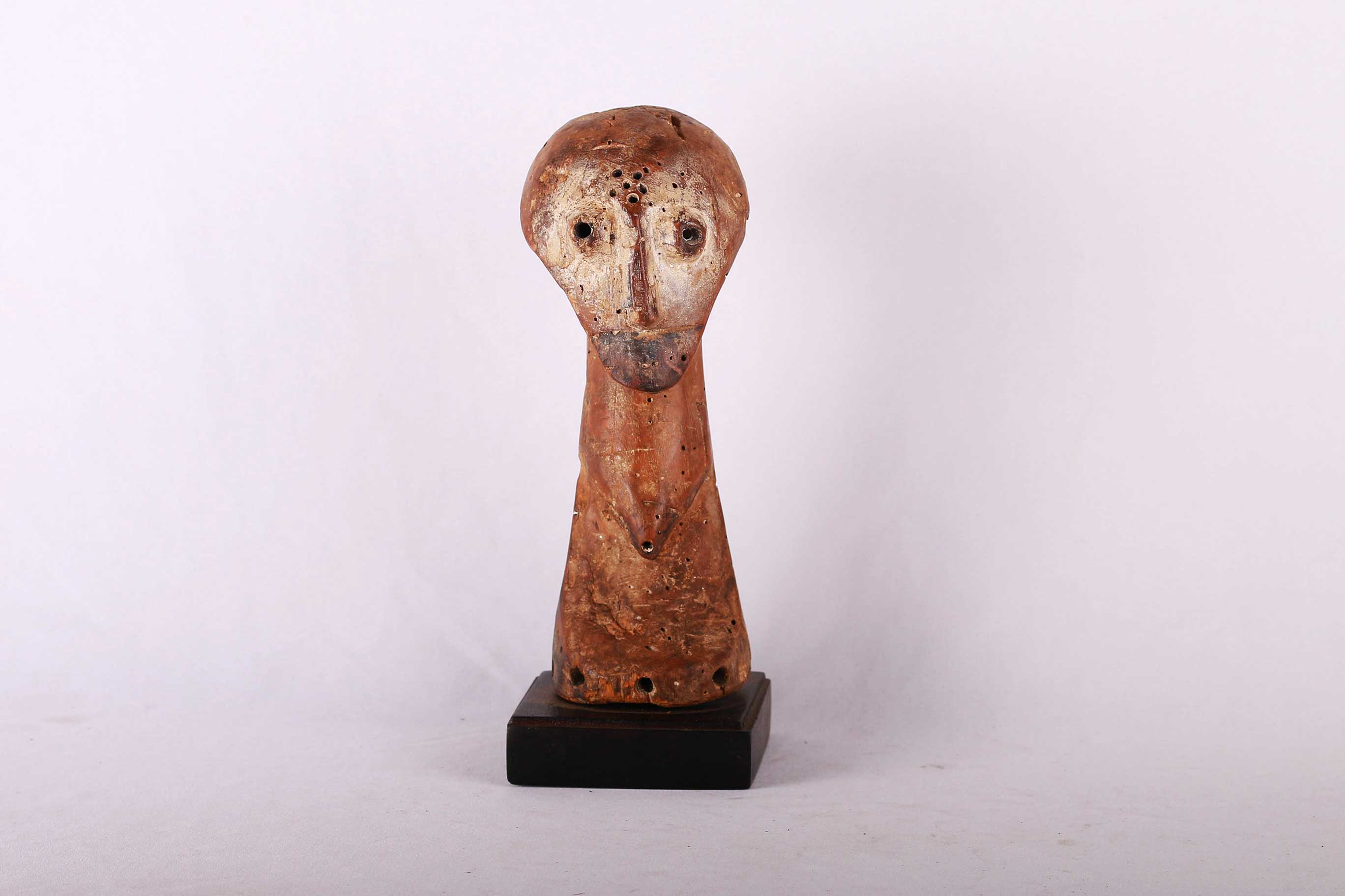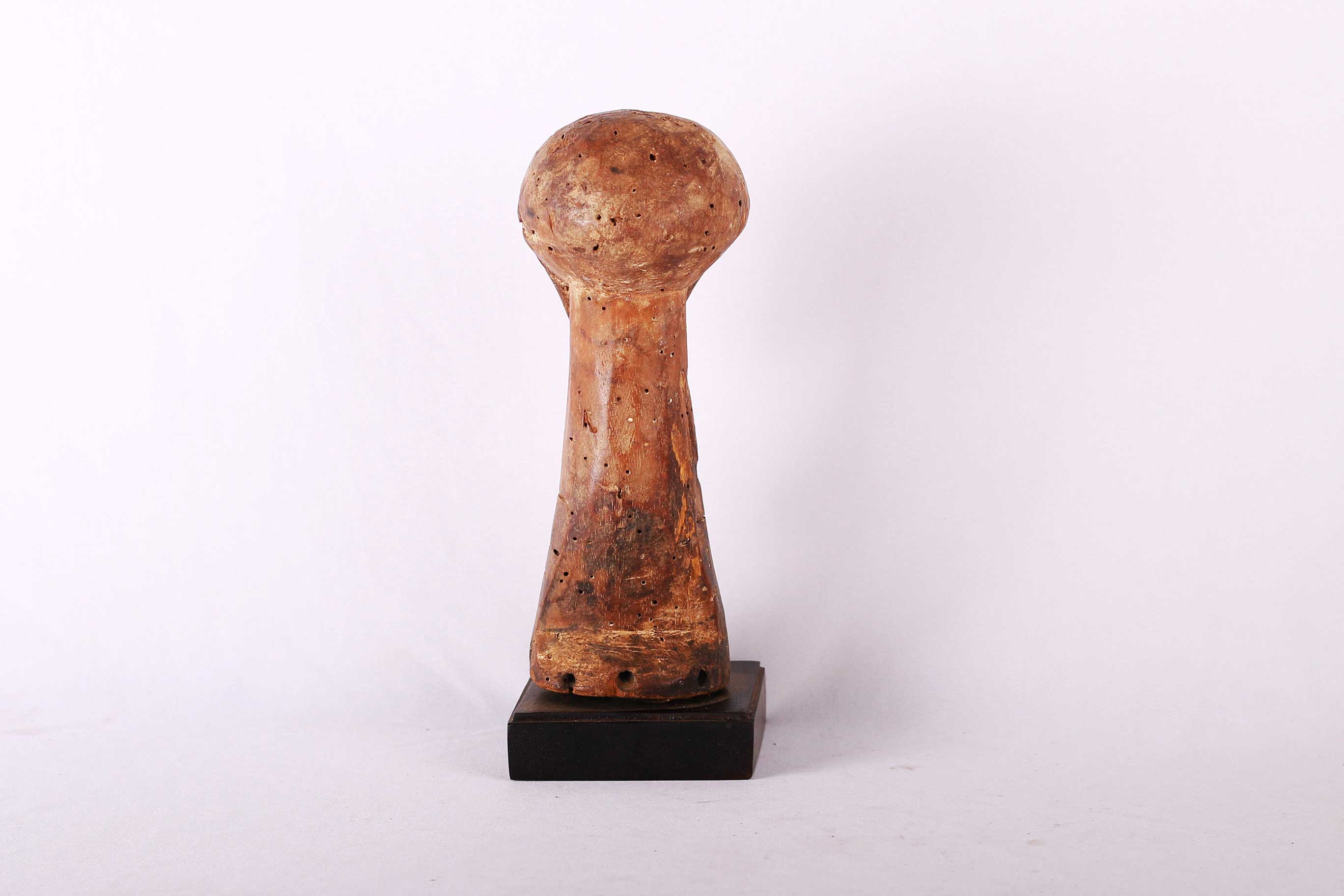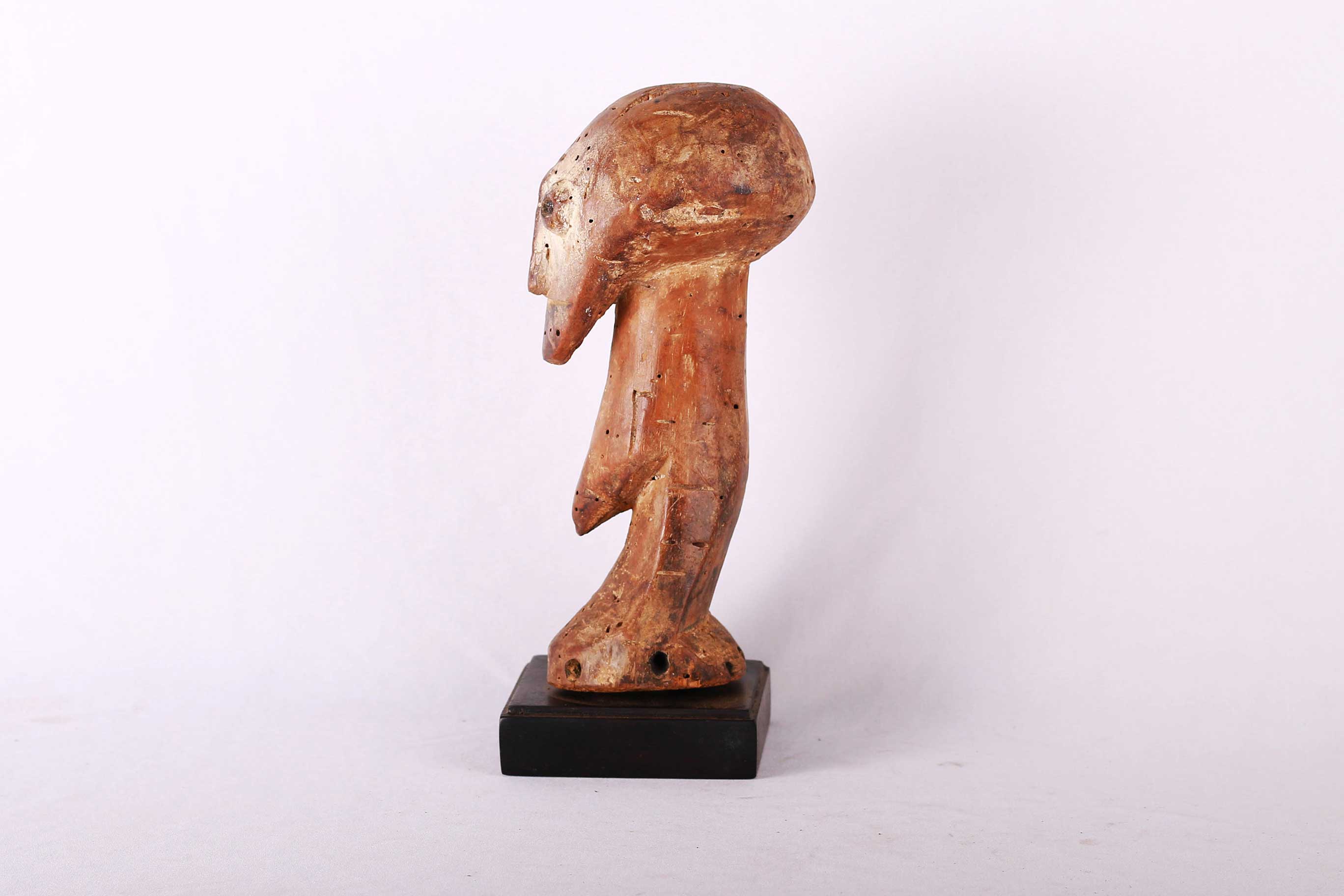 The Lega inhabit the eastern Democratic Republic of Congo, between the great lakes and the Lualaba River. These sculptures were individually owned by the highest-ranking society members like chiefs, kings and village heads though they mostly owned ivory statues. These sculptures were artistically unique, designed to please patrons with symbols that represented the patron’s moral qualities. The following is carved in 100% wood and has a shiny brown patina and shows signs of age and usage.