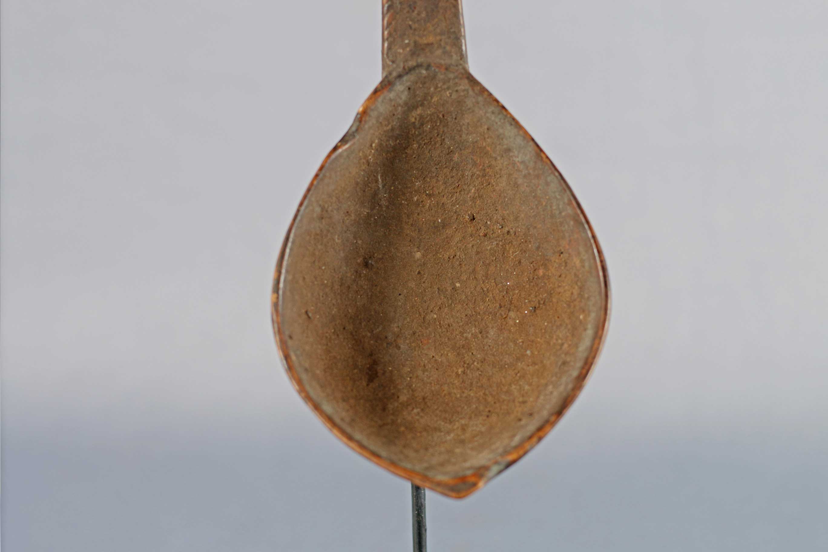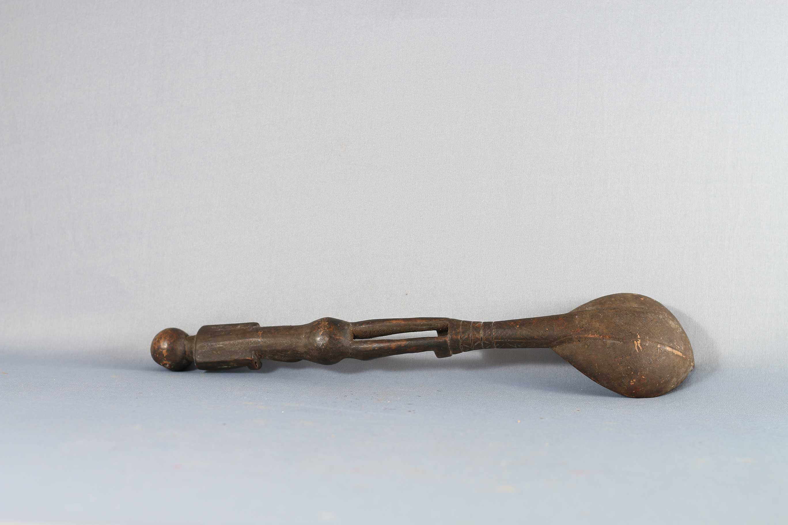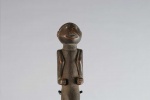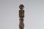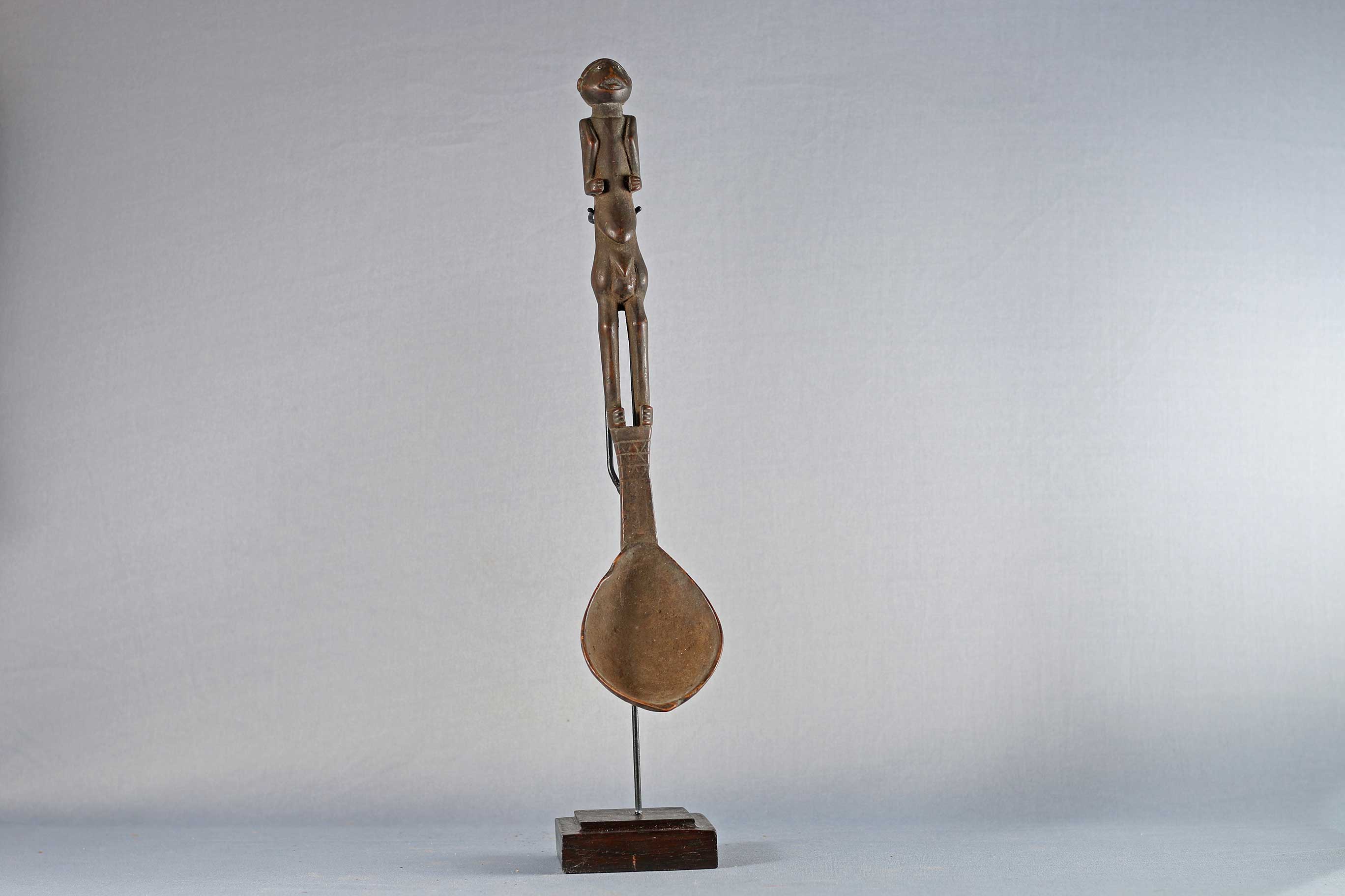 The Lega is an ethnic group found in the Democratic Republic of Congo. The Lega tribe art is created for primarily their semisecret associations of men and women, such as the Bwami society of the Lega peoples. The teachings of Bwami are a cornerstone of all aspects of life, guiding the moral development of the individual and governing relations with others. Bwami doctrine is represented by wood and ivory masks, heads, and small figures, all of which play a vital role during initiation into the society’s highest grades. These were highly prestigious utilitarian items among the Lega people of Congo. Such small sculptures were displayed at the final phase of initiation into the Bwami society. Whether in the form of human figures, heads, or tools such as spoons, knives, hammers, and billhooks, they represent the proverbs through which Bwami ideals are taught. This sculpture has a human figure at one end and a spoon at the other end, it has a shiny brown patina and shows visible signs of old age.