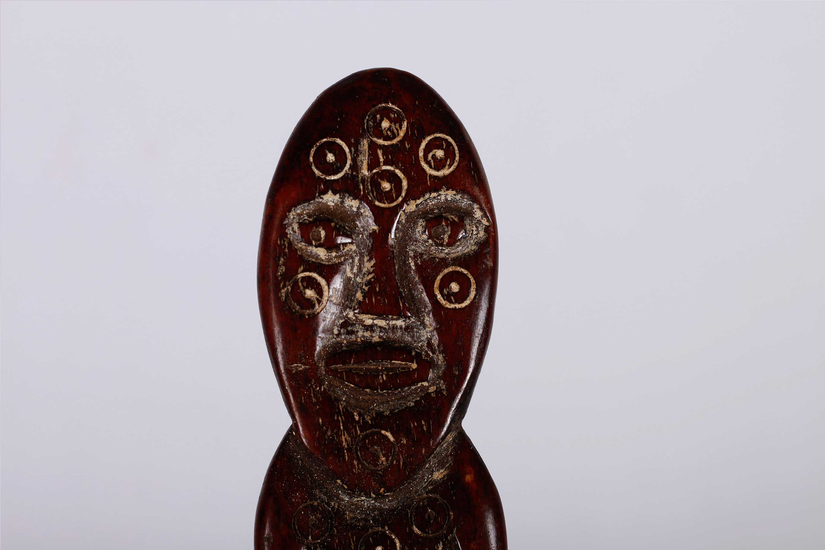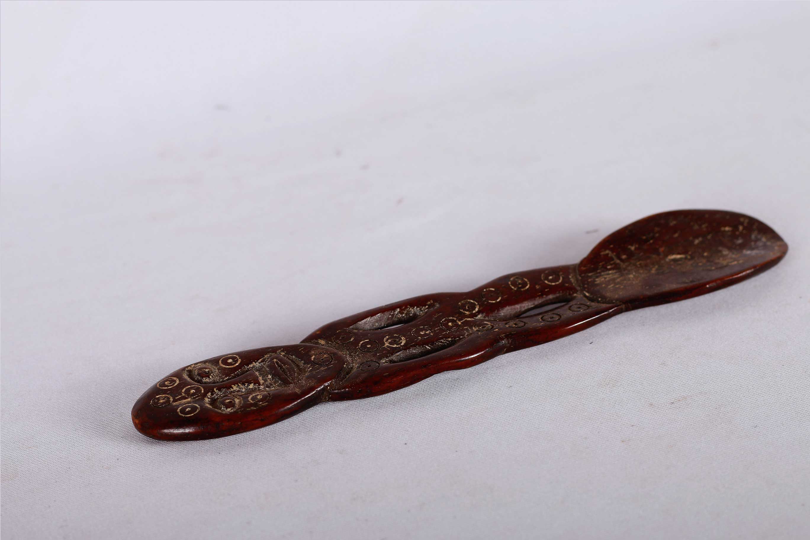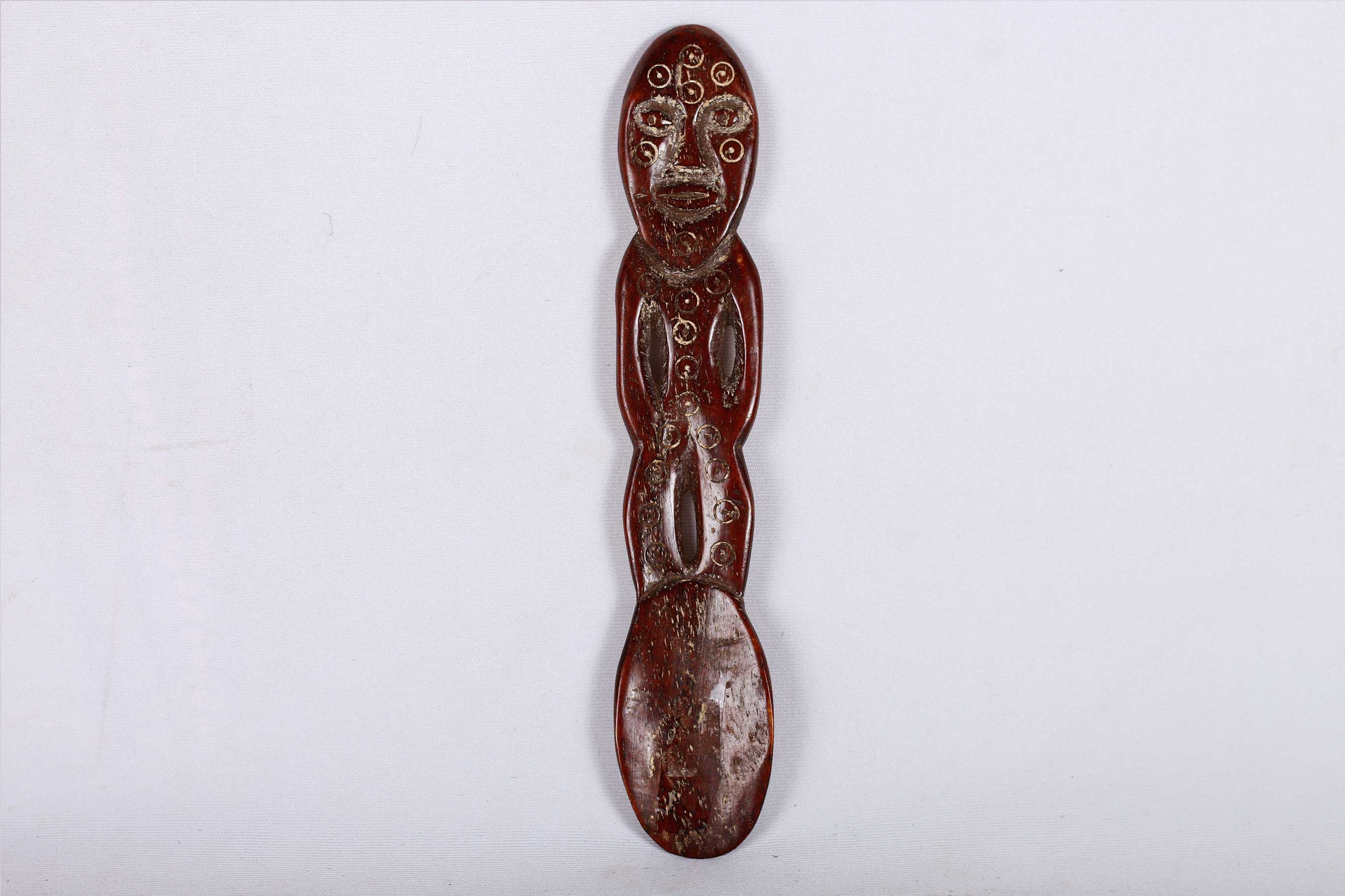 The Lega is found in the virgin forest of eastern DRC, between the great lakes and the Lualaba River, next to Luba people. These small figures were displayed at the final phase of initiation into the Bwami society. Whether in the form of human figures, heads, or tools such as spoons, knives, hammers, and billhooks, they represent the proverbs through which Bwami ideals are taught. Lega spoons were known as “Kakuli”.Spoons were symbols of lineage continuity. The following spoon was crafted out of an elephant hoof and looks visibly old.