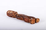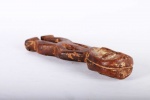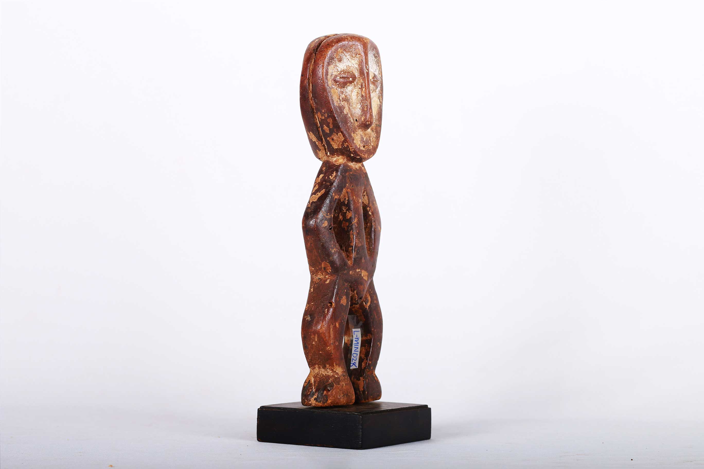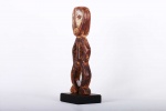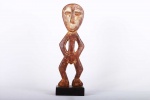 The Lega inhabit the eastern Democratic Republic of Congo, between the great lakes and the Lualaba River. These sculptures were individually owned by the highest-ranking society members like chiefs, kings and village heads though they mostly owned ivory statues. Lega figures symbolically conveyed particular moral qualities or defects that are expressed through dance and sung aphorisms in initiations to the highest grades of the association. This is a fine small flat Lega statue with traces of kaolin around the facial area, bent hands sculpted on the waist area, legs facing opposite each other and a worn-out brown patina, it looks old and reflects shows signs repeated good usage.
