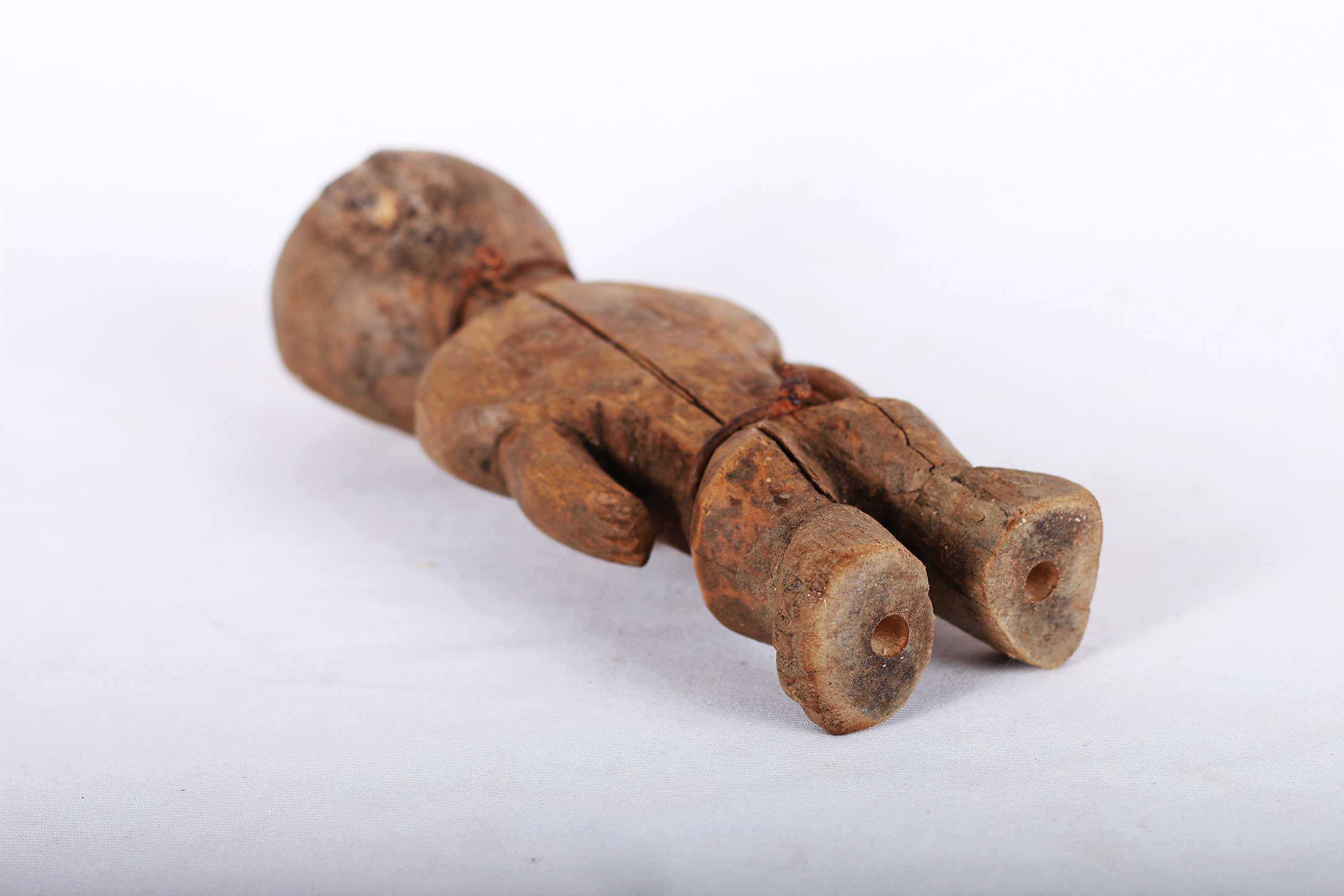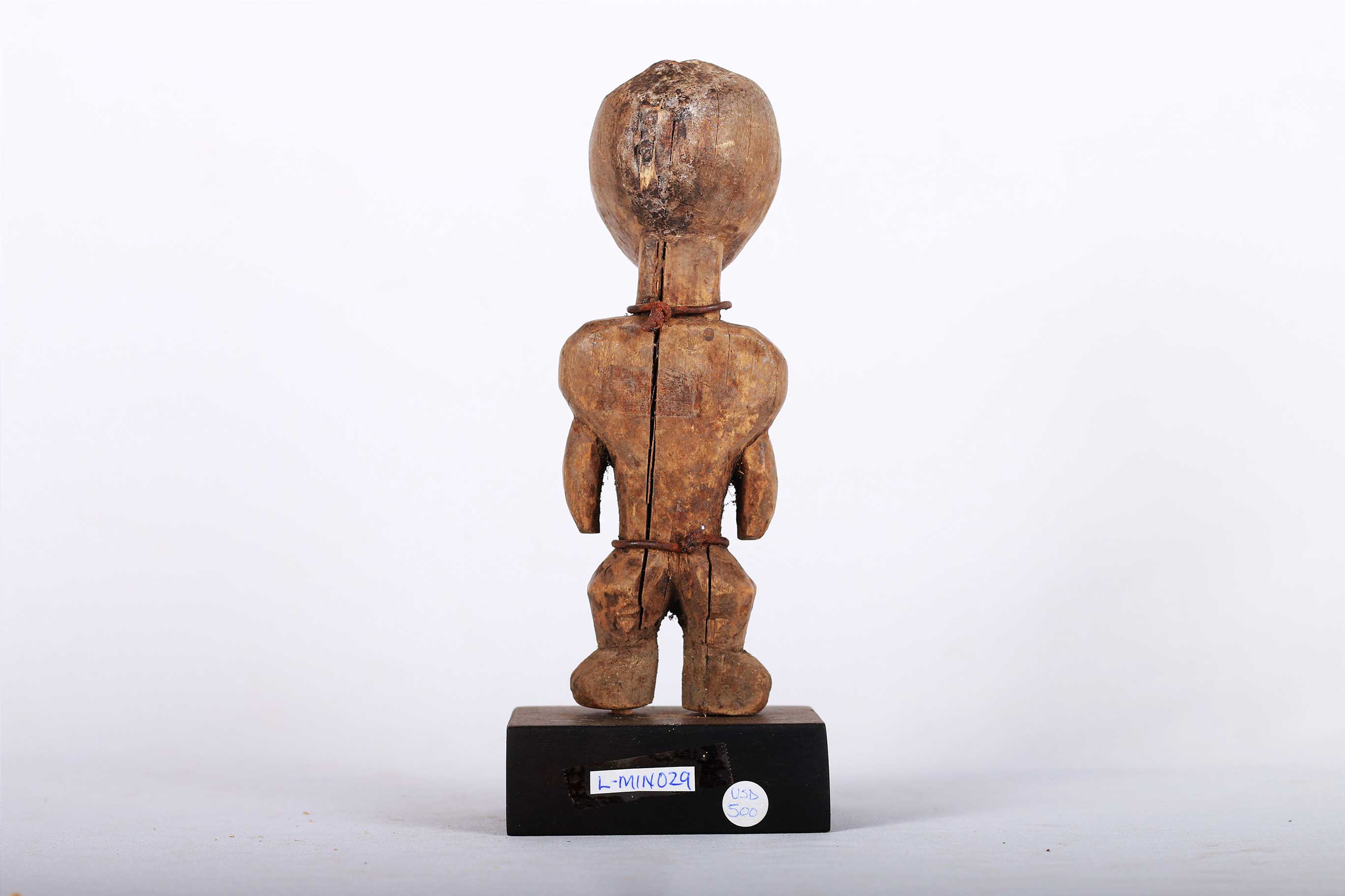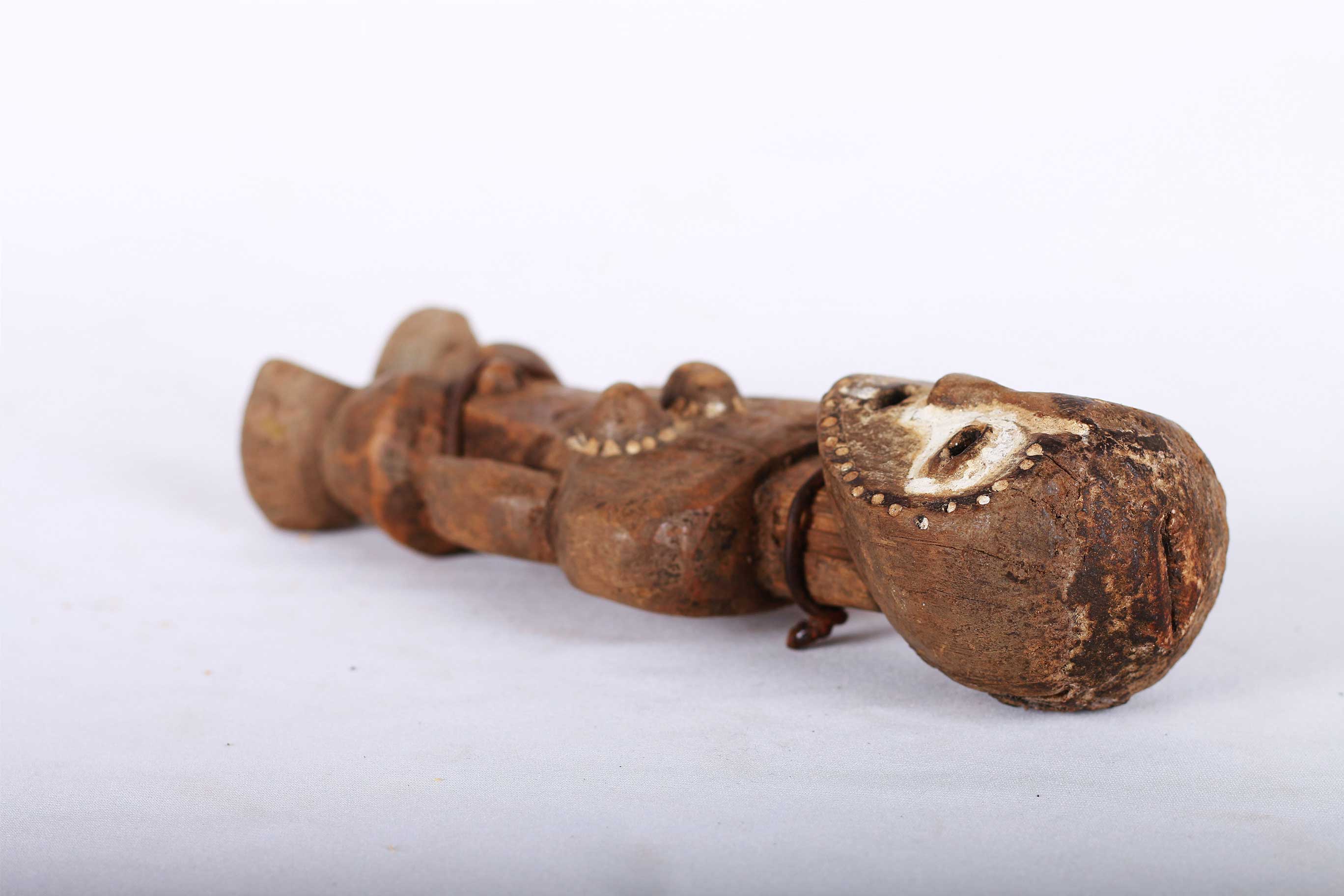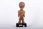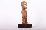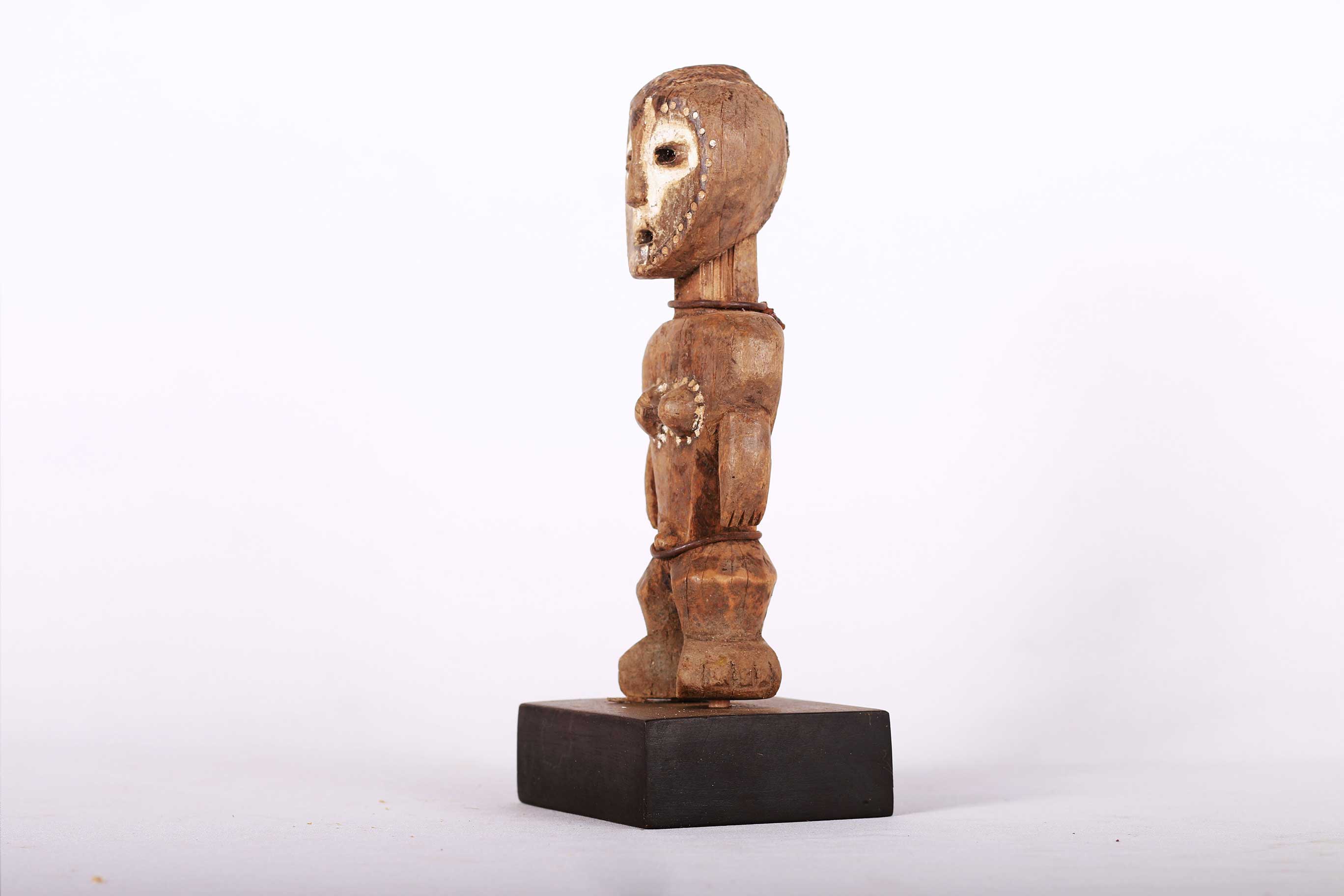 The Lega inhabit the eastern Democratic Republic of Congo, between the great lakes and the Lualaba River. These sculptures were individually owned by the highest-ranking society members like chiefs, kings and village heads though they mostly owned ivory statues. Lega figures symbolically conveyed particular moral qualities or defects that are expressed through dance and sung aphorisms in initiations to the highest grades of the association. This is a fine female Lega statue with kaolin around the facial area, decorations of kaolin spots around the breasts, metallic circular ring around the waist and neck and a brown patina, the sculpture shows signs of age and good usage.
