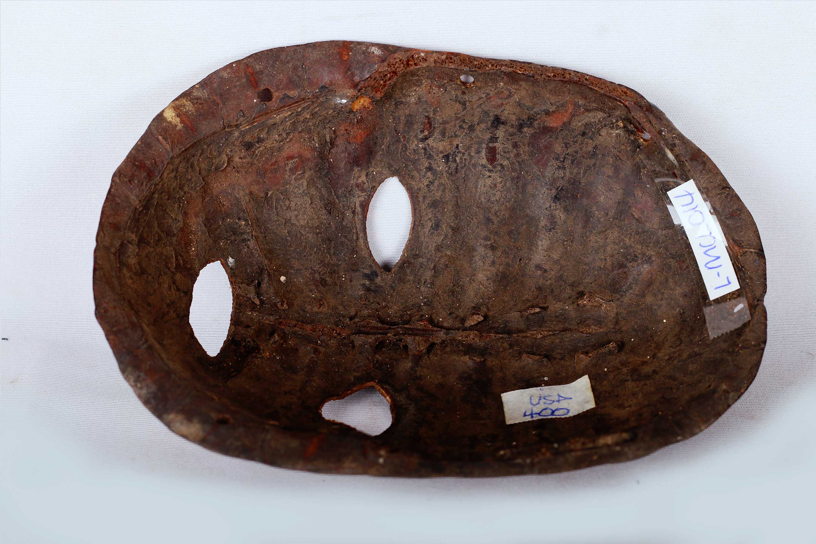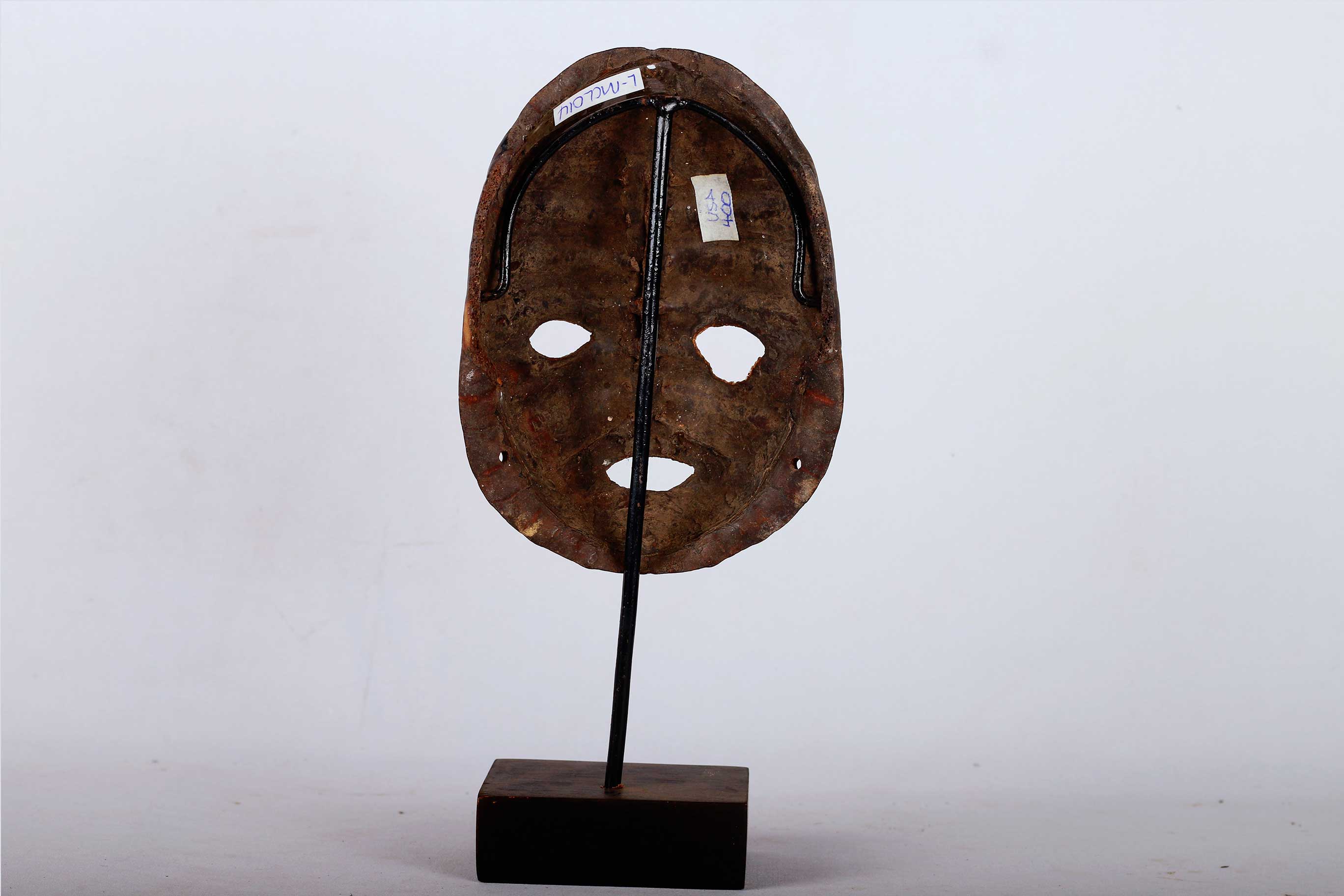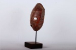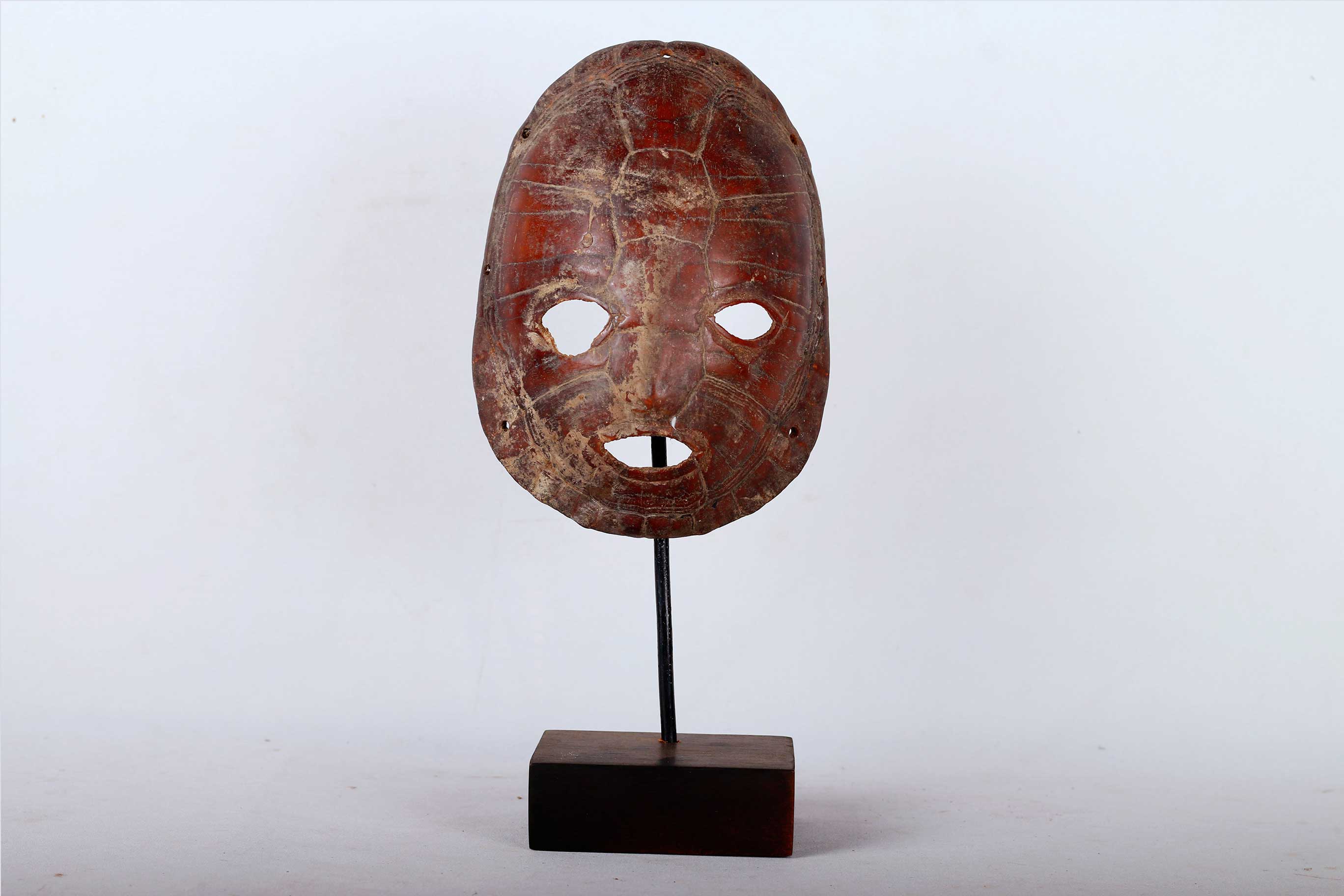 The Lega is found in the virgin forest of eastern DRC, between the great lakes and the Lualaba River, next to Luba people. This is an old Lega mask that was carved from turtle shell it shows wear and tear and has a nice patina. The Lega admire turtles which they commonly refer to as Nkulu for their slow and cautious movements. They also believe that they are smart. During ceremonies, turtles are represented with sculptures or with a shell. They symbolize the wisdom of the older senior members of the Bwami.